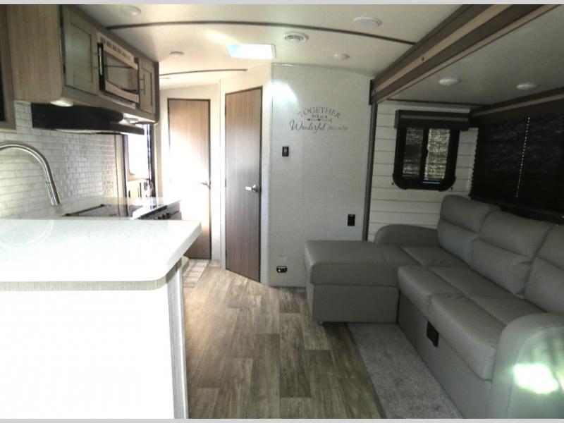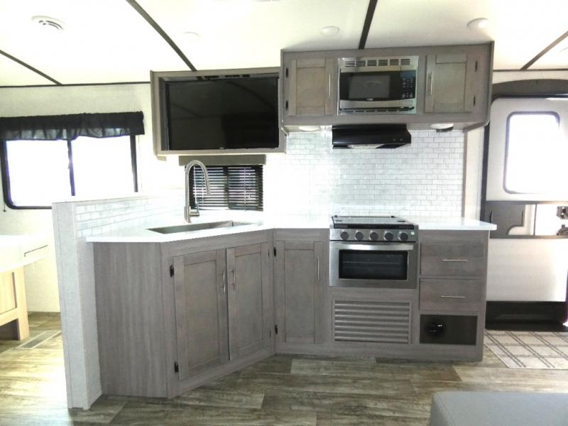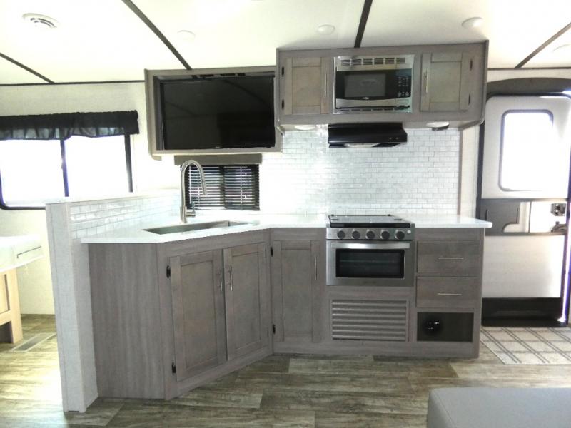 The lightweight Sunset Trail travel trailers by CrossRoads RV include EZ lube axles, laminated sidewalls, secure stance entry steps, plus an exterior convenience center to make each camping trip enjoyable. The gas oven, stainless steel microwave, and refrigerator allow you to cook and store food during your trip to the lake, and the stainless steel farmhouse sink will make clean-up a breeze. These models feature solid wood drawer construction and LED lights for an open and bright living space.