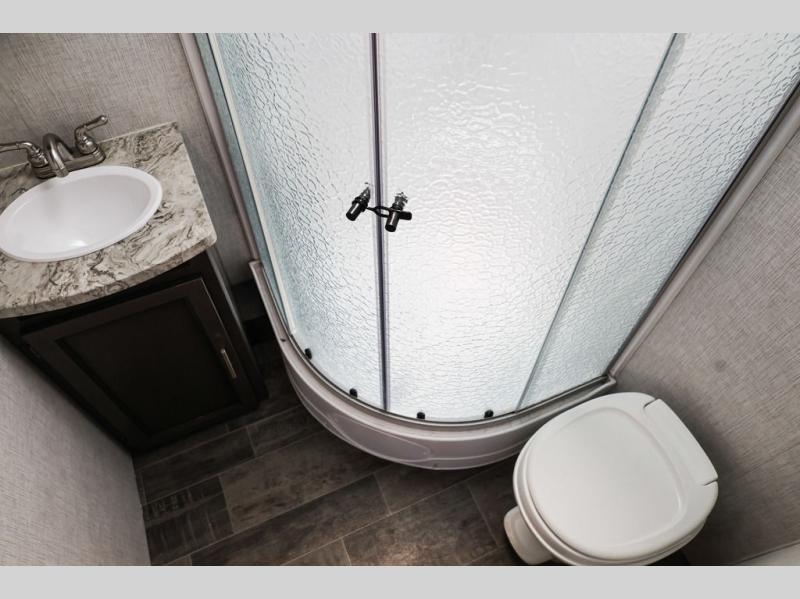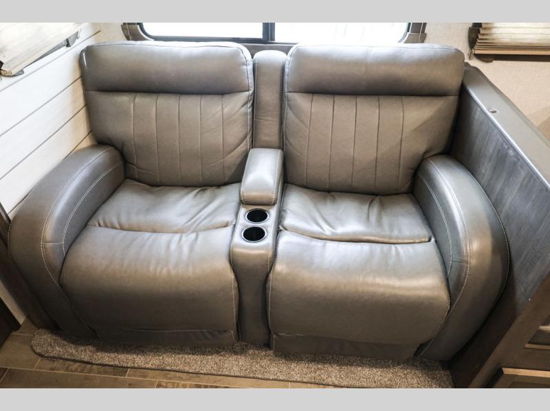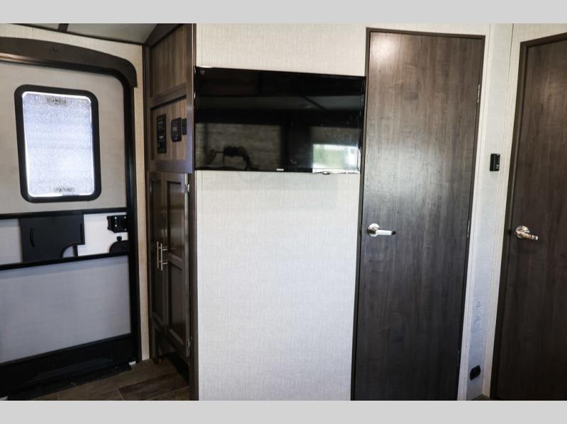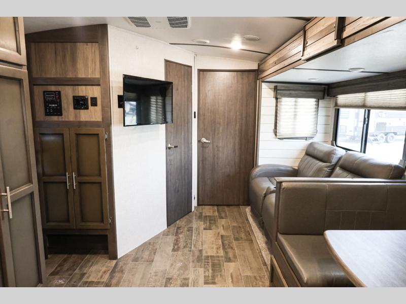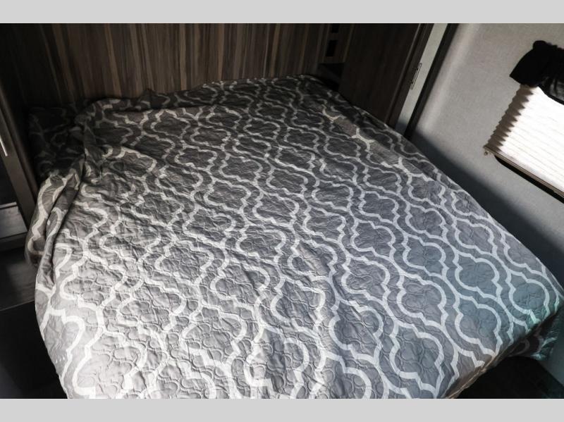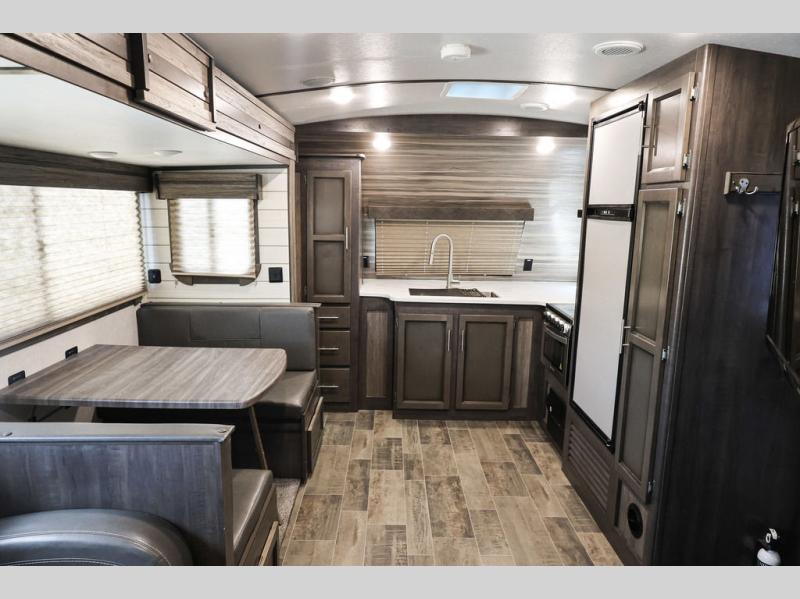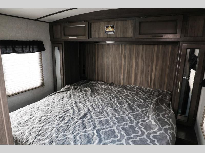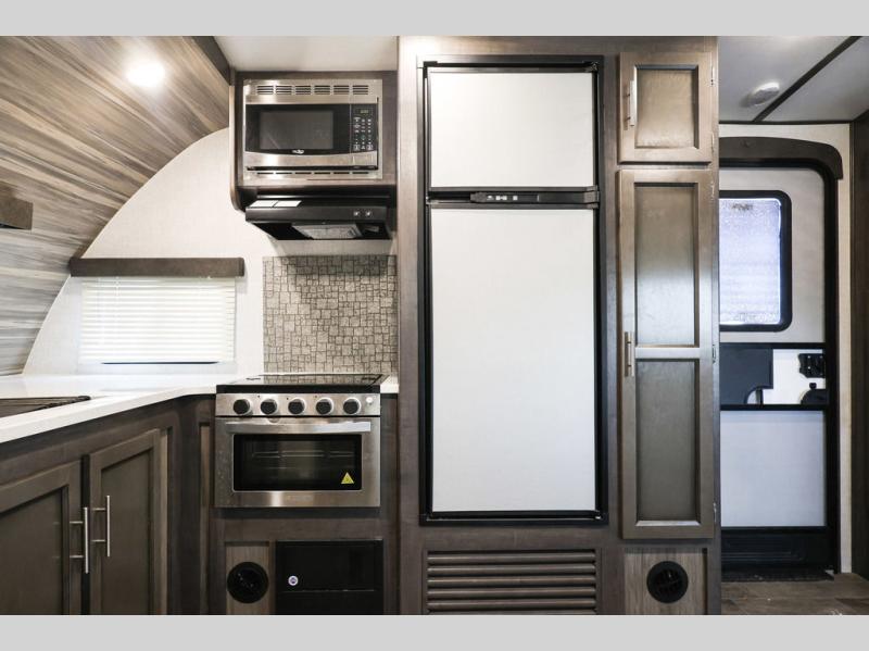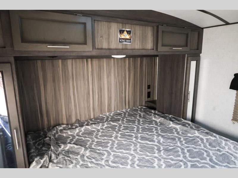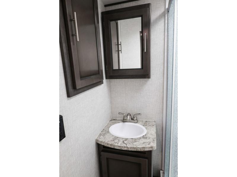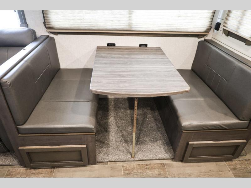 Pack your bags and head to the lake in this spacious travel trailer. Once you arrive you can prepare a quick lunch on the glass top range or use the convenient stainless steel microwave. Take a look around the campground or find a trail or two, and when you return you can freshen up in the full bath. The XL booth dinette provides a place to dine and two can comfortably sleep here. You'll also find a tri-fold sofa or you can choose optional theater seating if you're not needing the extra sleeping space. Mom and dad will enjoy the rear private bedroom with its king bed, dual wardrobes, plus a shoe storage and pet station for convenience.