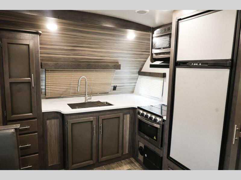 The lightweight Sunset Trail travel trailers by CrossRoads RV include EZ lube axles, laminated sidewalls, secure stance entry steps, plus an exterior convenience center to make each camping trip enjoyable. The gas oven, stainless steel microwave, and refrigerator allow you to cook and store food during your trip to the lake, and the stainless steel farmhouse sink will make clean-up a breeze. These models feature solid wood drawer construction and LED lights for an open and bright living space. You can choose to add many convenient options, such as the optional 50 amp electrical service, a second 13,500 BTU A/C, and a free-standing table and chairs in place of the booth dinette!