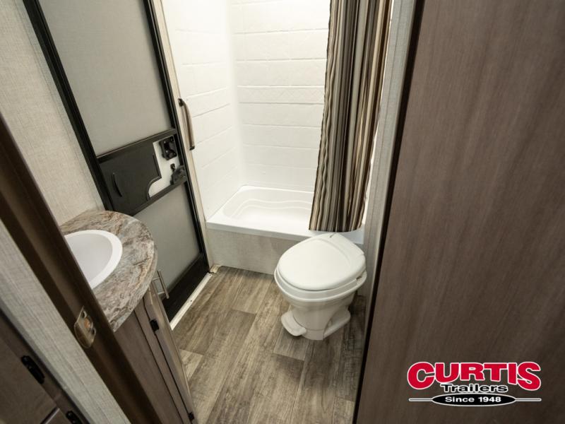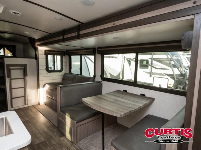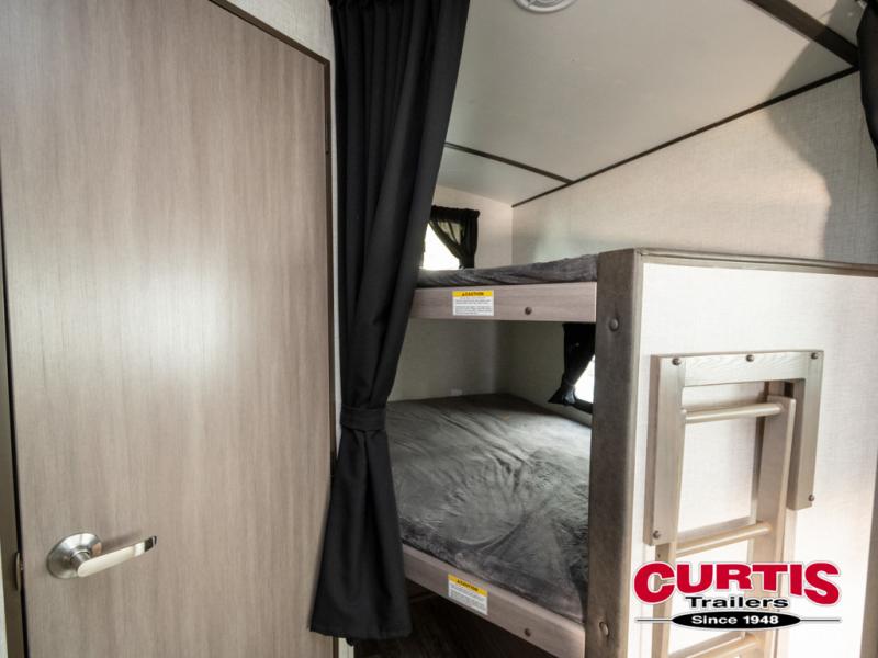 This travel trailer can comfortably sleep ten people each night, so invite the cousins for whole-family fun! The kids are sure to love the double-size bunks, and mom and dad will have their own private bedroom up front with a king bed. Within the large slide out you'll find the XL booth dinette which can sleep two, plus the tri-fold sofa that can be replaced by an optional theater seating if you choose. Whip up dinner in a flash on the glass top range or use the exterior camp kitchen. The full bath includes its own exterior entrance door for convenience, and there is a power awning with LED lights for the perfect outdoor living space!