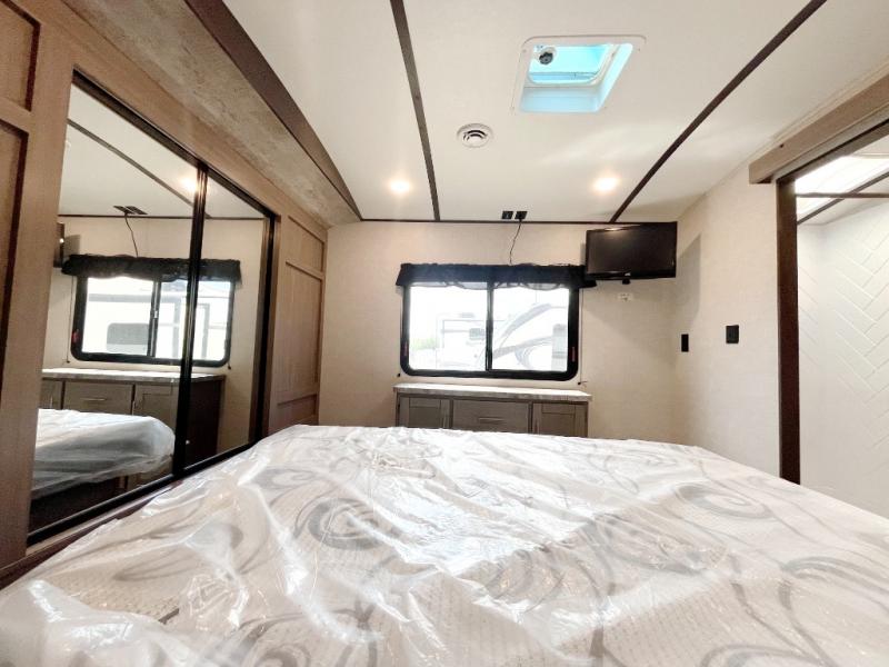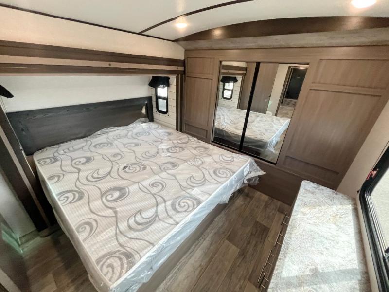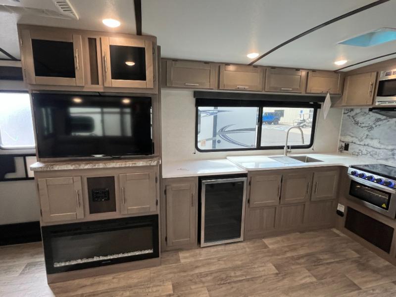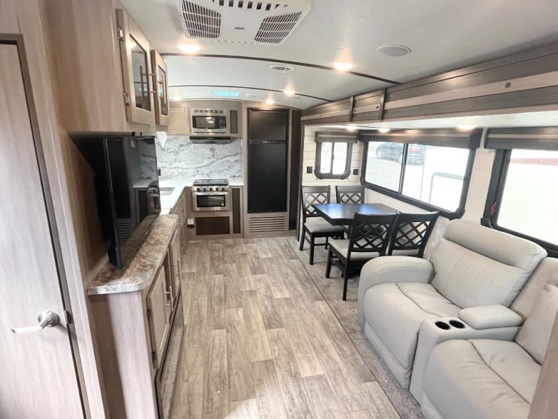 One step inside this travel trailer and you can be sure you've just found your new RV. The large slide out in the main living area will allow the dog to stretch out, and there is a second slide out in the front private bedroom for even more space. The walk-through bath is both spacious and convenient. Your crew can relax on the XL dinette and the standard tri-fold sofa can be replaced with an optional theater seating if you're not needing the additional sleeping space. This model also includes an exterior camp kitchen, plus a power awning with LED lights for the ultimate outdoor living space!