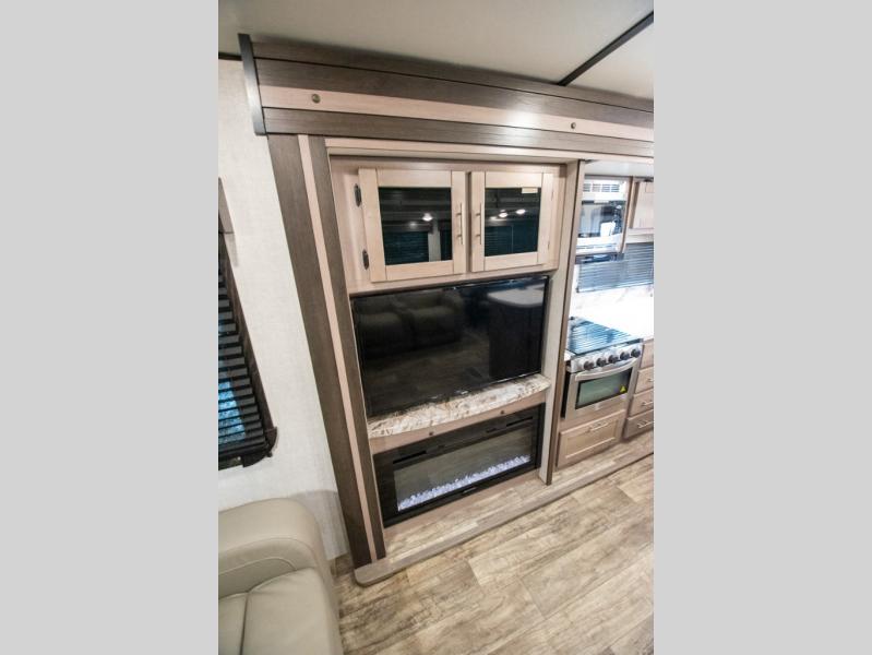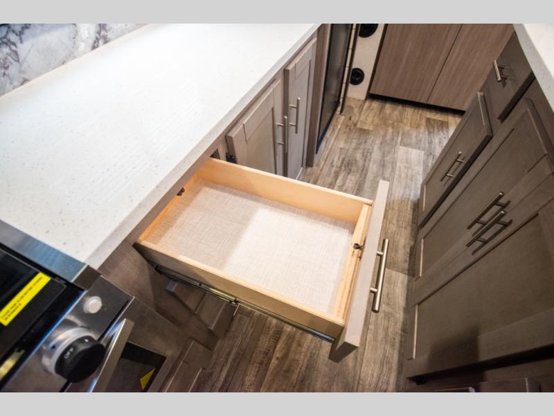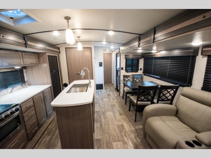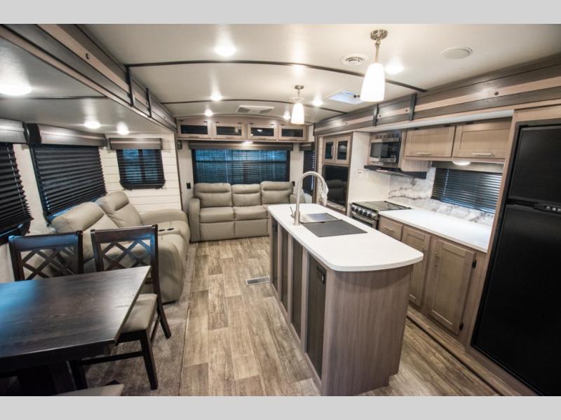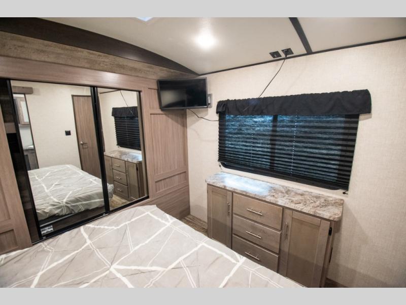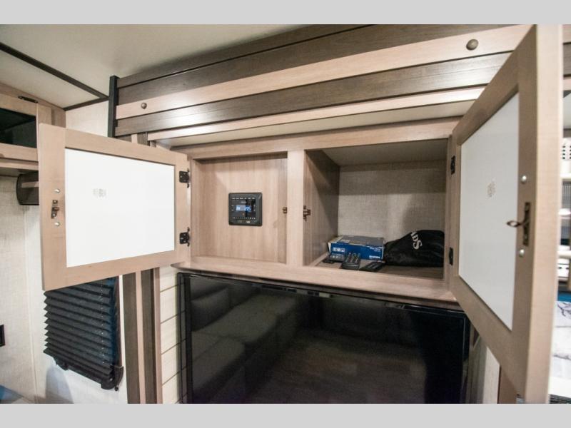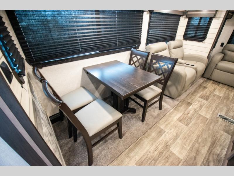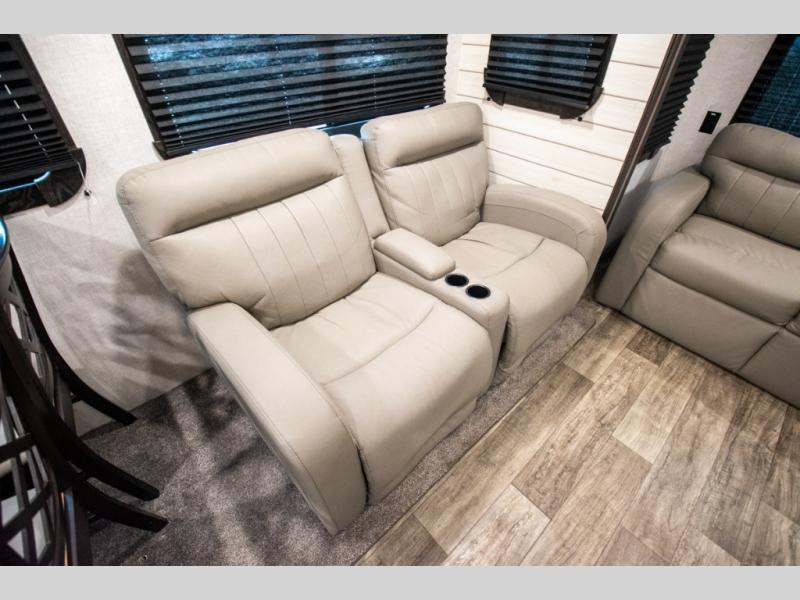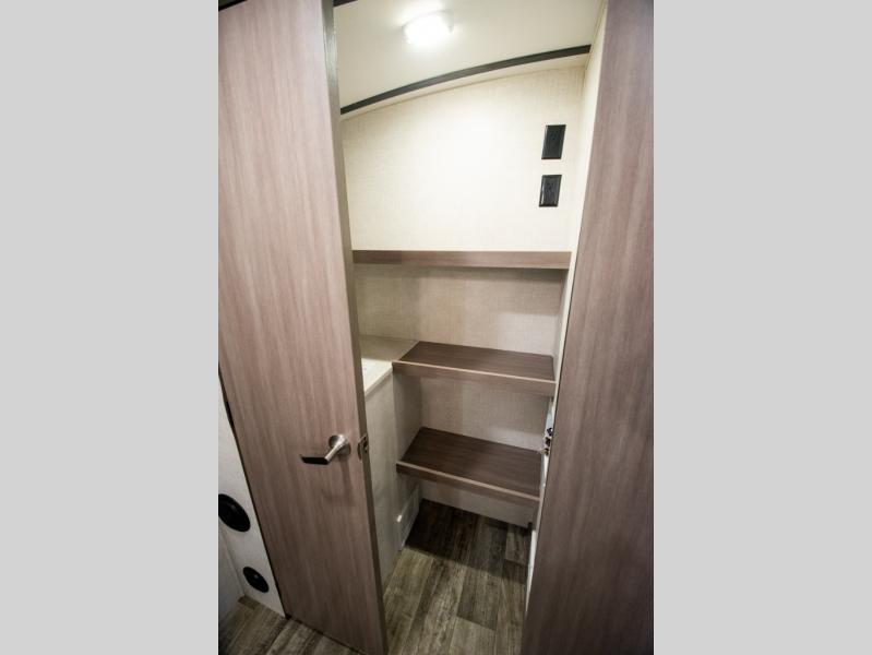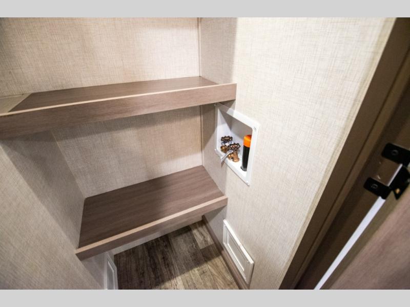 This spacious travel trailer is beaming with luxurious features you are sure to love. The dual opposing slides in the main living area open up the whole space, plus there is a third slide out in the front master suite. The chef of the family will appreciate the kitchen island for additional counter space, and there is a large pantry for all your non-perishables. This space has also been prepped to add an optional washer and dryer if you choose. Your family will find plenty of seating space on the rear 82" tri-fold sofa, the XL booth dinette, and the theater seating. The dual entry bath creates a front master bedroom, and you'll find plenty of storage space here, including a chest of drawers and a large front shelf!