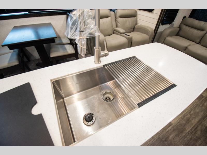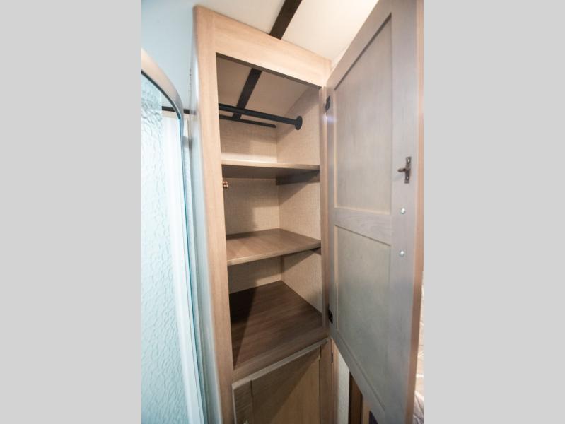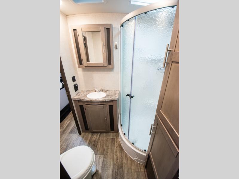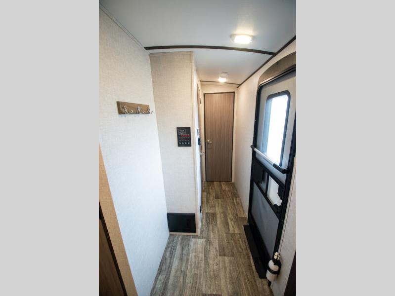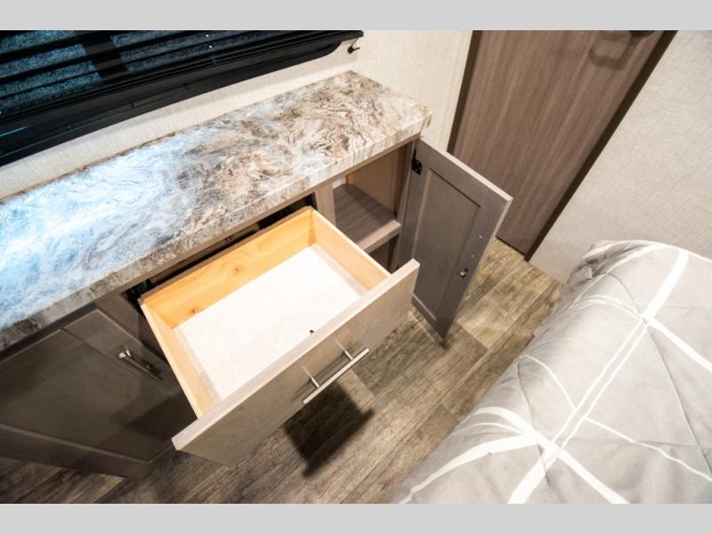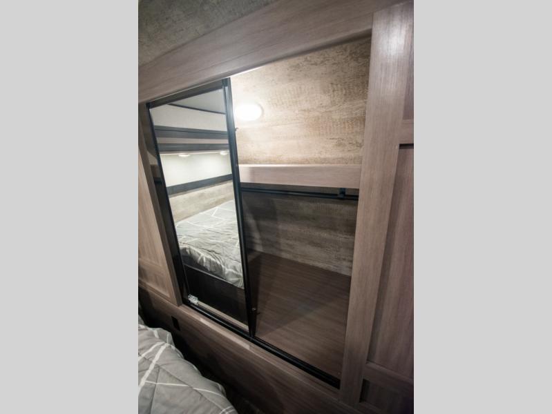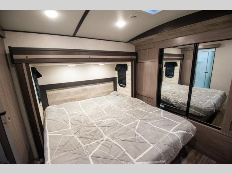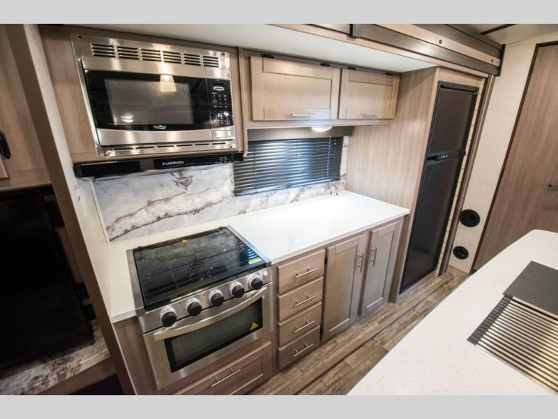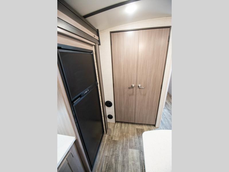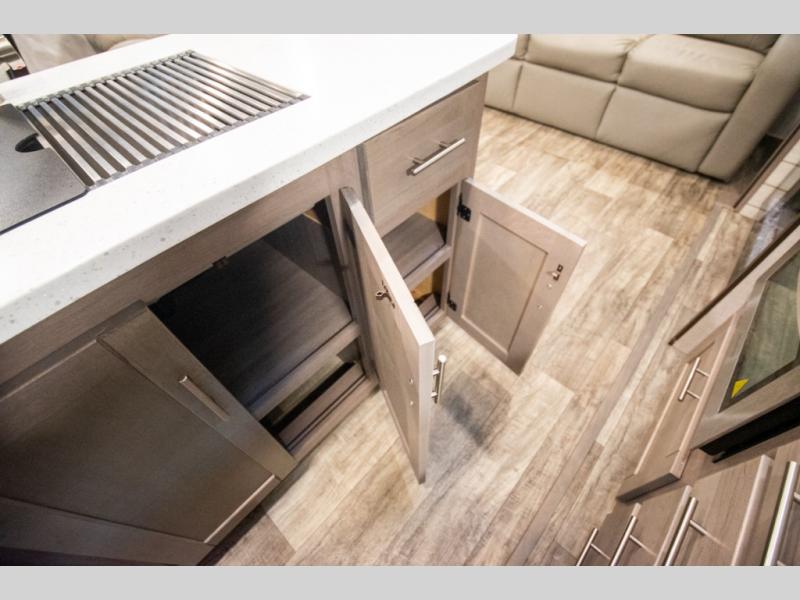 This spacious travel trailer is beaming with luxurious features you are sure to love. The dual opposing slides in the main living area open up the whole space, plus there is a third slide out in the front master suite. The chef of the family will appreciate the kitchen island for additional counter space, and there is a large pantry for all your non-perishables. This space has also been prepped to add an optional washer and dryer if you choose. Your family will find plenty of seating space on the rear 82" tri-fold sofa, the XL booth dinette, and the theater seating. The dual entry bath creates a front master bedroom, and you'll find plenty of storage space here, including a chest of drawers and a large front shelf!