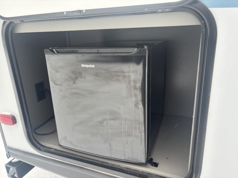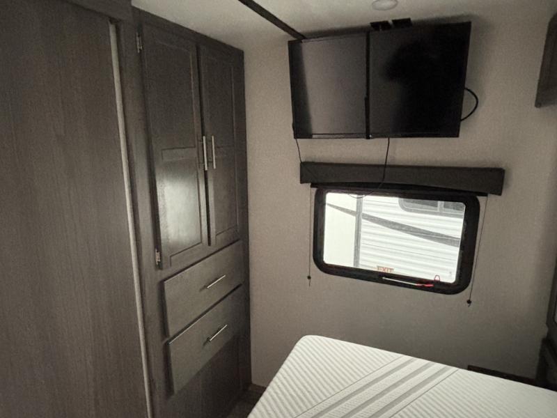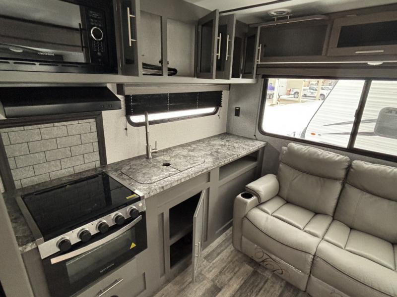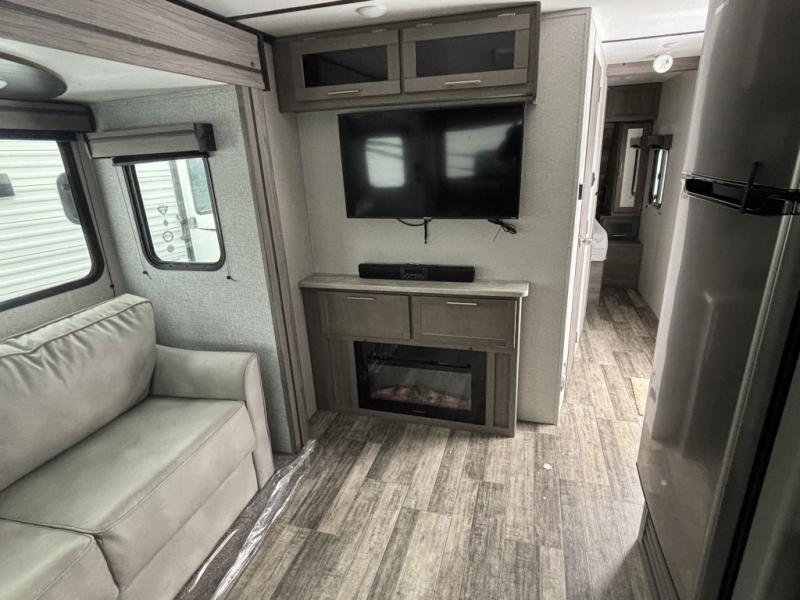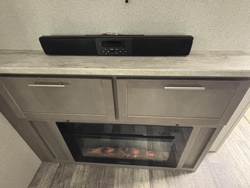 You will feel right at home in this travel trailer that can comfortably sleep four people each night. Once you arrive at your destination, set up the power awning and grab a cold drink from the outside refrigerator. You can then stretch your legs on a trail or two and easily clean up in the full bath when you return. The theater seats sit directly across from the entertainment center and fireplace for easy viewing, and the chef of your group will have all the appliances needed to create a home-cooked meal. You'll love the front private bedroom that includes a king bed, dual shirt closets, plus overhead space to store your things!