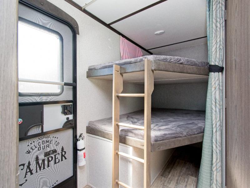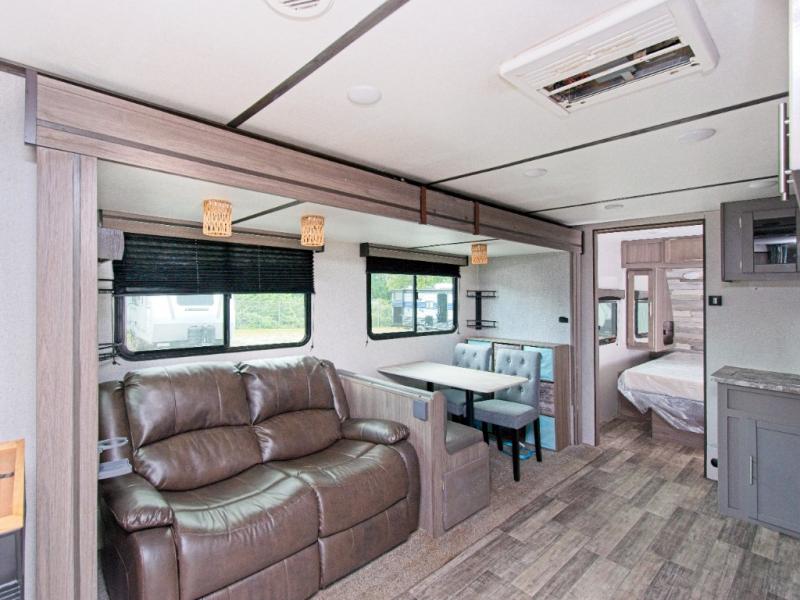 Whether you're planning a weekend getaway or a cross-country road trip, the Volante 28BH makes it easy to bring the whole crew. With sleeping space for up to 10 people, this travel trailer is ideal for families and groups. The private front bedroom offers a peaceful retreat for parents, while the double-size bunks are a hit with kids and guests. The tri-fold sofa and U-shaped dinette in the slide-out provide even more sleeping options.