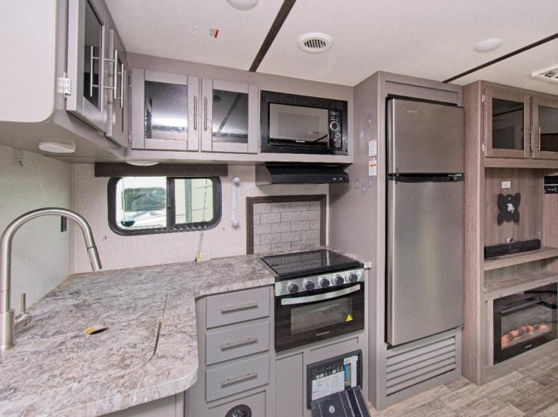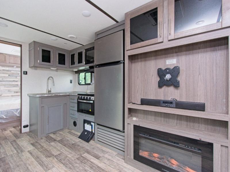 The CrossRoads RV Volante 28BH offers spacious double-size bunk beds and a cozy fireplace, making it the perfect travel trailer for family comfort and adventure.