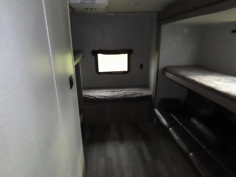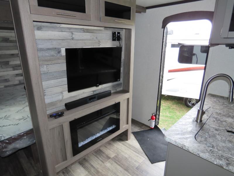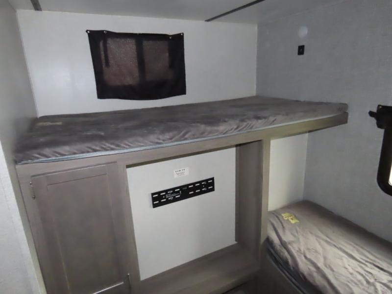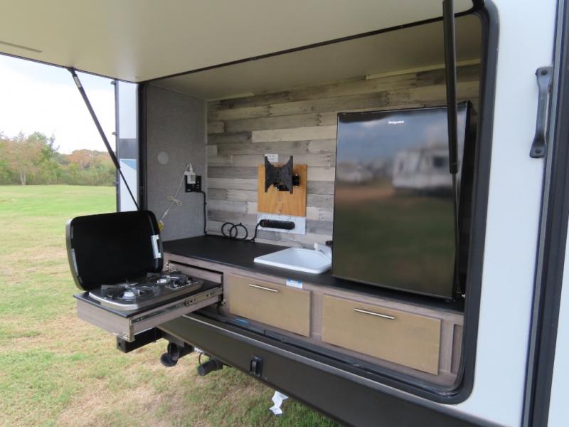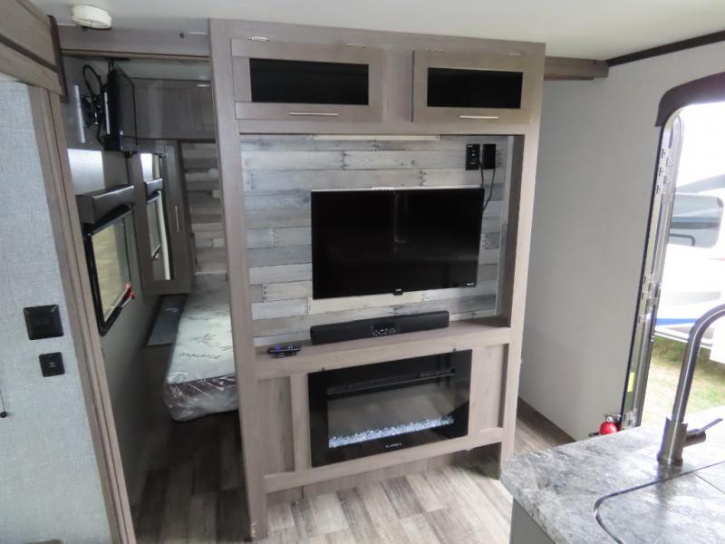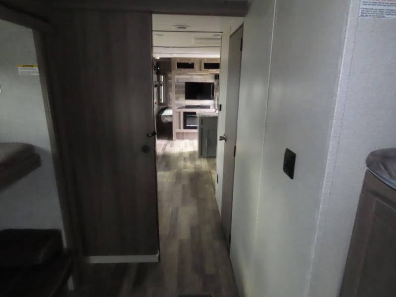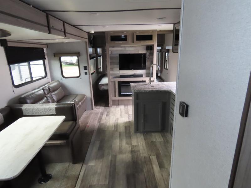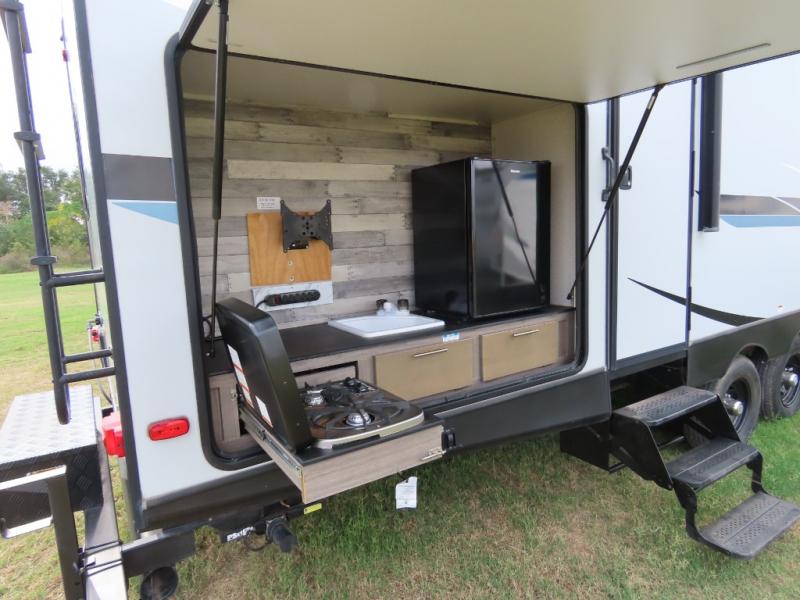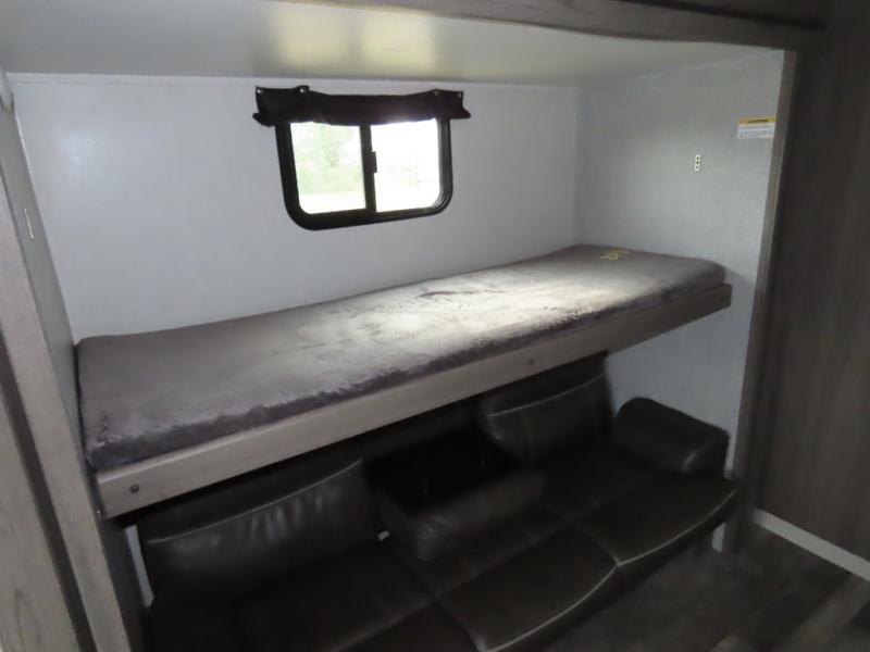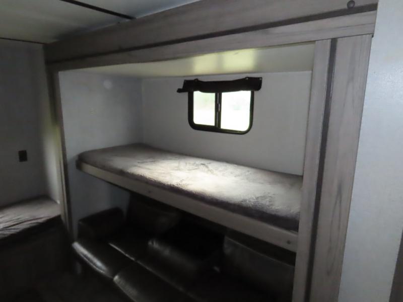 Are you looking to upgrade your RV to a unit with more space and conveniences? Look no further than this dual entry travel trailer with double slides and an eleven-person sleeping capacity. The private bunkhouse includes three bunks, plus a jackknife sofa and plenty of space thanks to the slide out. Easily prepare meals on the three-burner cooktop indoors, or head outdoors to cook on the outside kitchen. The power awning is sure to provide shade as you watch the kids ride their bikes around the campsite. This model also includes a fireplace for a cozy evening indoors, and the king bed in the front private bedroom will provide a great night's rest!