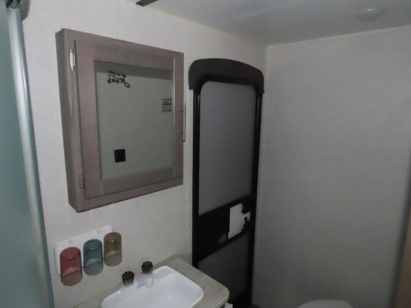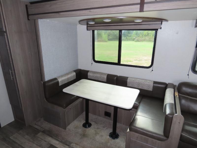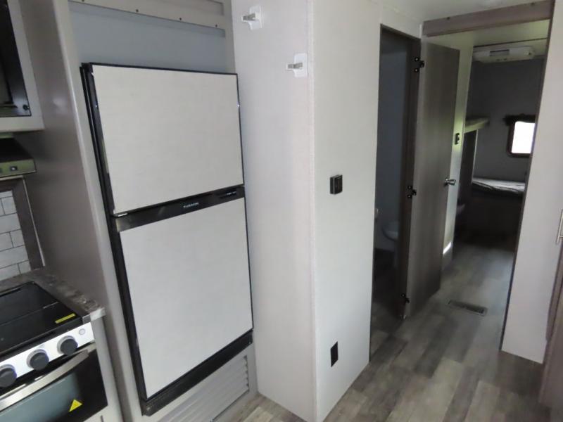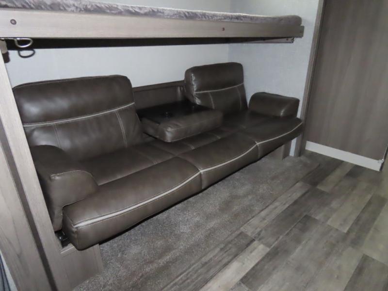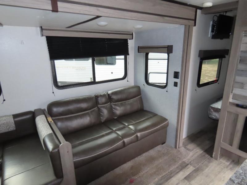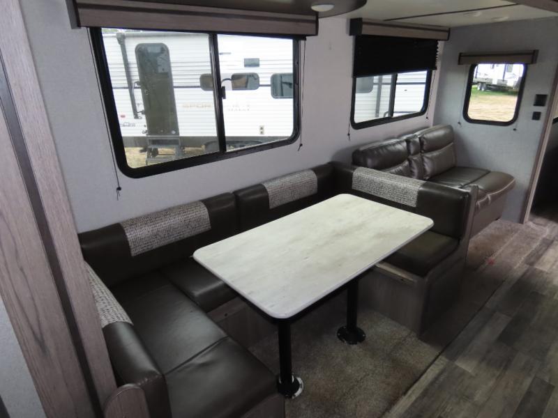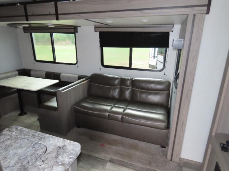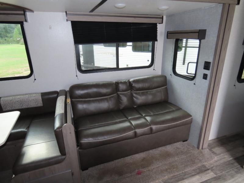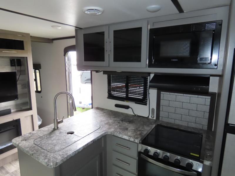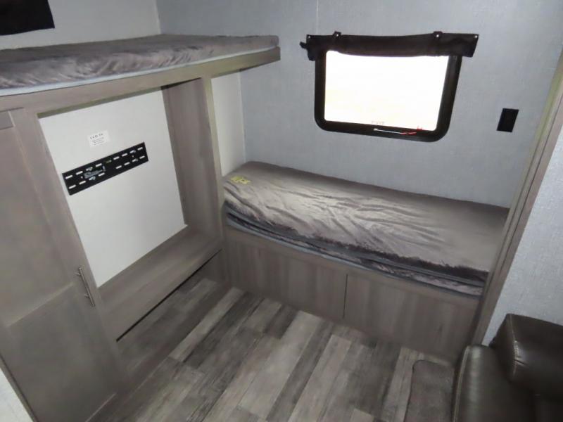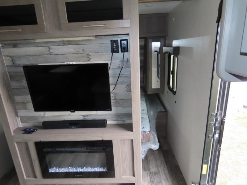 Are you looking to upgrade your RV to a unit with more space and conveniences? Look no further than this dual entry travel trailer with double slides and an eleven-person sleeping capacity. The private bunkhouse includes three bunks, plus a jackknife sofa and plenty of space thanks to the slide out. Easily prepare meals on the three-burner cooktop indoors, or head outdoors to cook on the outside kitchen. The power awning is sure to provide shade as you watch the kids ride their bikes around the campsite. This model also includes a fireplace for a cozy evening indoors, and the king bed in the front private bedroom will provide a great night's rest!
