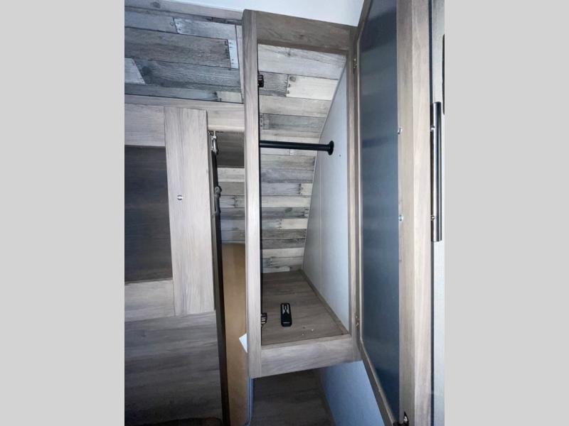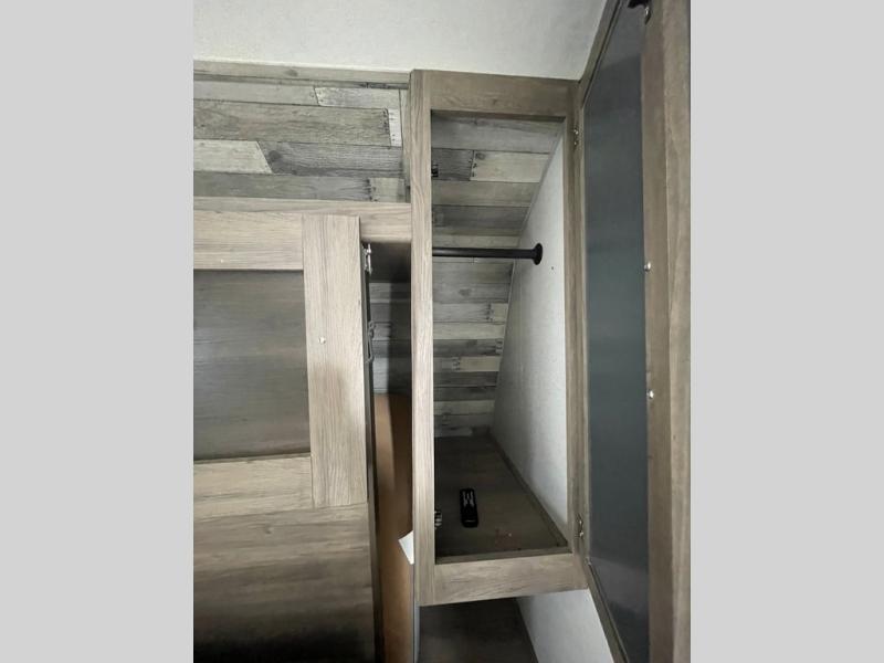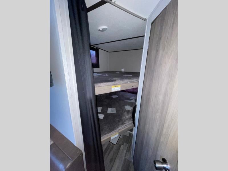 Whether you're enjoying lunch at the booth dinette, relaxing on the jackknife sofa, or cleaning up in the rear corner bath, you can be sure to have a great time in this travel trailer. The kids will love the double bunk beds and mom and dad can convert the jackknife sofa to sleep on the Murphy bed at night. You can prepare all your meals on the stainless steel appliances and there is a 6 cu. ft. gas/electric refrigerator for all your perishables. This model also includes dual shirt closets for clothes, plus overhead cabinets for all your necessities.