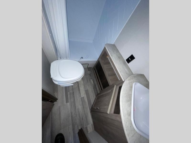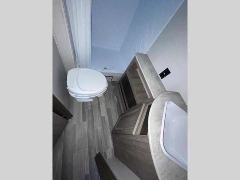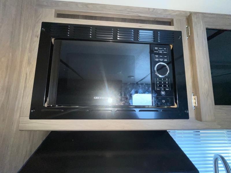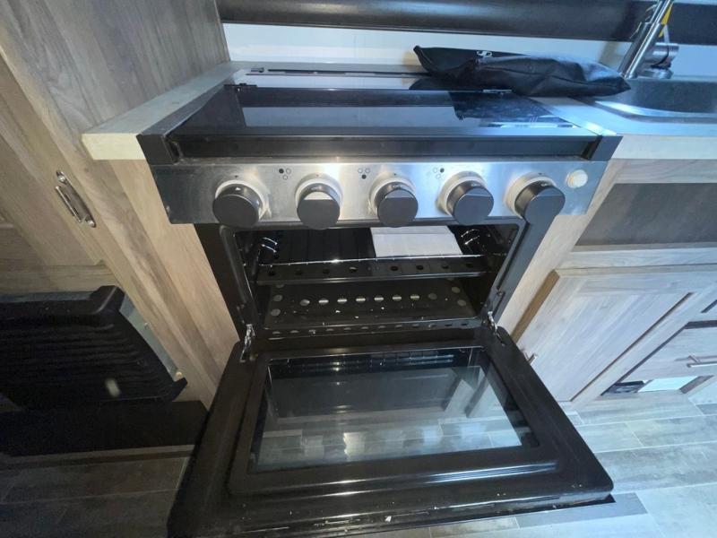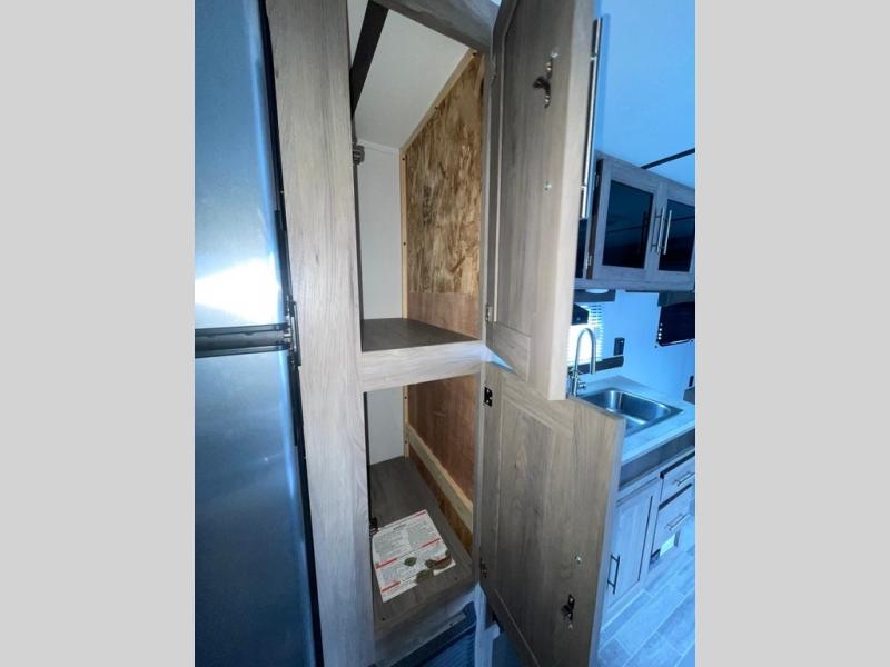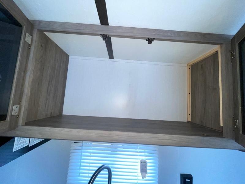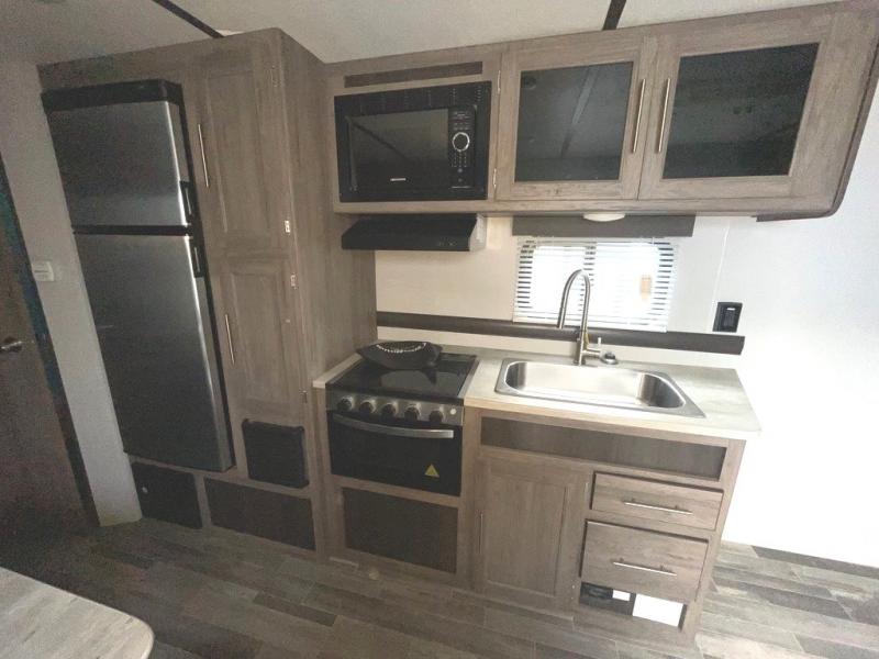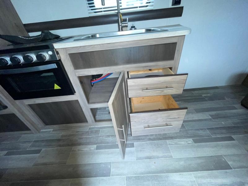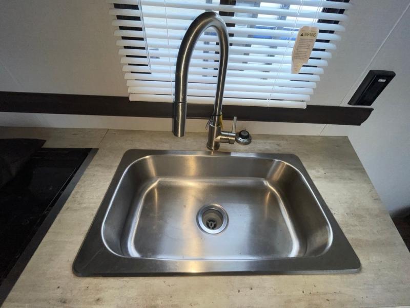 In each Zinger Lite travel trailer, you will find generous storage compartments for all your valuables and comfortable features to make each camping trip enjoyable. You'll enjoy the AM/FM Stereo with Bluetooth and the LED lighting and designer valances will make you feel right at home. The chef of the family will love the Zinger Lite kitchen with its Maple cabinet drawers, stainless steel sink and high rise faucet. Each model includes a mirrored medicine cabinet to store all your necessities, and the bedspread in the bedroom will provide a comfortable night's rest!