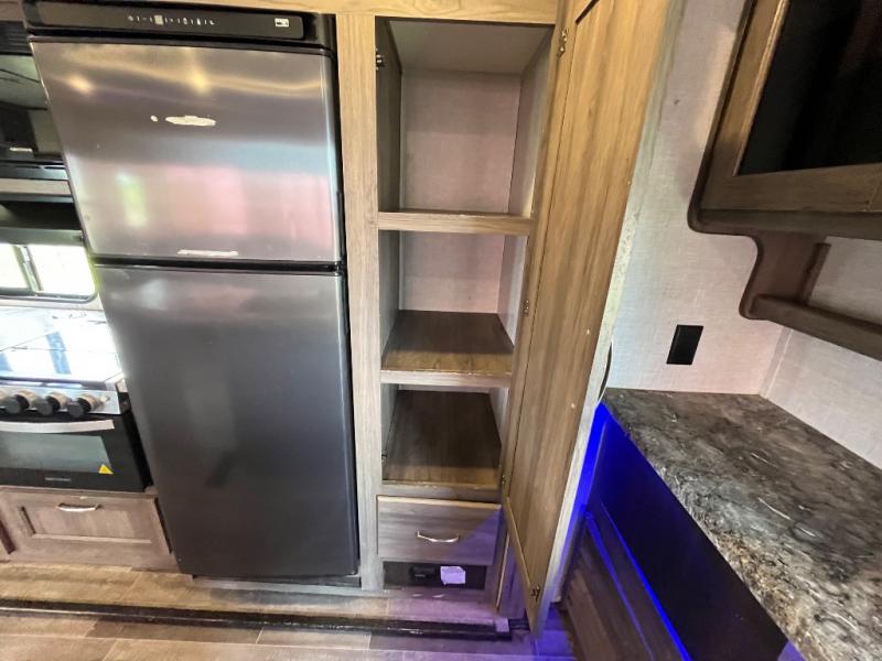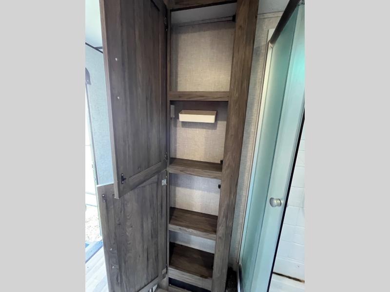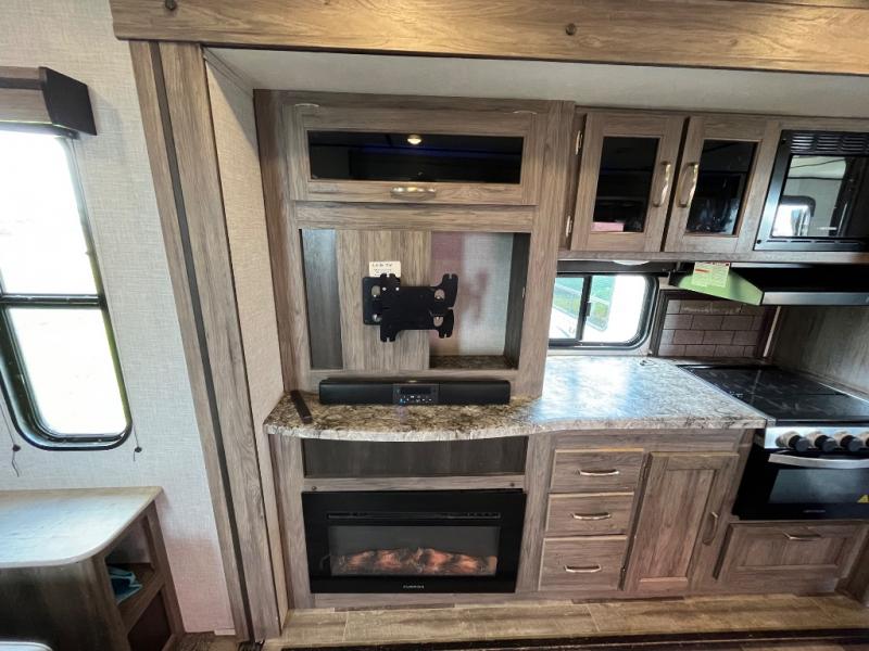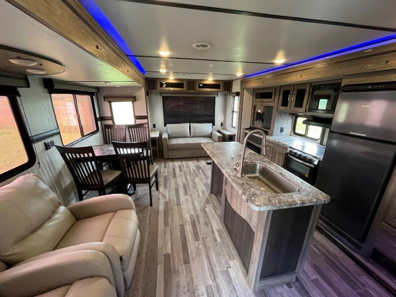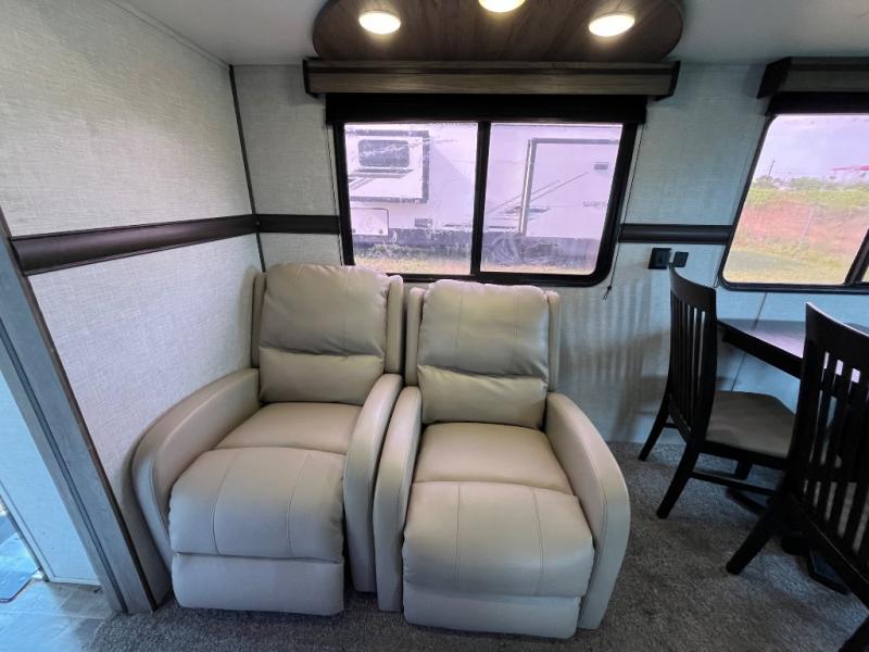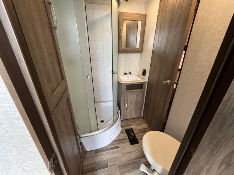 You won't want to camp any other way once you step inside this travel trailer! The dual-entry bathroom has a 34" radius shower and is easy for everyone to access, especially those who are staying in the front private bedroom. The kitchen is packed full with features including a hutch to store your dishes, a large pantry, and a kitchen island with a chair on either side of it. You can spend your evenings playing games at the 80" U-shaped dinette or have a movie night with the entertainment center directly across from the two recliner chairs and a 76" jackknife sofa that can transform into an extra sleeping space for a guest or two!
