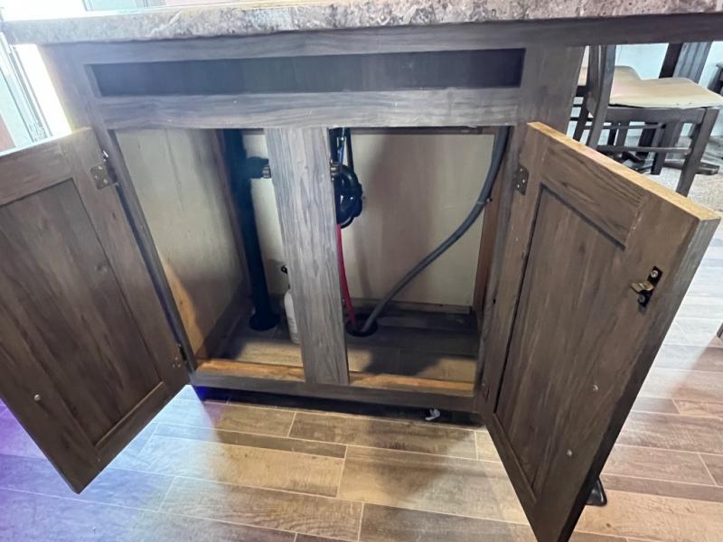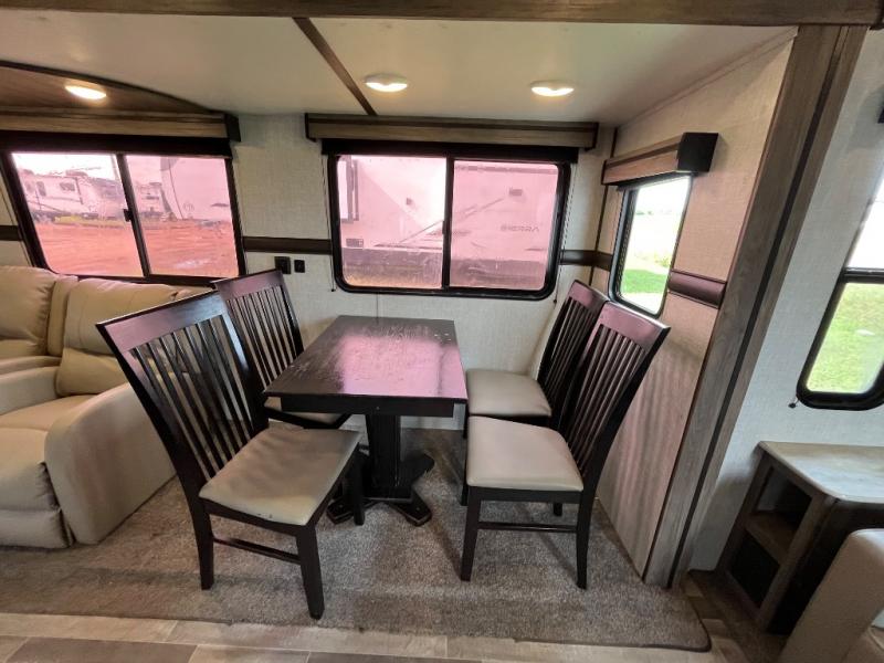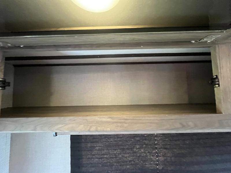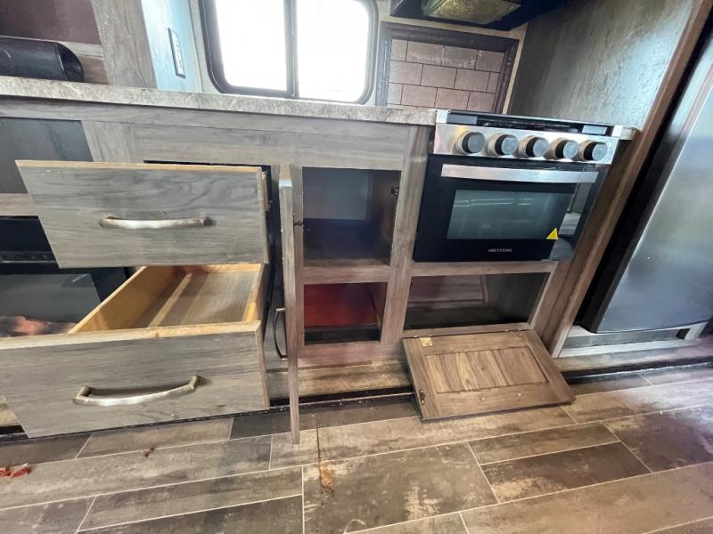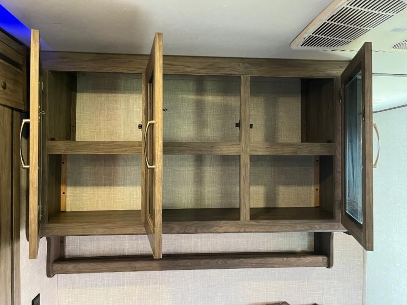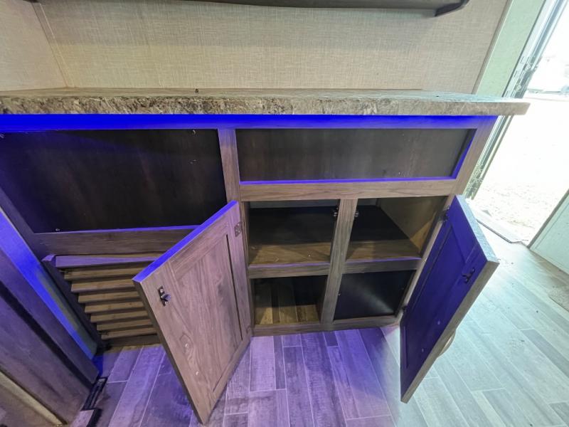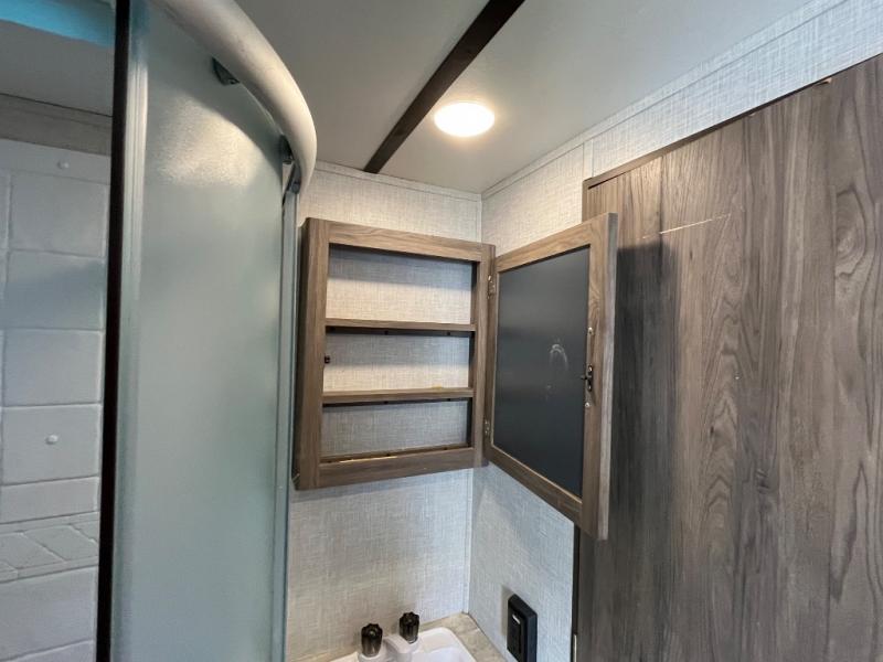 You won't want to camp any other way once you step inside this travel trailer! The dual-entry bathroom has a 34" radius shower and is easy for everyone to access, especially those who are staying in the front private bedroom. The kitchen is packed full with features including a hutch to store your dishes, a large pantry, and a kitchen island with a chair on either side of it. You can spend your evenings playing games at the 80" U-shaped dinette or have a movie night with the entertainment center directly across from the two recliner chairs and a 76" jackknife sofa that can transform into an extra sleeping space for a guest or two!