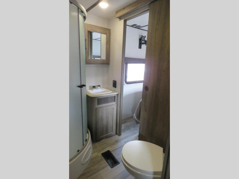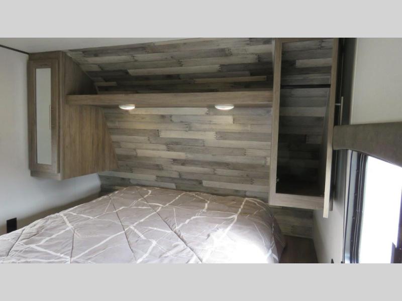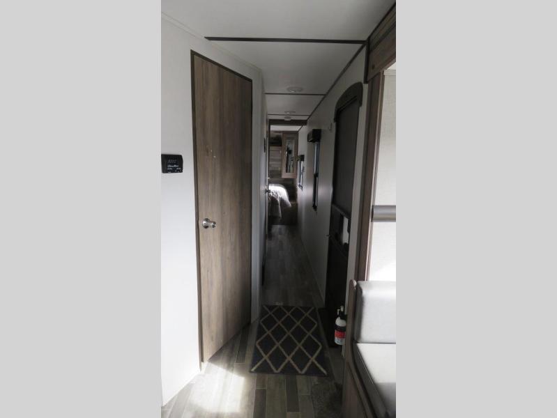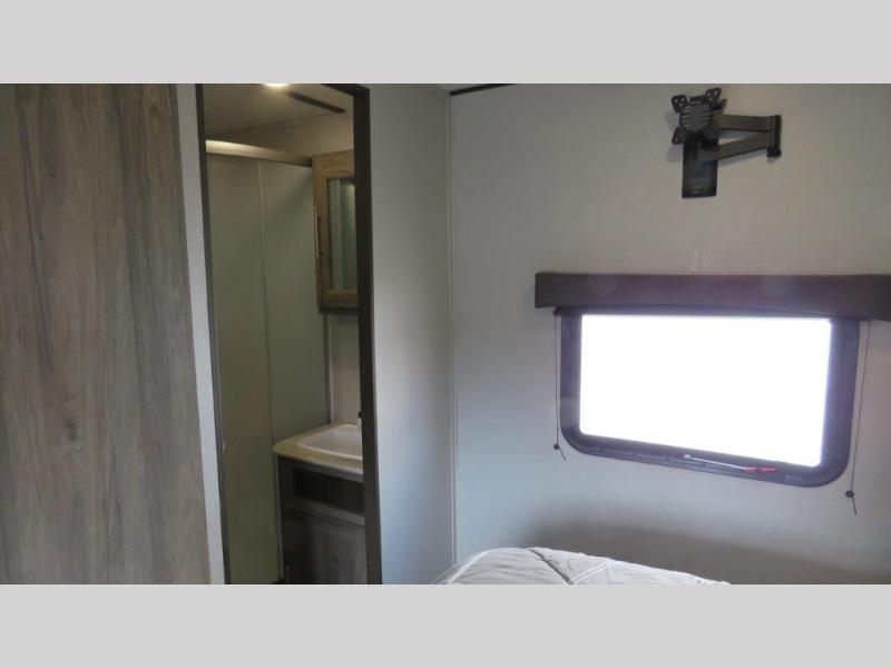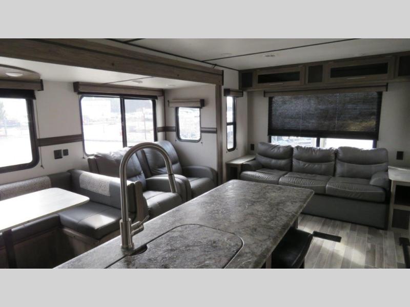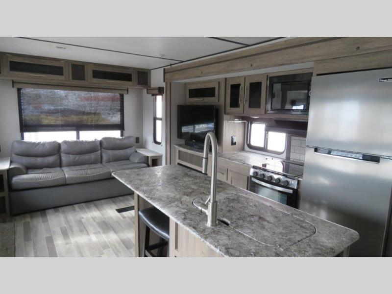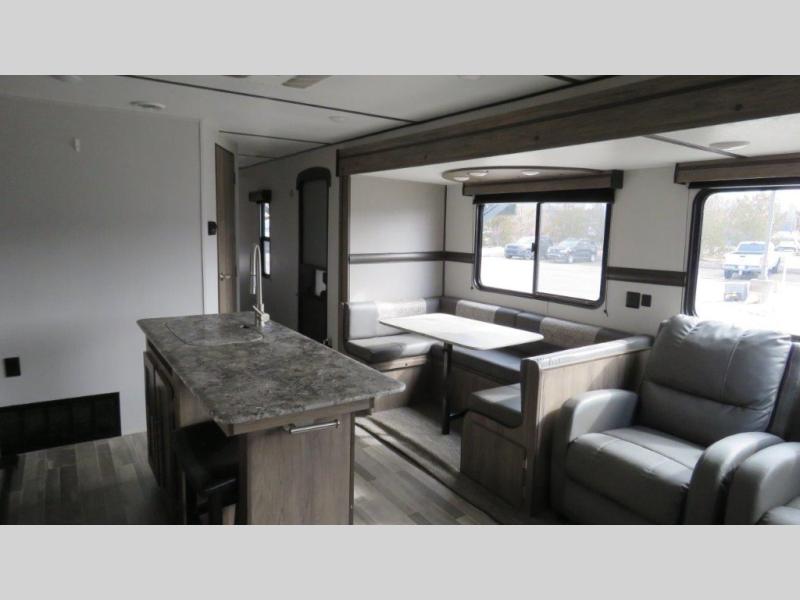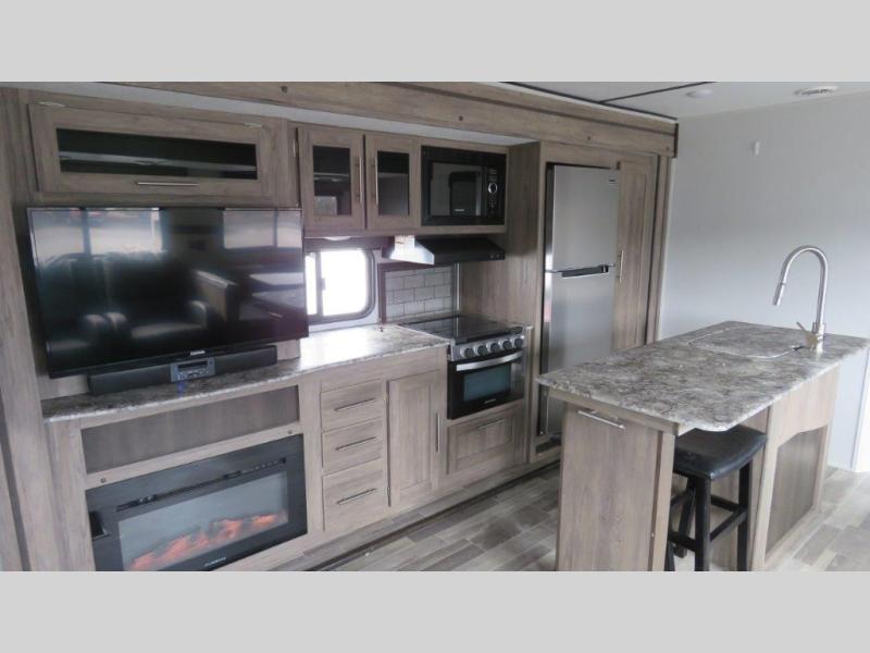 Don't pass up your chance to camp in true luxury with this travel trailer! You will enjoy a good night's rest on the 60" x 74" RV queen bed with its own private entrance into the dual-entry bathroom, and the rest of your group can sleep in the second bedroom on the 28" x 66" bunk above the 24" x 38" dinette which can be converted. Plus, the 42" U-shaped dinette and the rear 72" jackknife sofa can both be converted into extra sleeping spaces when not being used for dining or taking an afternoon nap. The two recliners are conveniently located across from the entertainment center with a 39" TV and fireplace for an ultimate relaxing night indoors!