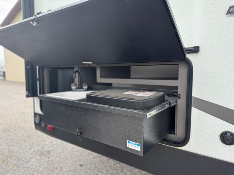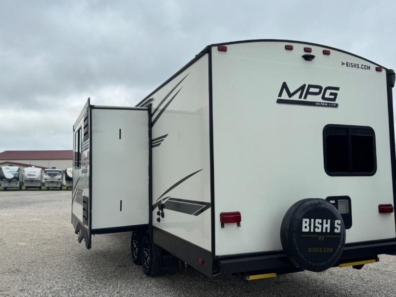 New and exciting adventures await you with this MPG travel trailer! Your children can have their own sleeping area with the double-size bunks in the back, and since these bunks are right next to the full bathroom, it won't be difficult for them to find the bathroom in the middle of the night. You can all come together in the main living area and enjoy the extra space that the large slide provides, and when you want to make it a game night, just use the U-shaped dinette. The front private bedroom has an entry door on either side of the entertainment center, and it also contains a king-size bed for the ultimate comfort. One thing that you're absolutely going to love about this trailer is the outdoor kitchen because it will allow you to keep the smells of bacon out of the interior.
