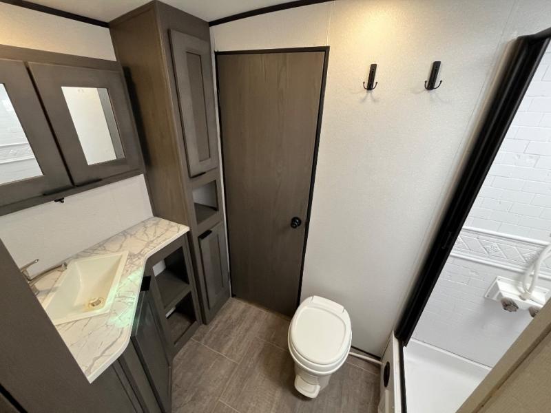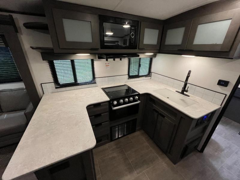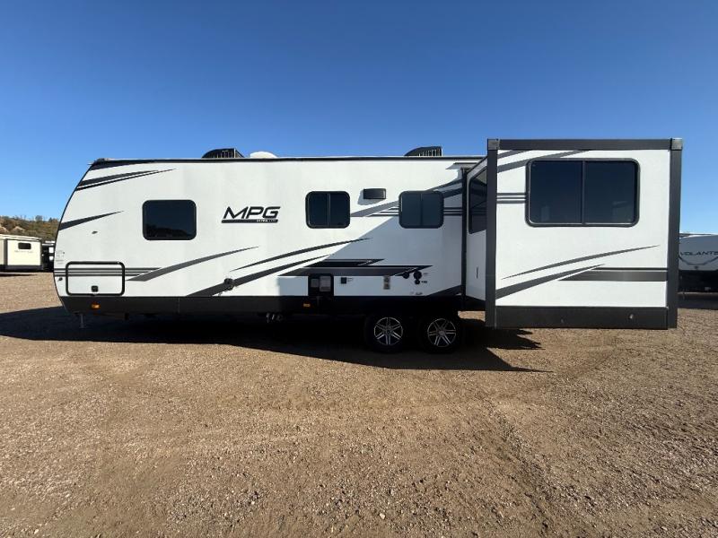 The thing that you are going to like best about this MPG travel trailer is the spacious rear living area! This part of the trailer has a rear entertainment center and a set of opposing sofa slides, and since this section is also adjacent to the kitchen, you can sit in one of the two bar stools at the breakfast bar while still being a part of the living area. Having a walk-through bath is convenient because it means that you can access the bathroom from the main living area or from the comfort of the front private bedroom, and having a king-size bed in the bedroom means that you will be able to sleep in supreme comfort each night.