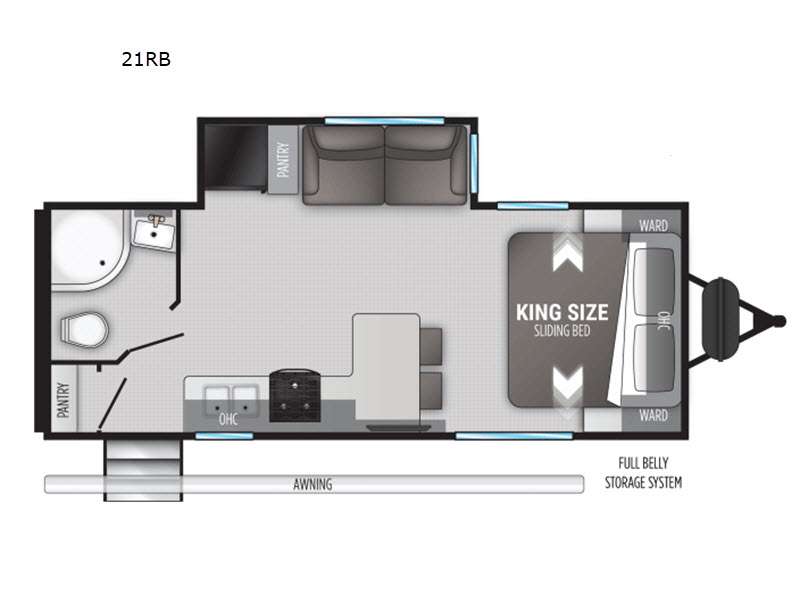 You and your spouse will love this spacious couple's trailer to take to the lake. The patent pending king bed slide system will allow you to shift the bed to the right or the left so you can easily get dressed or put your shoes on each day. If you have any guests stay over, they will sleep soundly on the sofa slide out in the living area. Enjoy your breakfast at the counter with stools each morning, and the two pantries will allow you to store paper goods, snacks, and the first-aid kit. This model also includes a rear corner bath for added privacy, and the dual wardrobes on either side of the bed will be perfect for his and her clothes!