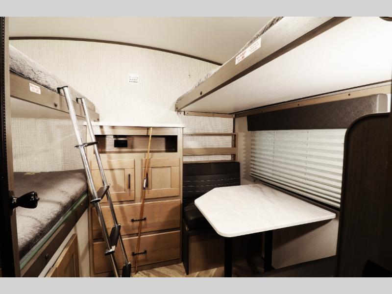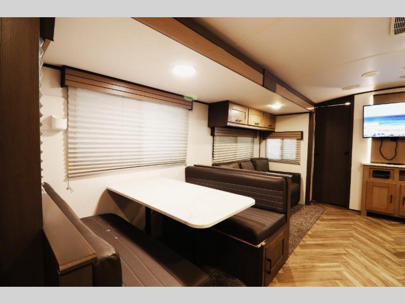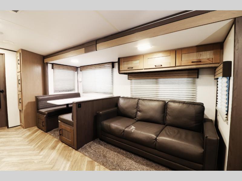 Large U-shaped dinette, tri-fold sofa, and private bunkhouse — ideal for families