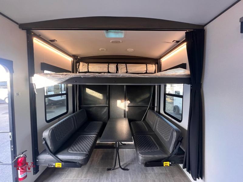 Load up your family, a few off-road toys, and enjoy the weekend of your dreams with this Stryker toy hauler travel trailer by Cruiser RV. This model features plenty of space thanks to the single slide, and the two entry doors give this unit great accessibility. The king sliding bed in the private master suite will be a retreat away from the hustle and bustle in the central living area. There are two opposing sofas and an electric queen-size bunk in the garage area that can be transformed into additional sleeping space for extra family or friends that have joined you.