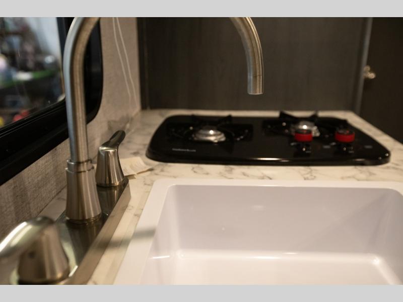 Every one of these Dutchmen RV Aspen Trail toy haulers and travel trailers are built with a durable roof structure including a TPO roof with 3/8" decking, fiberglass insulation, and a Lauan interior panel! The insulated structure consists of a metal exterior panel, a wood frame with R7 thermal insulation, and a Lauan interior panel too so you can keep the warm air in during the cooler months and the cool air in with the superior A/C cooling system during the warmer months. The extended long rain gutters will keep the rain away from it too. With seamless Thermofoil countertops and upgraded Beauflor lino throughout, you will feel right at home while camping in the woods!