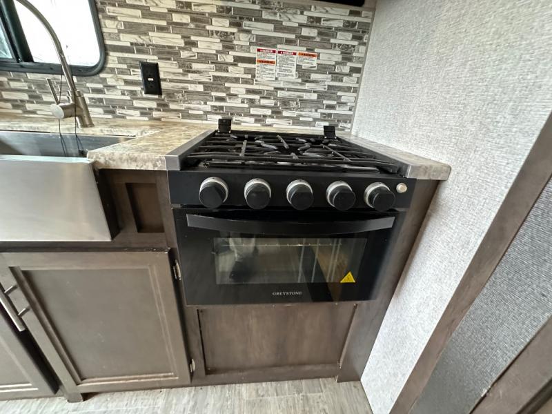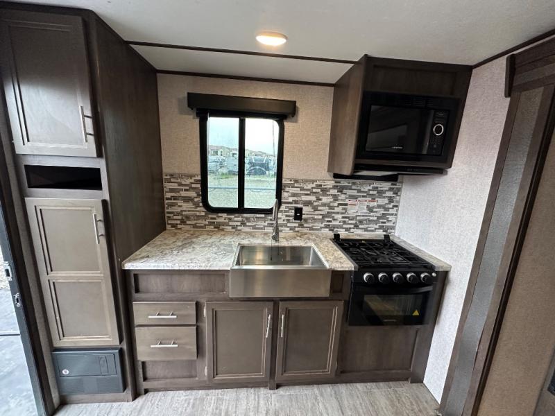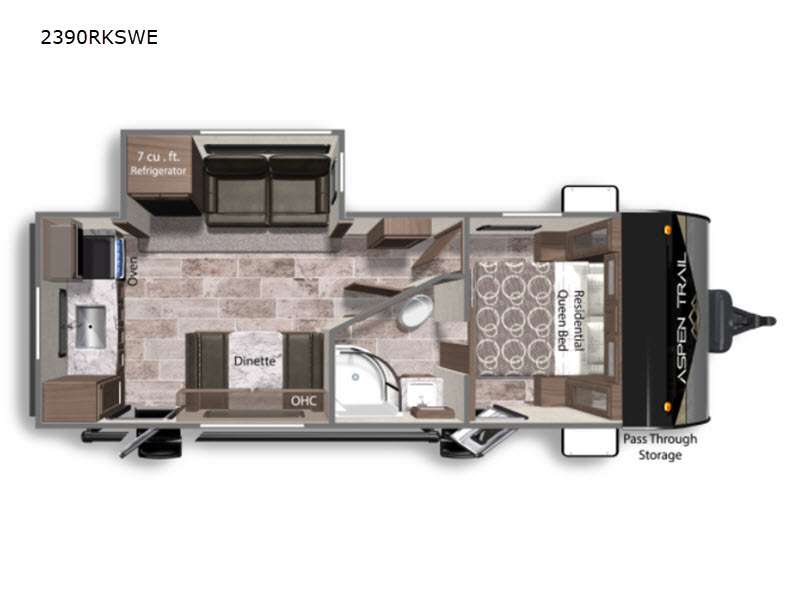 You will love all that this Aspen Trail travel trailer has to offer! From the front master suite which features a queen-size bed and wardrobes on either side to the rear kitchen which features a three-burner range with oven and glass cover, you will have everything you need for great comfort. You will also enjoy how convenient it will be for everyone to access the dual entry bath, and the sofa with EZ storage is located right next to the 7 cu. ft. refrigerator so that you can grab your favorite beverage without even getting up!