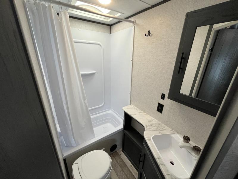 Every one of these Dutchmen RV Aspen Trail toy haulers and travel trailers are built with a durable roof structure including a TPO roof with 3/8" decking, fiberglass insulation, and a Lauan interior panel! The insulated structure consists of a metal exterior panel, a wood frame with R7 thermal insulation, and a Lauan interior panel too so you can keep the warm air in during the cooler months and the cool air in with the superior A/C cooling system during the warmer months. The heated and enclosed underbelly will keep your unit's vitals safe from the elements, and the extended long rain gutters will keep the rain away from it too. With seamless Thermofoil countertops and upgraded Beauflor lino throughout, you will feel right at home while camping in the woods!