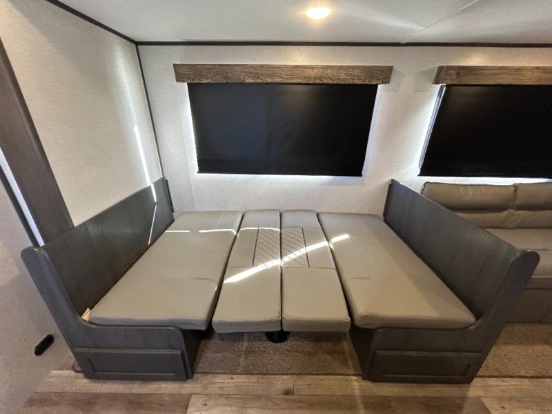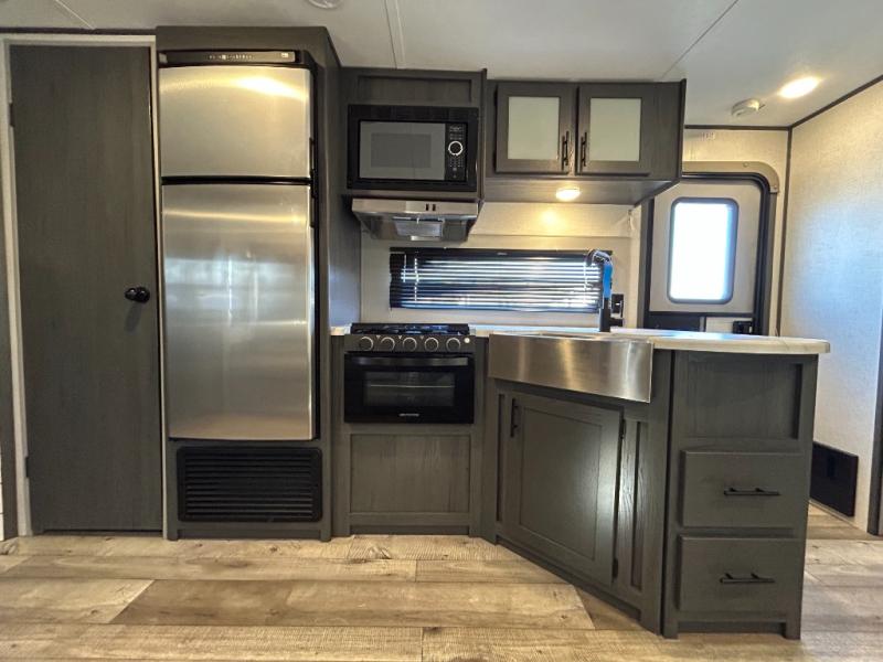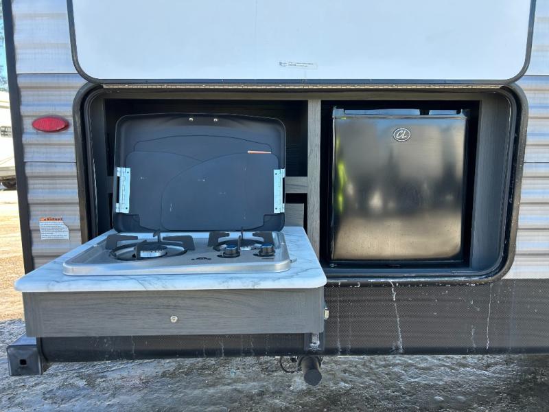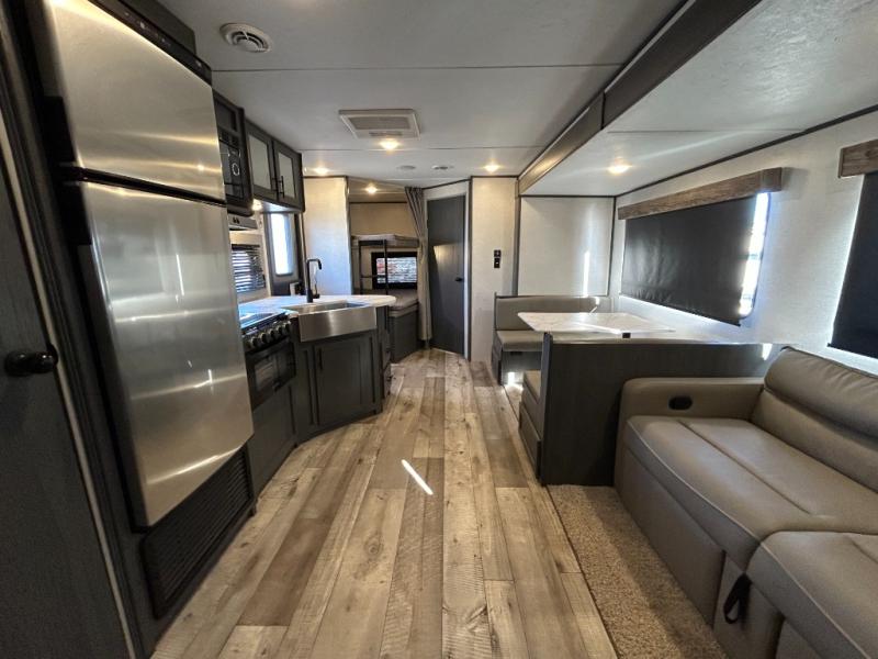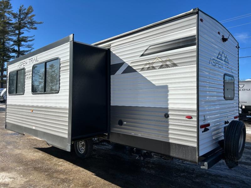 You won't know where to begin with this Aspen Trail travel trailer that has two entry doors! The kids will love sleeping on the rear set of double-size bunks, and you will love having your own private retreat in the front bedroom that has a queen-size Everdream mattress always waiting for you. The U-shaped dinette and sofa rest upon the large slide which provides extra moving space. Grab a snack from the large pantry and head outdoors to see what the chef is grilling up at the outdoor kitchen!
