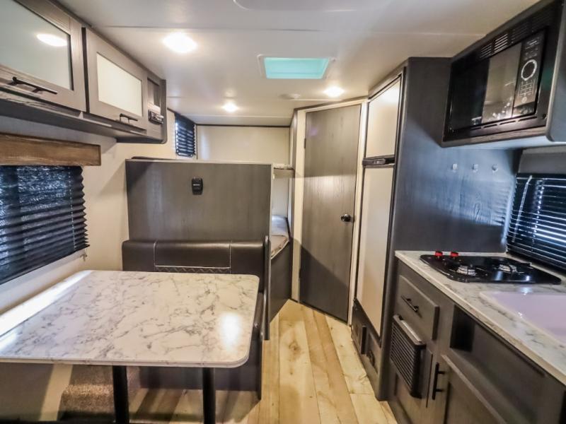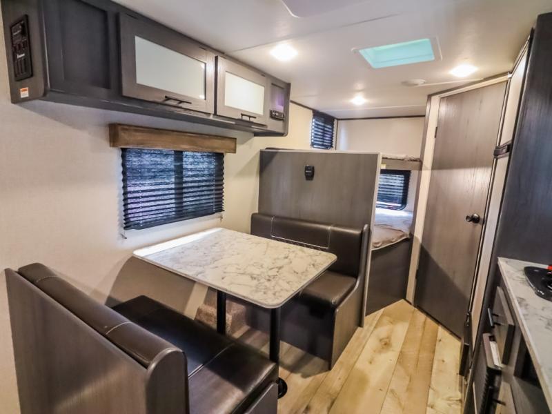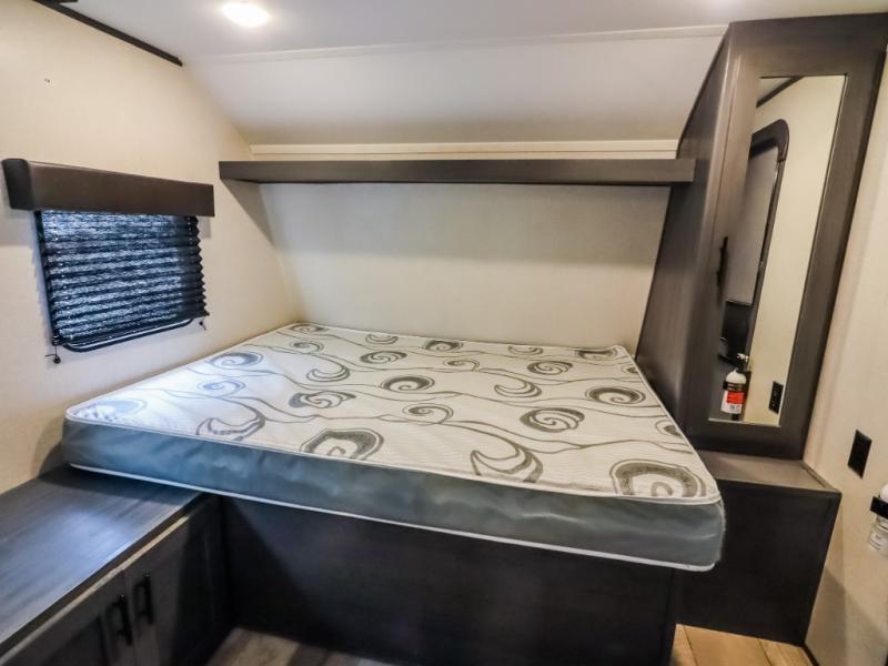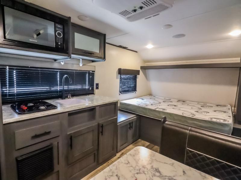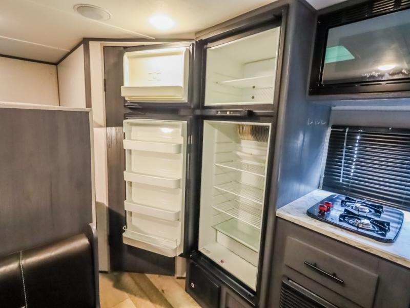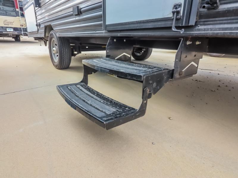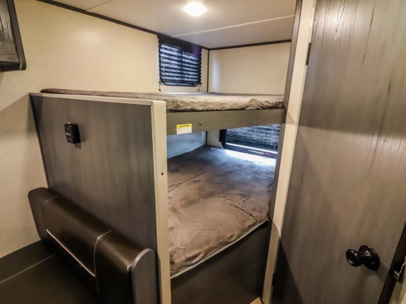 The whole gang will enjoy camping in this travel trailer! It features a front queen bed with a wardrobe and nightstand at the foot of it, and a set of rear corner bunk beds for the kids to sleep. You can prepare your best home cooked meals with the three burner cooktop and enjoy them at the booth dinette then play a card game or two. You could even prepare your meals at the outdoor kitchen. The rear corner bathroom has a shower for you to rinse the sand out of your hair!