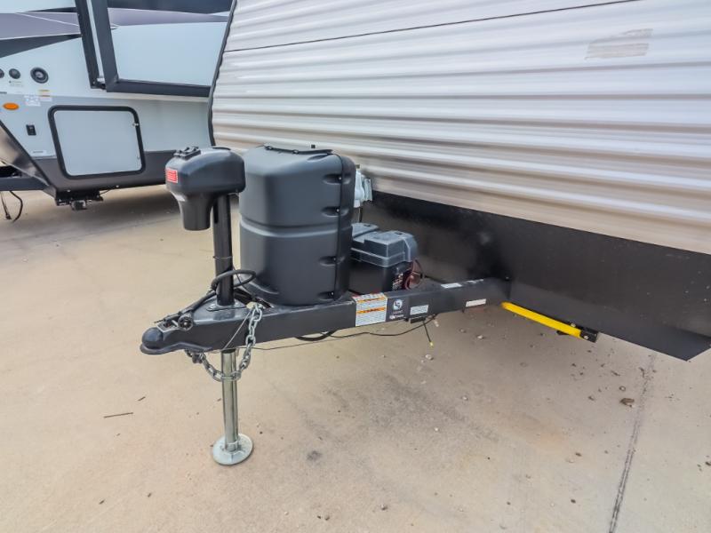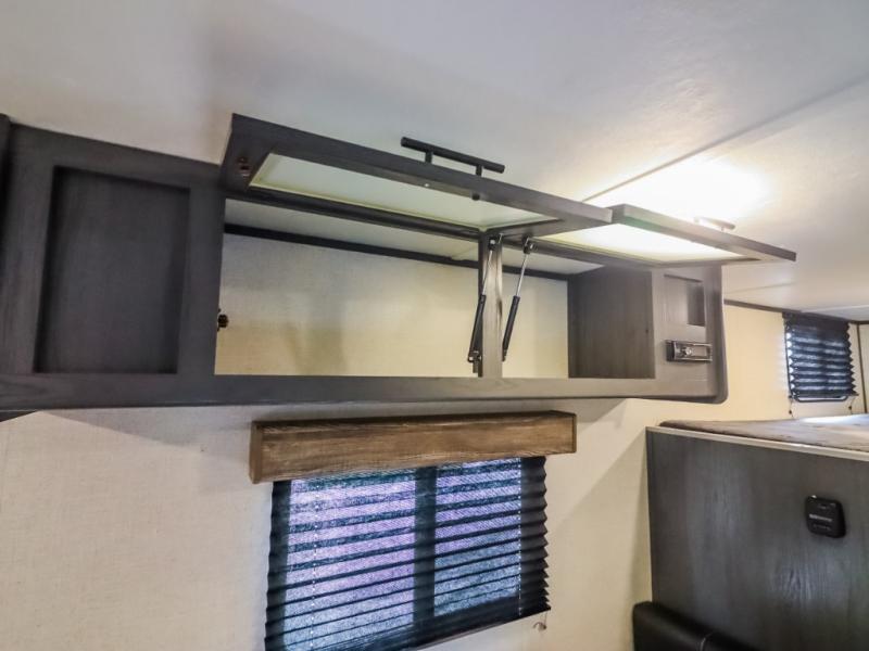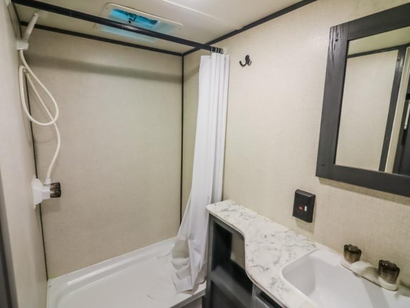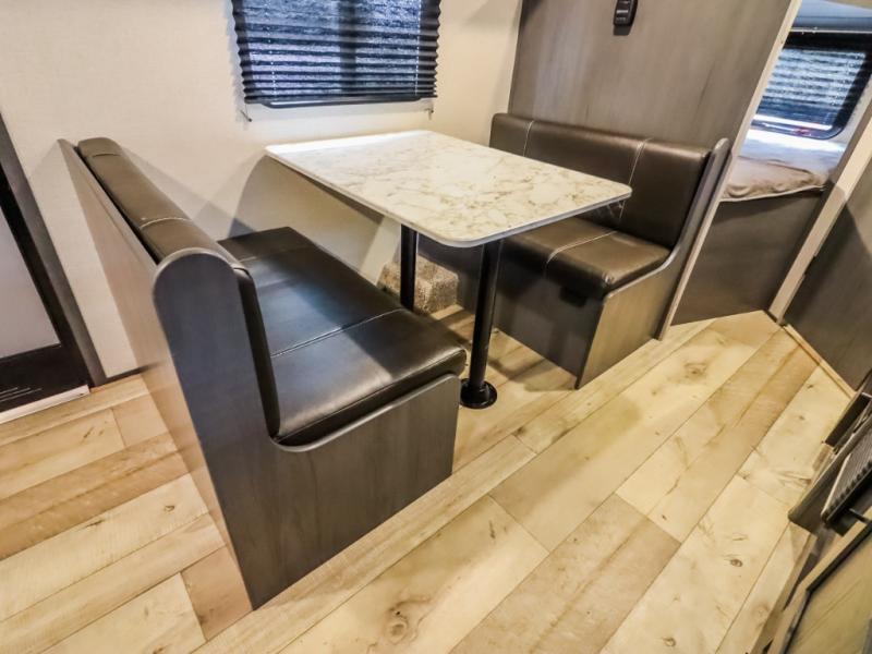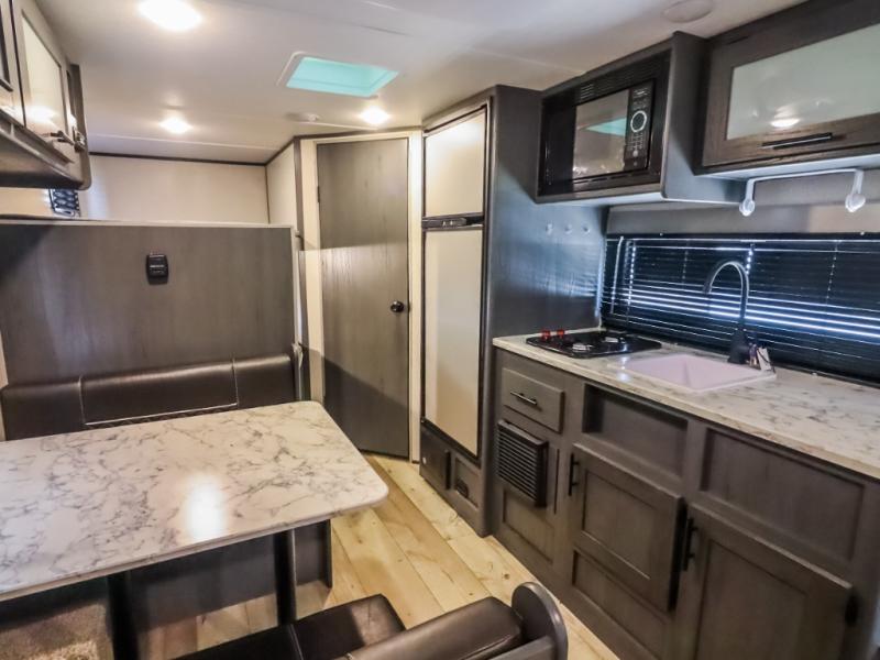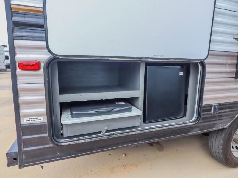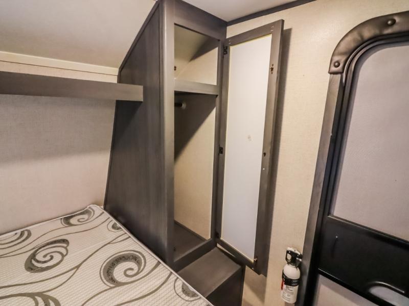 The whole gang will enjoy camping in this travel trailer! It features a front queen bed with a wardrobe and nightstand at the foot of it, and a set of rear corner bunk beds for the kids to sleep. You can prepare your best home cooked meals with the three burner cooktop and enjoy them at the booth dinette then play a card game or two. You could even prepare your meals at the outdoor kitchen. The rear corner bathroom has a shower for you to rinse the sand out of your hair!