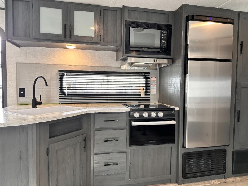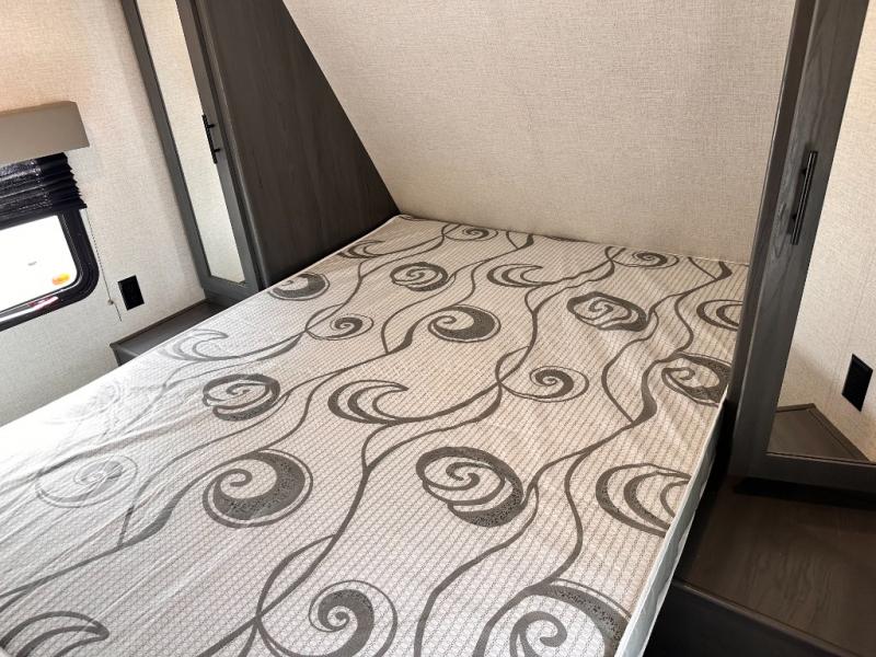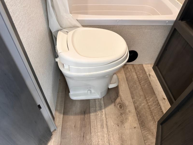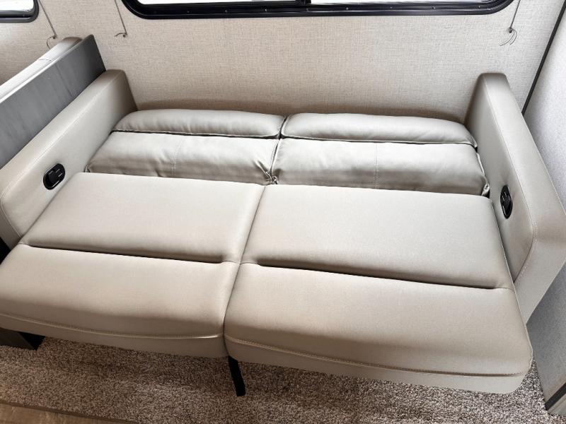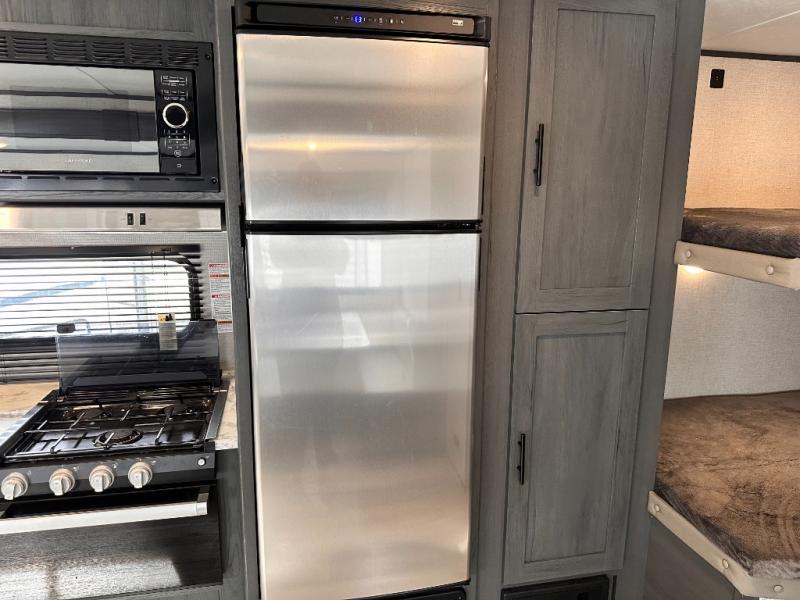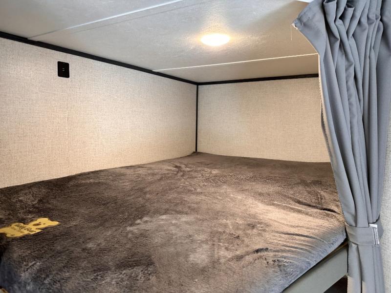 You will feel right at home camping in this travel trailer! The front private bedroom has a queen bed with wardrobes/nightstands on either side and doors on either side to exit the room. The sofa is a great place for an afternoon nap and comes with EZ storage to put your blankets or games that you can play at the booth dinette. Everyone can get cleaned up in the rear corner bathroom, and the set of bunk beds are conveniently right next to it!