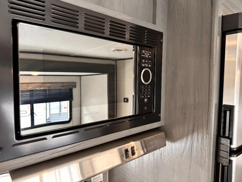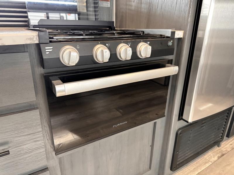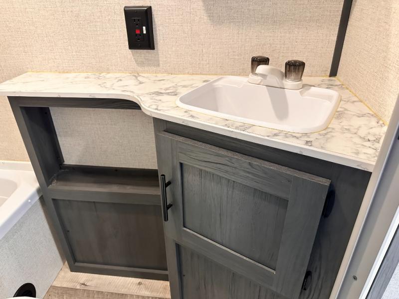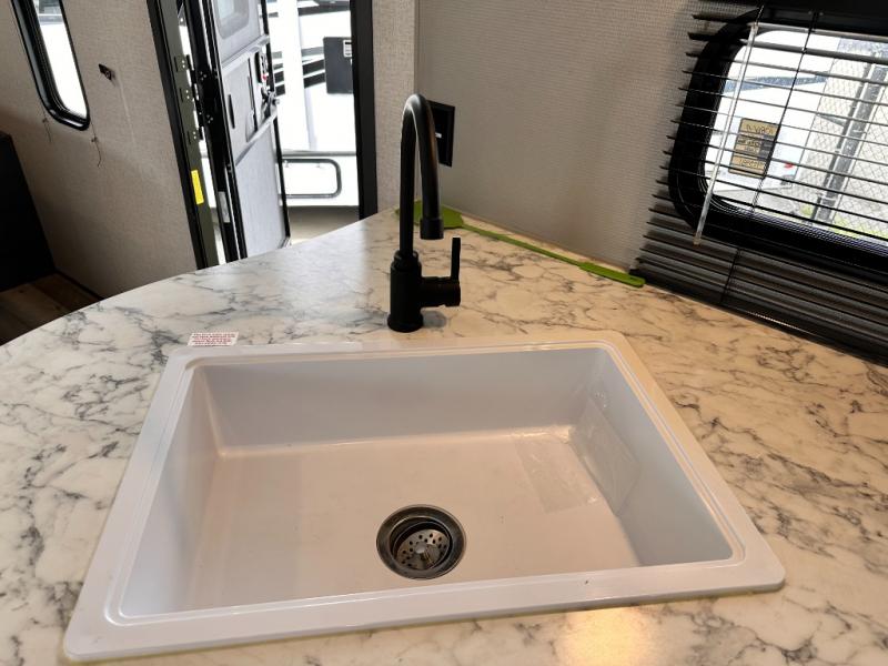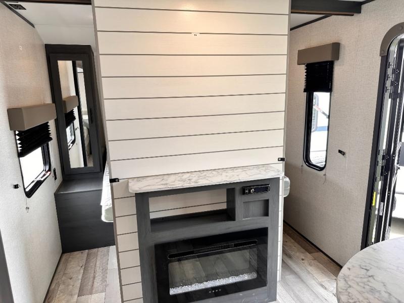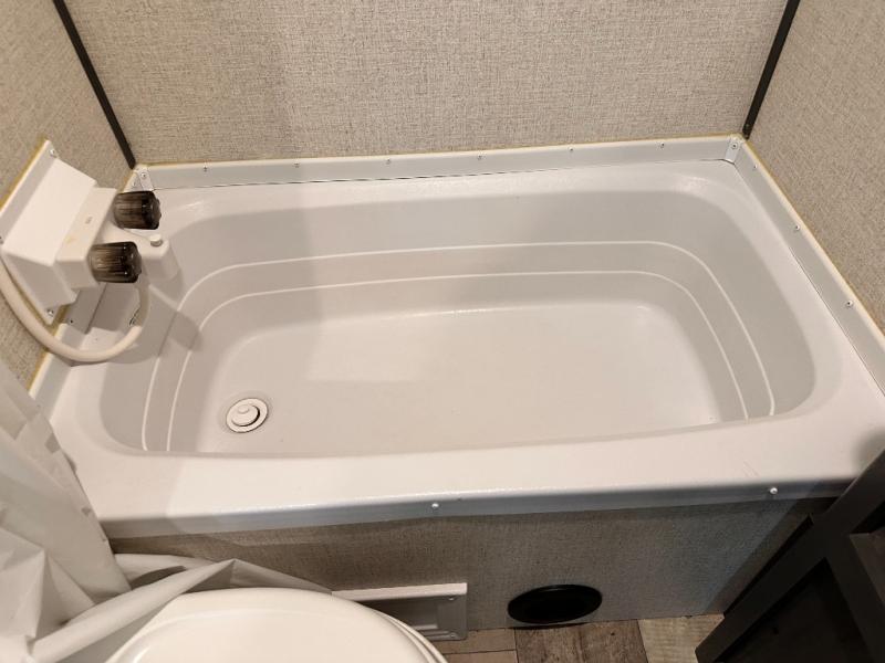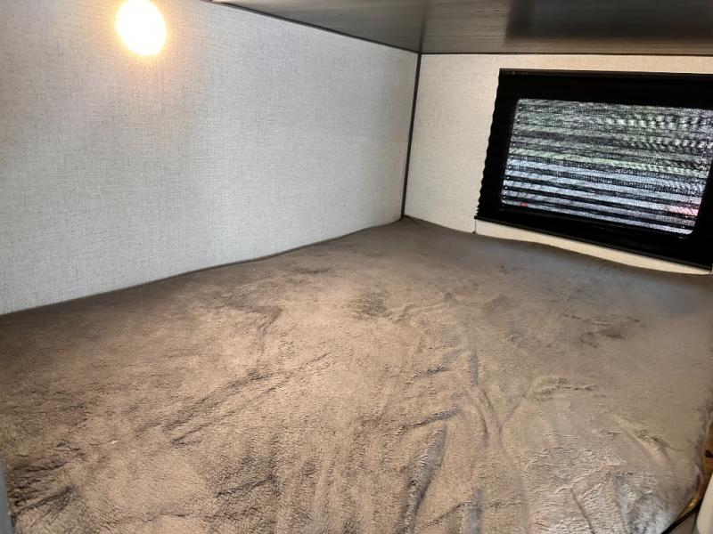 You will feel right at home camping in this travel trailer! The front private bedroom has a queen bed with wardrobes/nightstands on either side and doors on either side to exit the room. The sofa is a great place for an afternoon nap and comes with EZ storage to put your blankets or games that you can play at the booth dinette. Everyone can get cleaned up in the rear corner bathroom, and the set of bunk beds are conveniently right next to it!