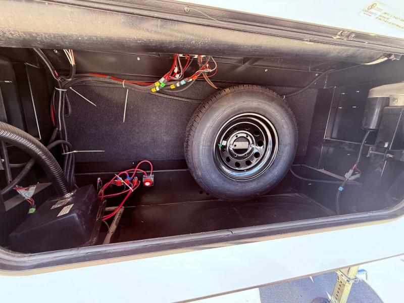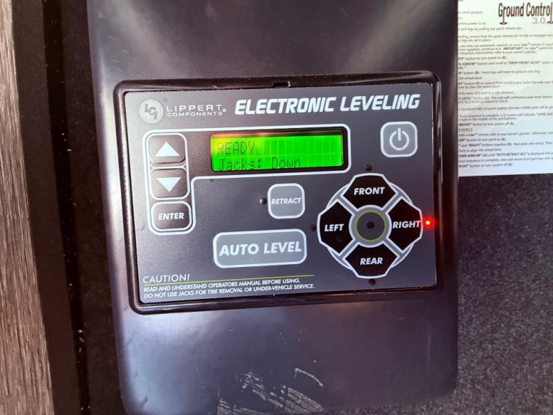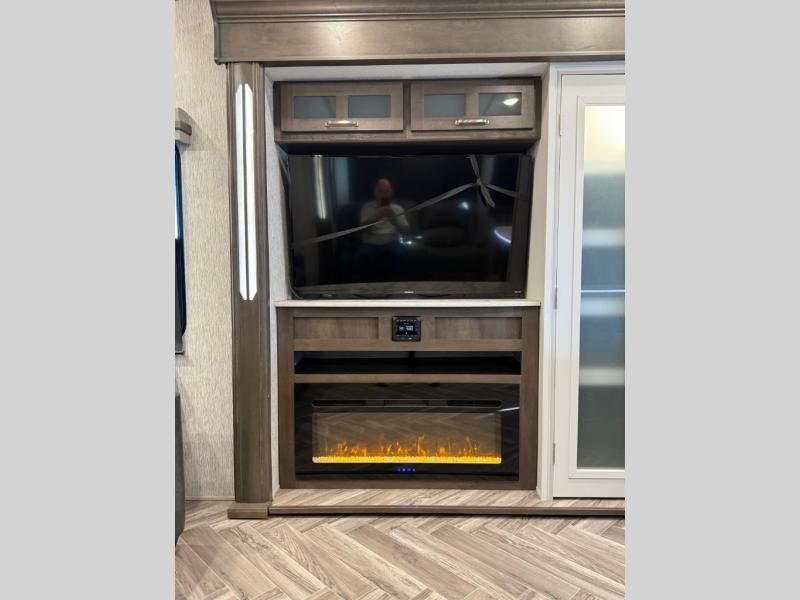Whether you travel with your spouse or your family to state parks or RV resorts, this fifth wheel offers enough space and comfort! Enjoy the cozy 40" glass fireplace during chilly months, and the 50" LED TV on rainy days. The dual opposing slides in the rear living/kitchen area open up the whole space, and the kitchen island with solid surface countertop makes it feel more like home. You'll appreciate all the storage space you have, including a pantry and a 12 cu. ft. refrigerator for all your food for the week. This unit features a front private bedroom with a king-size bed slide and a large front wardrobe.