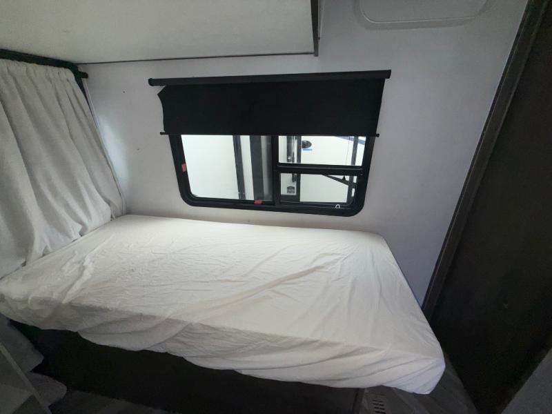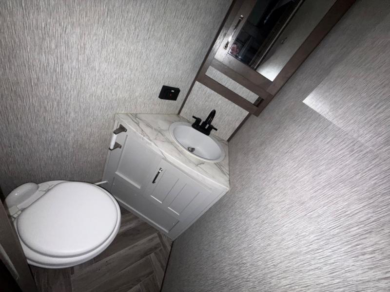 It's time to load up and head out with your in-laws and children to enjoy the great outdoors with your own accommodations a few steps away. The in-laws can sleep in the second bedroom in the rear on a full-size bed while the kids sleep above them in the loft with easy access up the ladder. You will have your own master bedroom on the opposite side with a king-size bed slide, a large wardrobe and a space prepped for a washer/dryer option if you like to keep everything clean while away. You will have a full bathroom with dual-sink vanity near you while the others will have a half bathroom with easy access to the outside using the second exterior entry/exit door. You can relax inside in the combined kitchen and living area or outside under the two power awnings. There is so much more to enjoy such as the four door refrigerator, the theater seats, and the large pantry!