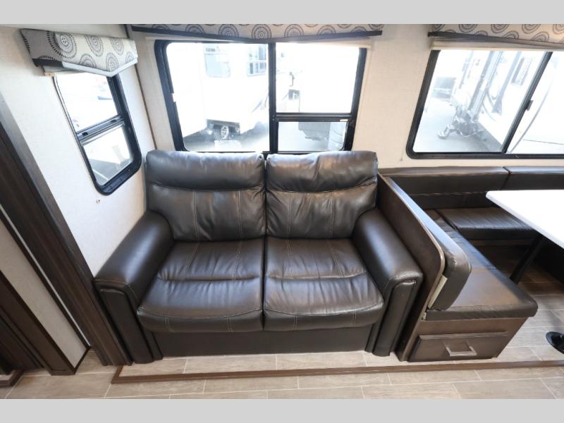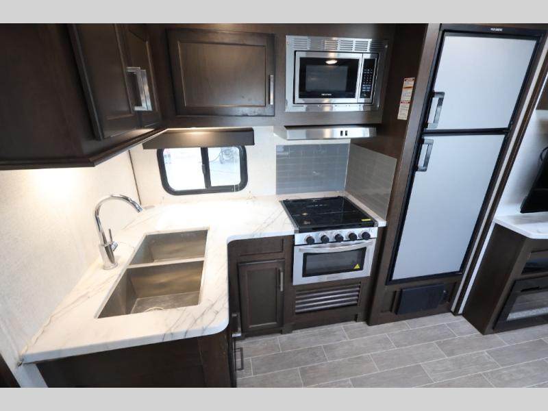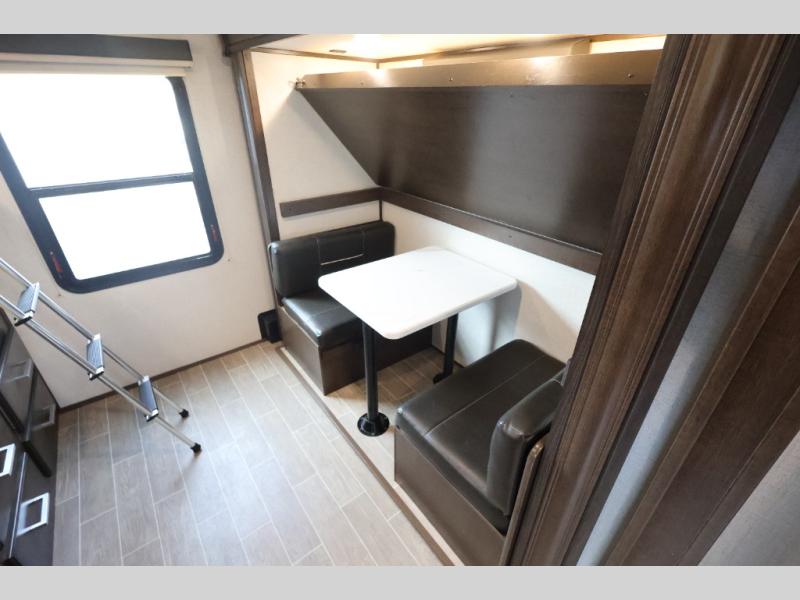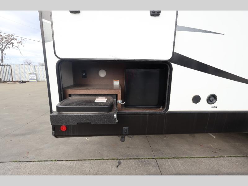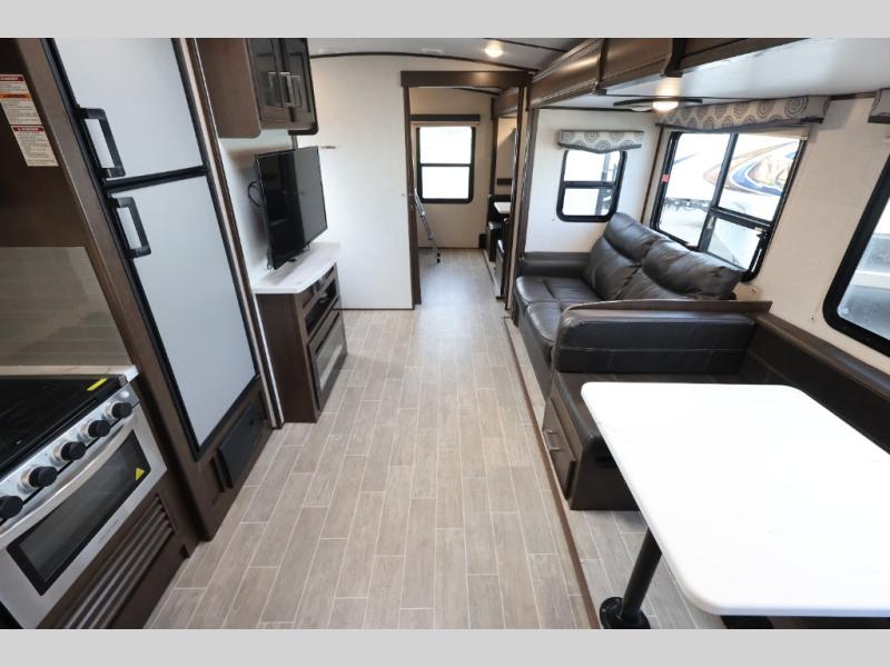 Load up your family for a fun outdoor adventure in this trailer. Let the kids have their own room in the rear private bunkhouse while you enjoy your privacy in the front bedroom with access to the outside with the second entry door and your own king-size bed. Since the walk-through bath has sliding doors on either side, you can even head discreetly into the shower in the morning from the bedroom. You can make meals and snacks in the L-shaped kitchen which offers an 8 cu. ft. refrigerator and walk-in pantry for plenty of food storage, plus you will love having an outdoor kitchen. The large slide in the main living area has a tri-fold sofa and U-shaped dinette so that there is plenty of space for all of you to come together for a movie night while enjoying the fireplace.
