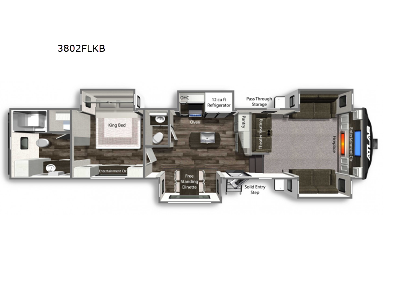 Plan to stay awhile in this spacious fifth wheel for six! Your crew will love to visit in the front living area that features a front entertainment center with a fireplace, plus theater seating and two tri-fold sleeper sofas. This area can double as a second bedroom for your guests, while you take the master bedroom with a king bed slide out. You'll find the full rear bath includes everything you need, and there is a convenient half bath right off of the kitchen for guests. This Atlas kitchen is any chef's dream with its 12 cu. ft. refrigerator, large pantry, and kitchen island with a stainless steel sink. And don't overlook the exterior with two power awnings with LED lights, a pass-through storage, plus Solid Step entry steps!