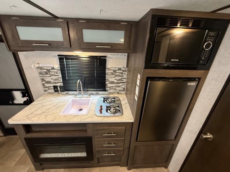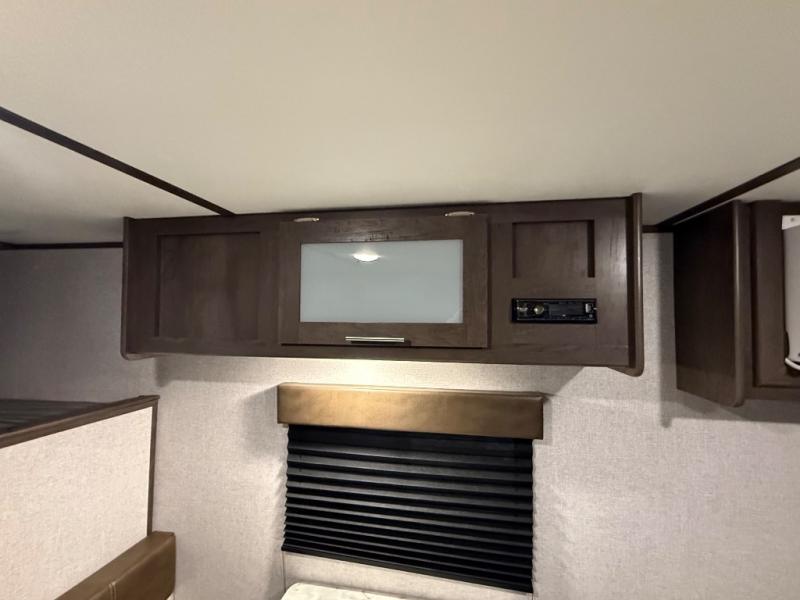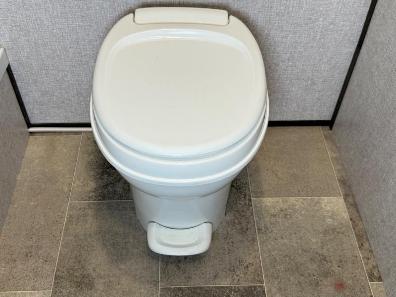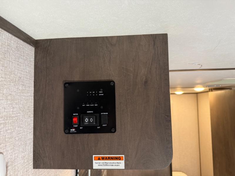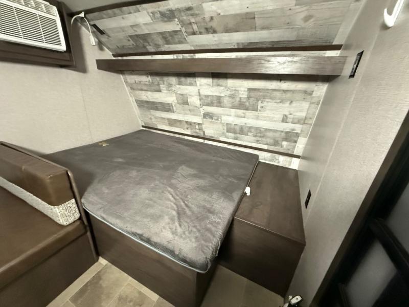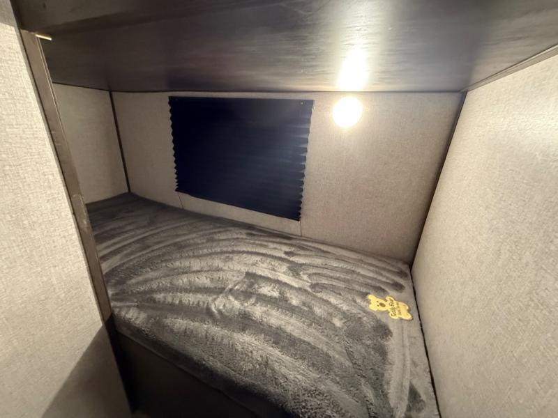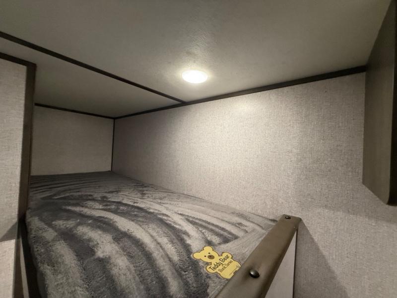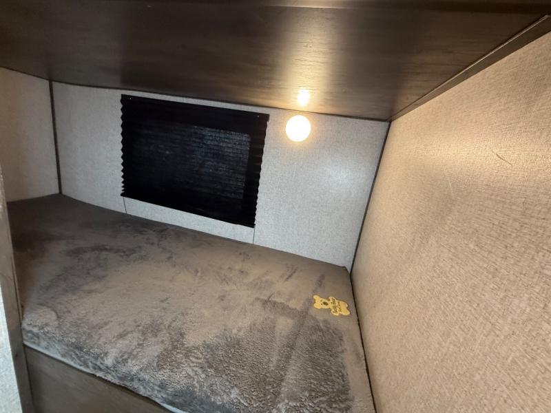 After making dinner on the two burner cooktop or inside the microwave, you can dine at the booth dinette or outside under the 8' power awning if you brought along your camping chairs. Either way you will be comfortable and the dinette may even sleep one person if needed. After playing outdoors all day, everyone can return to get cleaned up in the private toilet and shower room then fall asleep on the queen bed up front or the bunk beds in the rear. And everyone can wake up the next morning to do it over again.