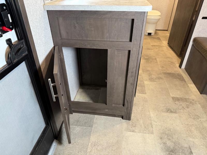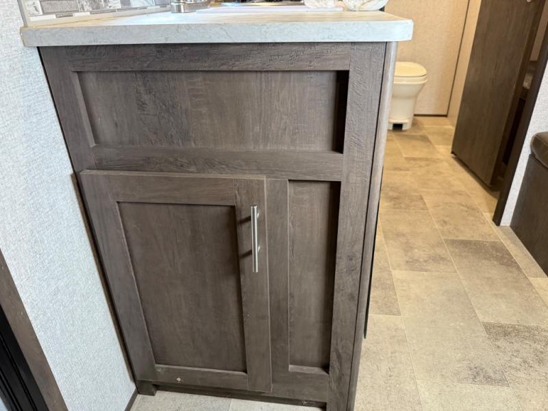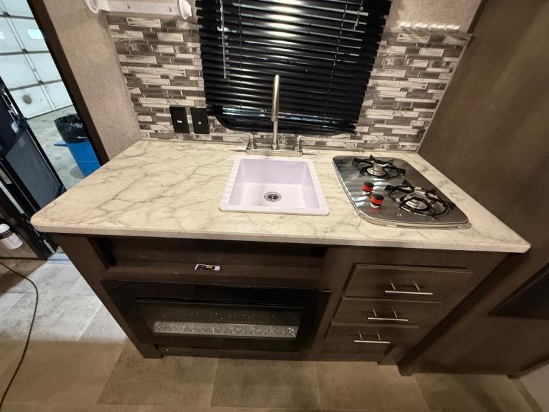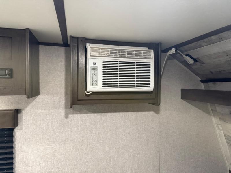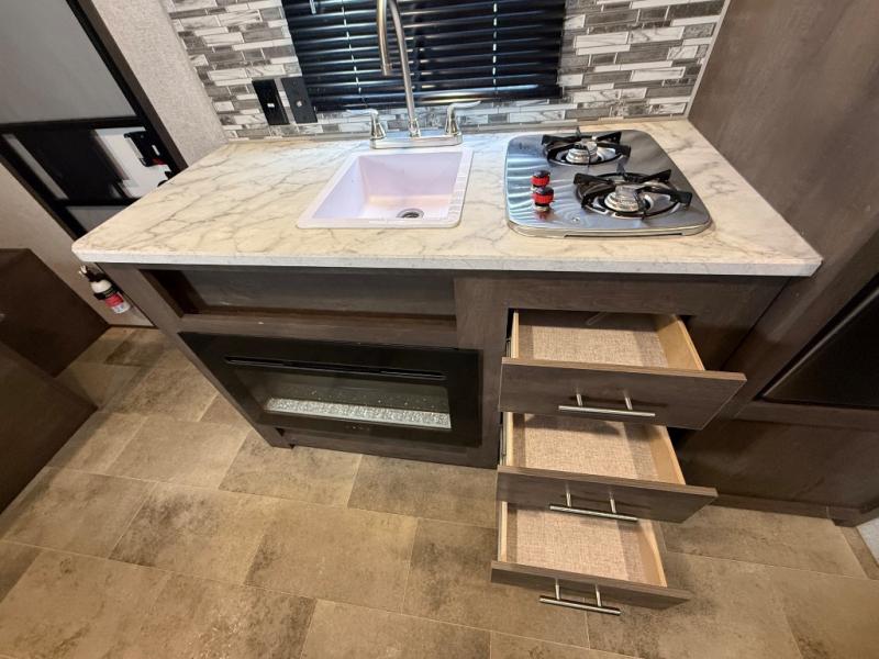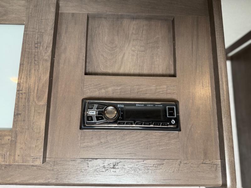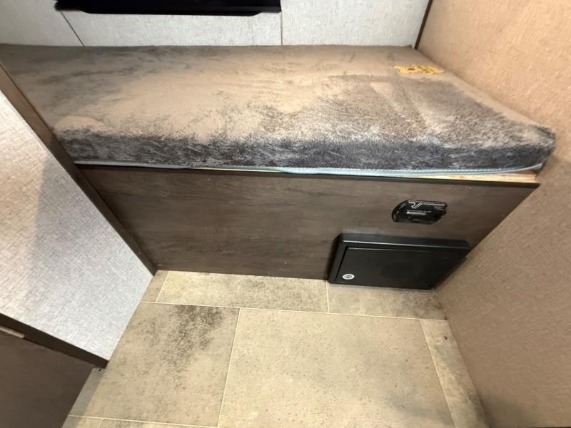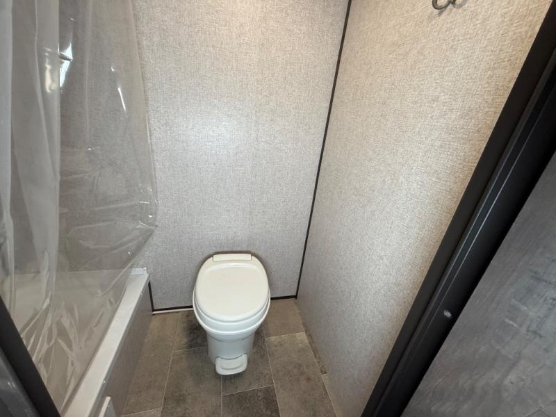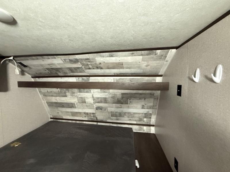 After making dinner on the two burner cooktop or inside the microwave, you can dine at the booth dinette or outside under the 8' power awning if you brought along your camping chairs. Either way you will be comfortable and the dinette may even sleep one person if needed. After playing outdoors all day, everyone can return to get cleaned up in the private toilet and shower room then fall asleep on the queen bed up front or the bunk beds in the rear. And everyone can wake up the next morning to do it over again.
