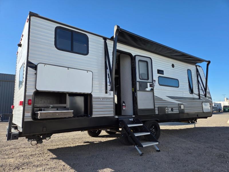 Your family of seven or eight will love this trailer with double-size bunk beds for four, a queen bed for two and a U-shaped dinette for one or two more! The cook will love the large farm sink when washing up after making a meal with the kitchen amenities, and the large pantry behind the hinged entertainment center is super handy when packing for a trip. The outside kitchen is a great addition to the trailer since you can cook while watching the kids play around the campsite. And the 16' power awning offers an additional living space protected from the elements.
