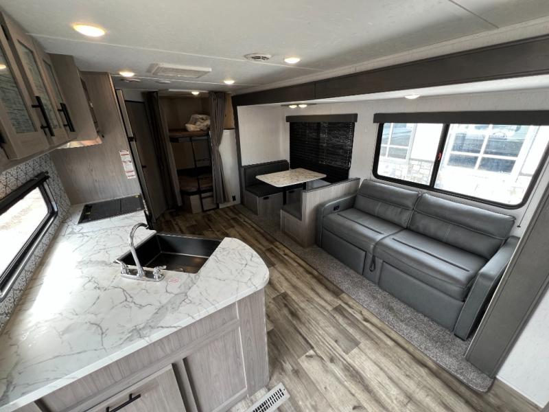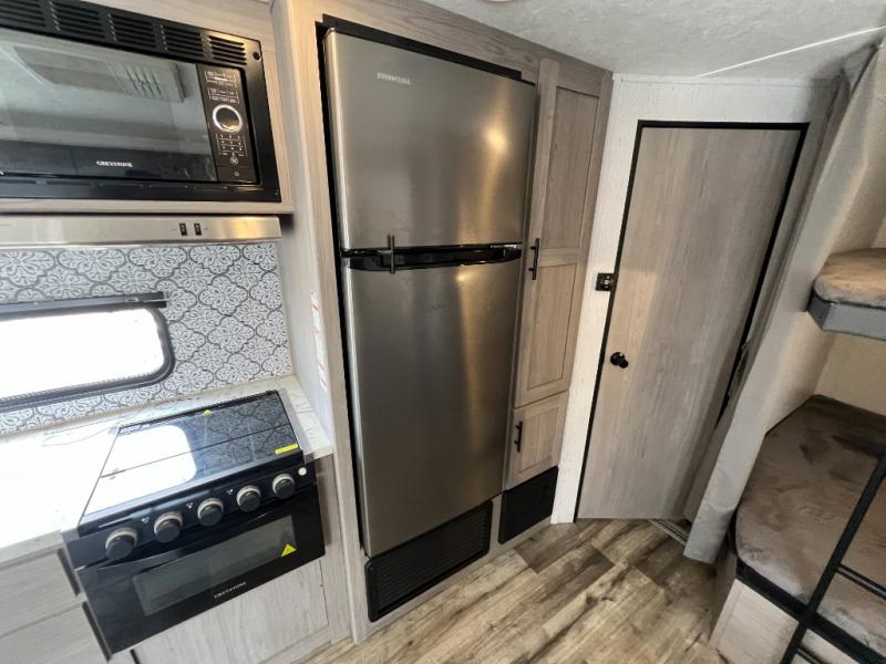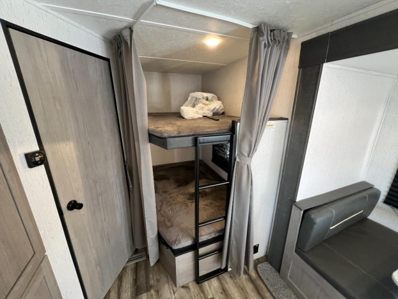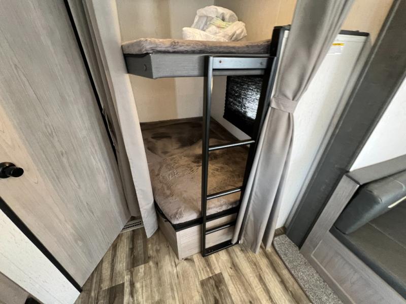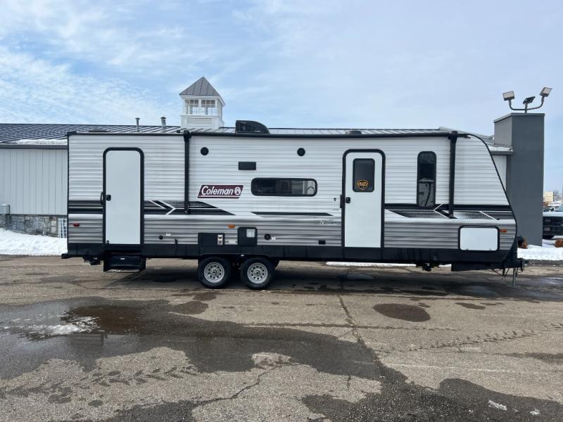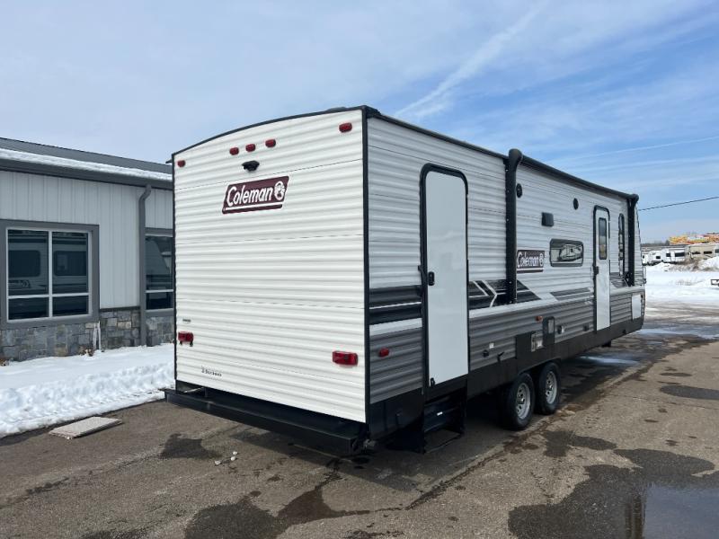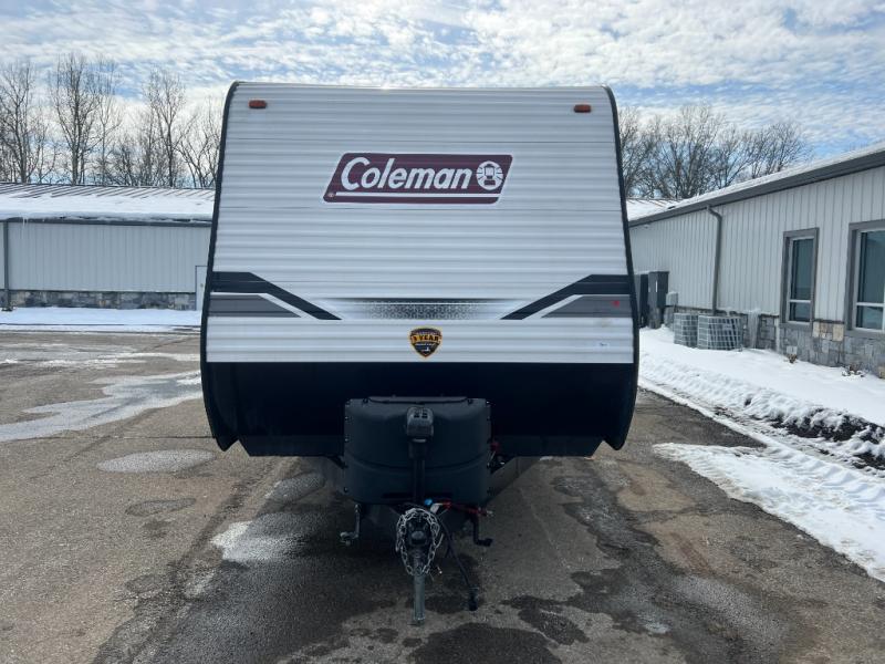 This Coleman Lantern Series travel trailer will provide you and your family with comfort and convenience while you enjoy the great outdoors. You might even meet other RV owners to camp with as well. From having your own private bedroom with wardrobe space and USB power outlet to your kids having double-size bunks, you will not be missing home at all. The cook can make meals while the others take turns getting ready in the full bathroom, and the second exterior entry door into the bathroom is a huge convenience for many reasons. Make this model yours today!