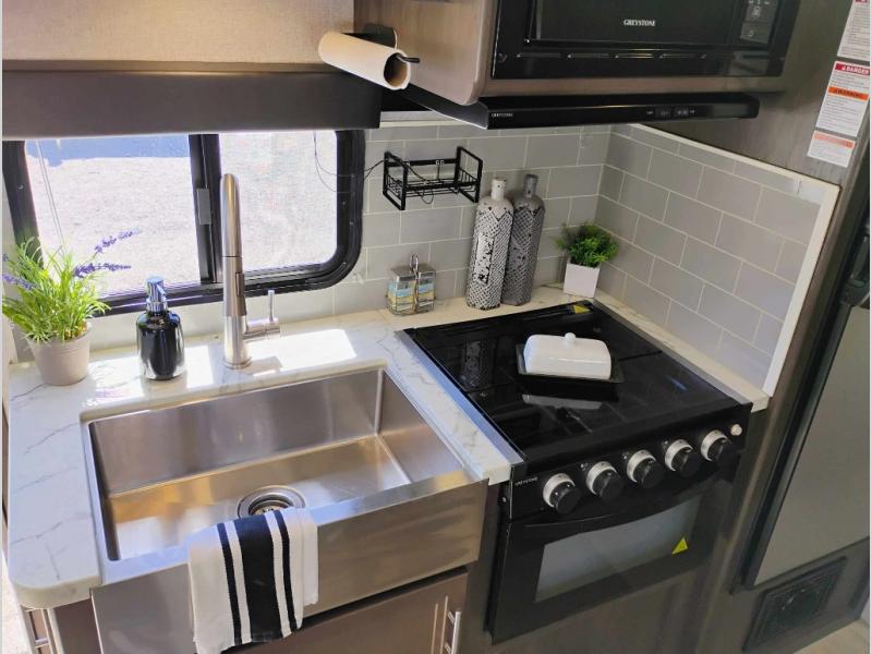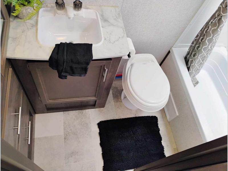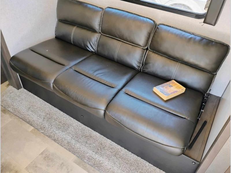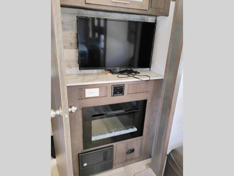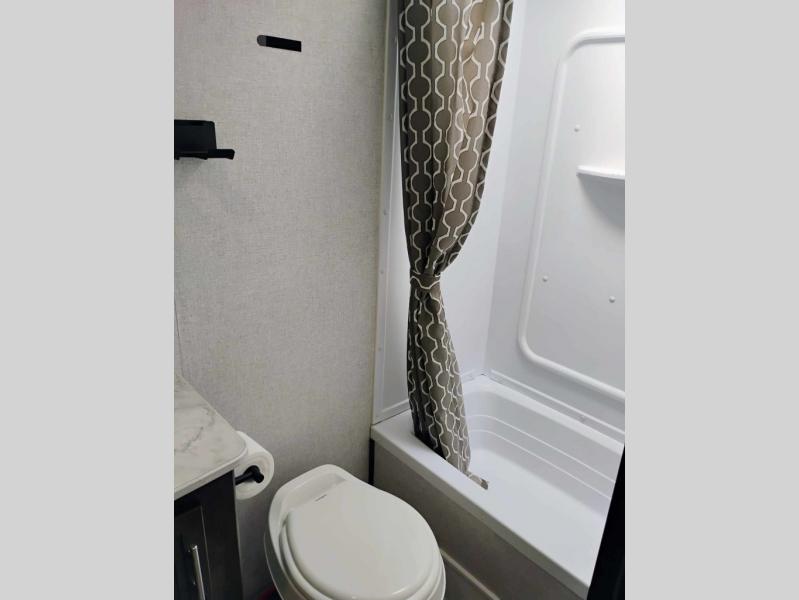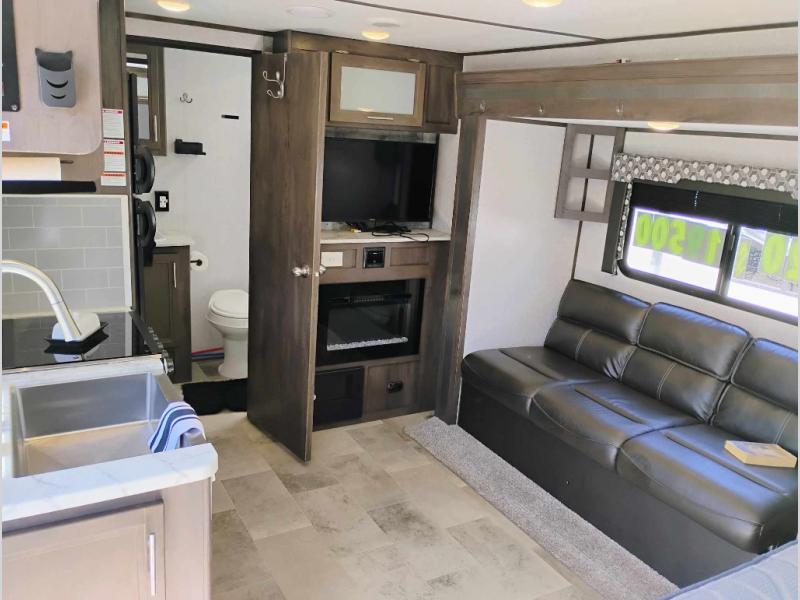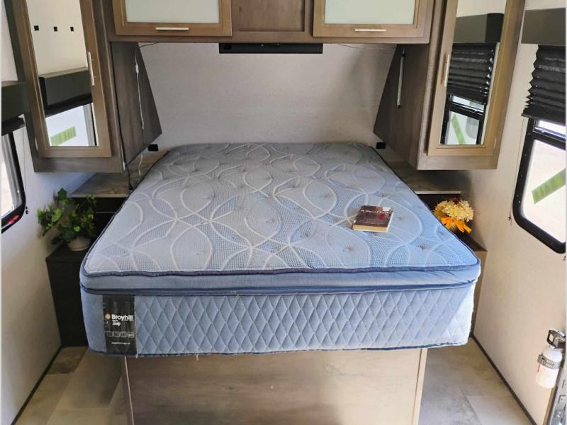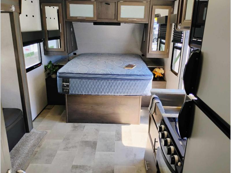 Take one look inside this Coleman Light travel trailer and you will throw away your tent! The handy indoor/outdoor table can be placed in several locations, including in front of the fold-down sofa on the single slide out. The queen bed at the front of this trailer is perfect for a good night's rest, and with nightstands on both sides of the bed, you'll have a place for your things. The rear bathroom is conveniently out of the way, and the kitchen is a great place to spend time cooking dinner or heating up leftovers in the microwave.