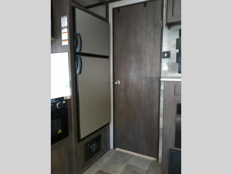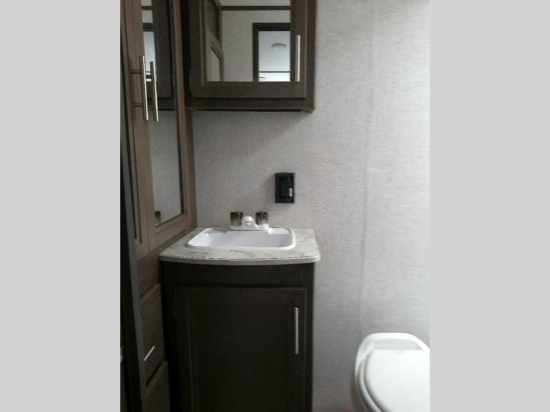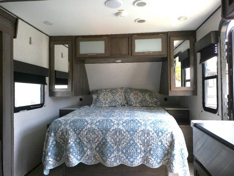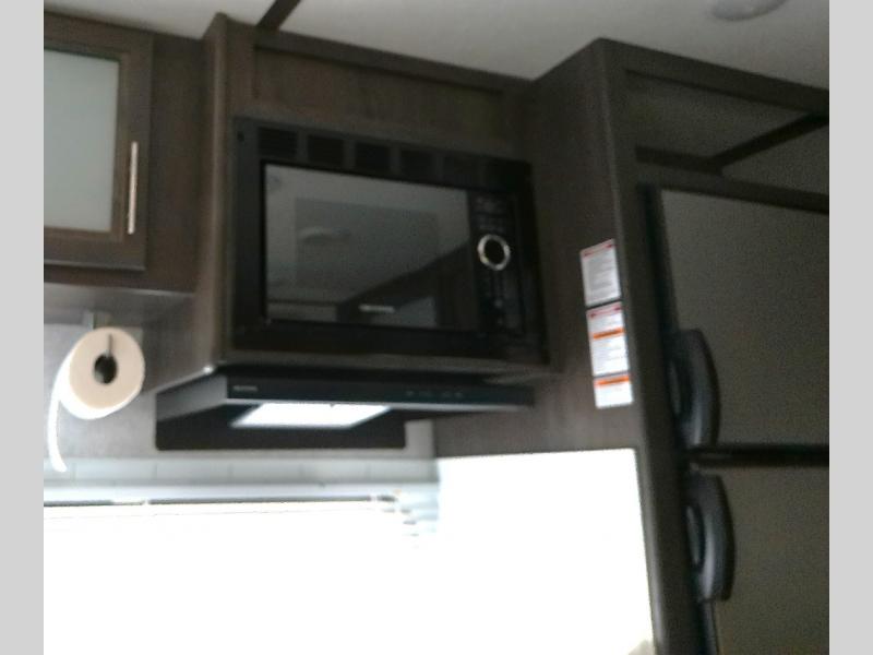 Take one look inside this Coleman Light travel trailer and you will throw away your tent! The handy indoor/outdoor table can be placed in several locations, including in front of the fold-down sofa on the single slide out. The queen bed at the front of this trailer is perfect for a good night's rest, and with nightstands on both sides of the bed, you'll have a place for your things. The rear bathroom is conveniently out of the way, and the kitchen is a great place to spend time cooking dinner or heating up leftovers in the microwave.