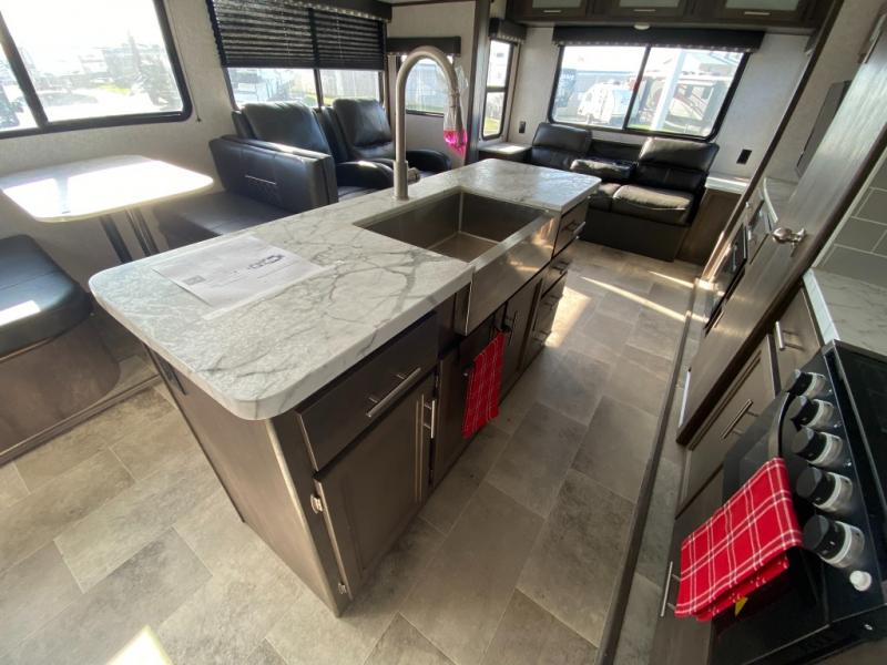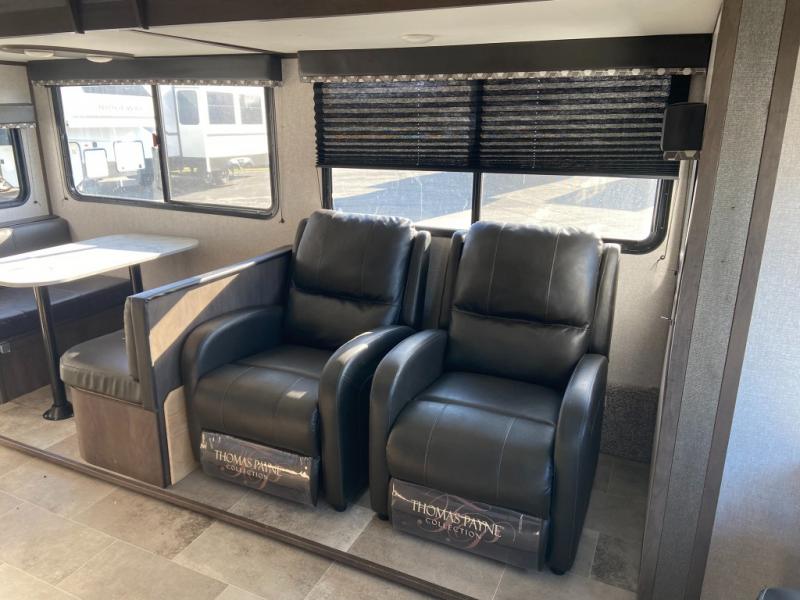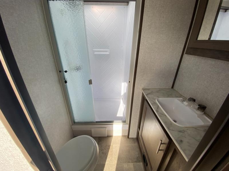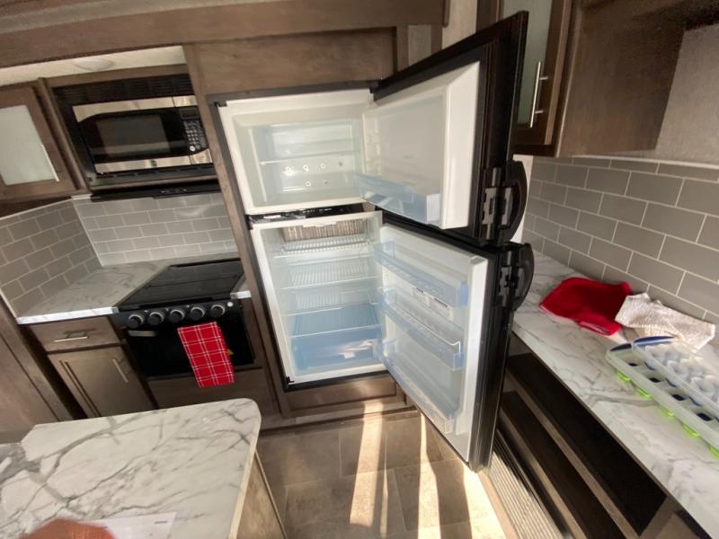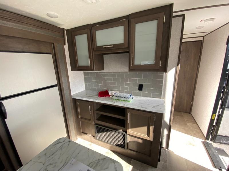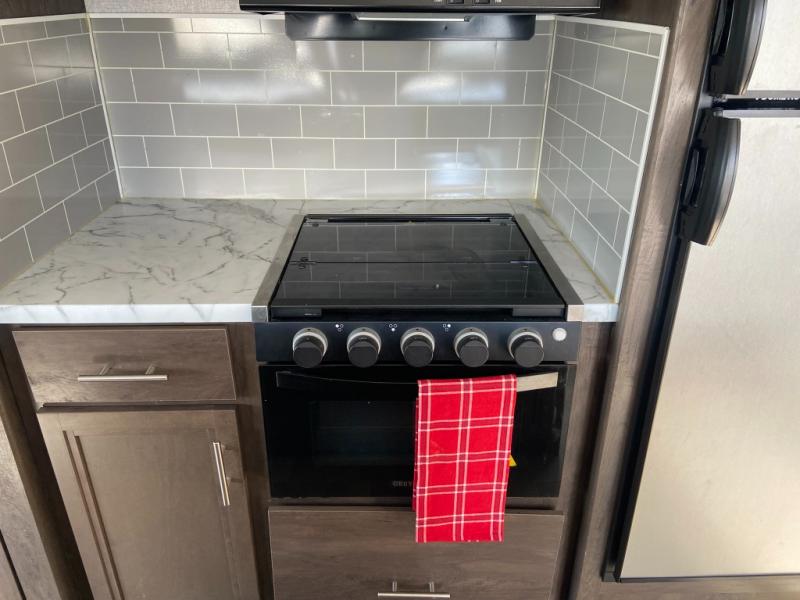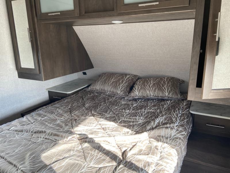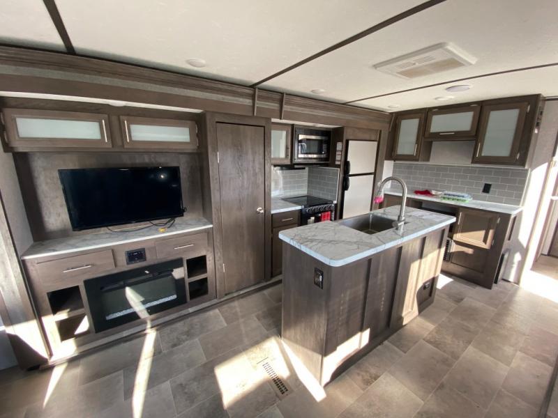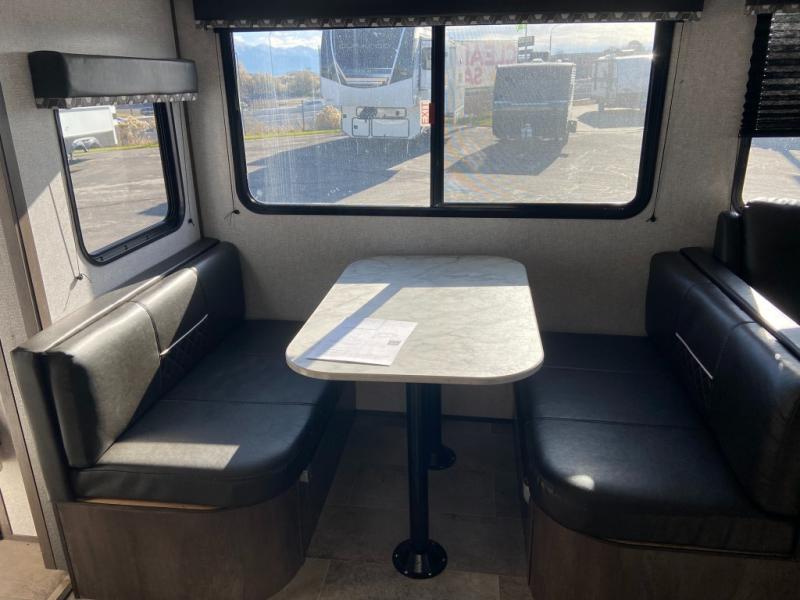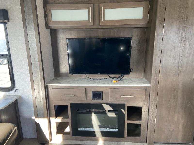 No matter where it is that you prefer to travel, this Coleman Light travel trailer will make it feel like home! You can cozy up on the sofa with end tables or in one of the two swivel rockers in front of the fireplace while you wait for the group's chef to prepare dinner in the spacious kitchen. Use the booth dinette to sit down and enjoy that hot meal, and after you are done eating, you can quickly change your clothes in the full bathroom before heading out for a starlit walk around the campground.