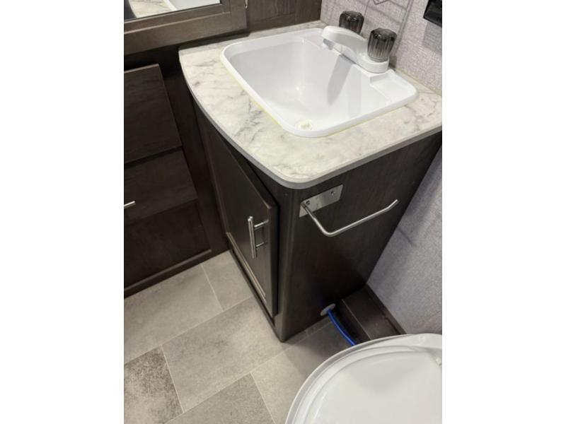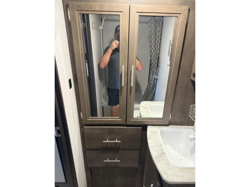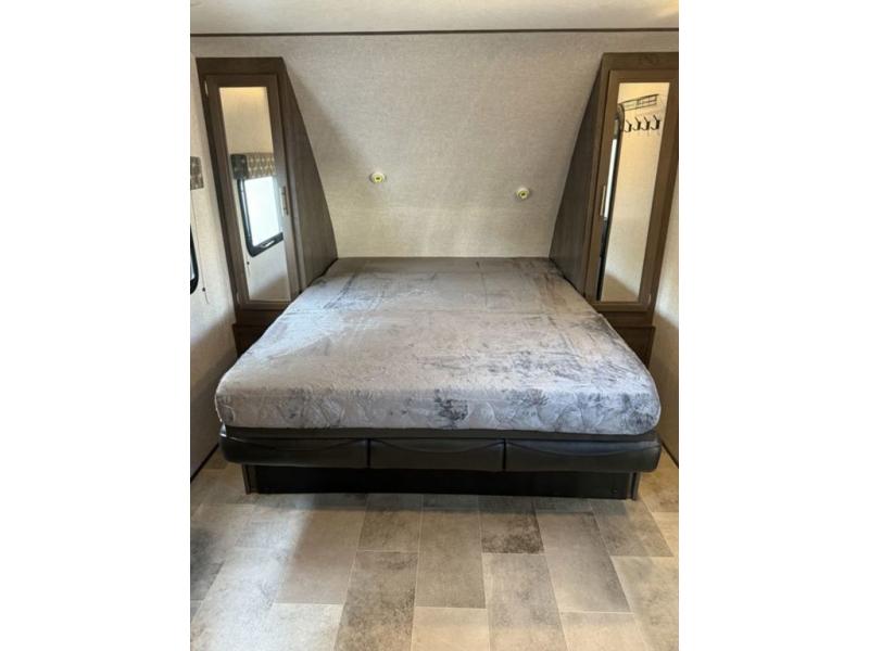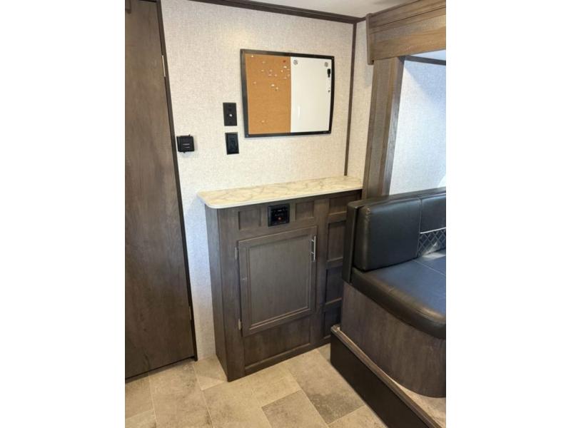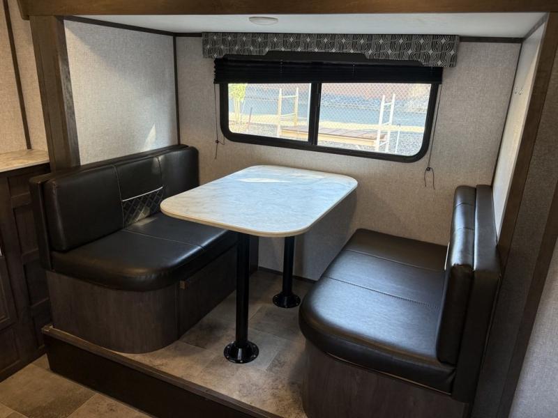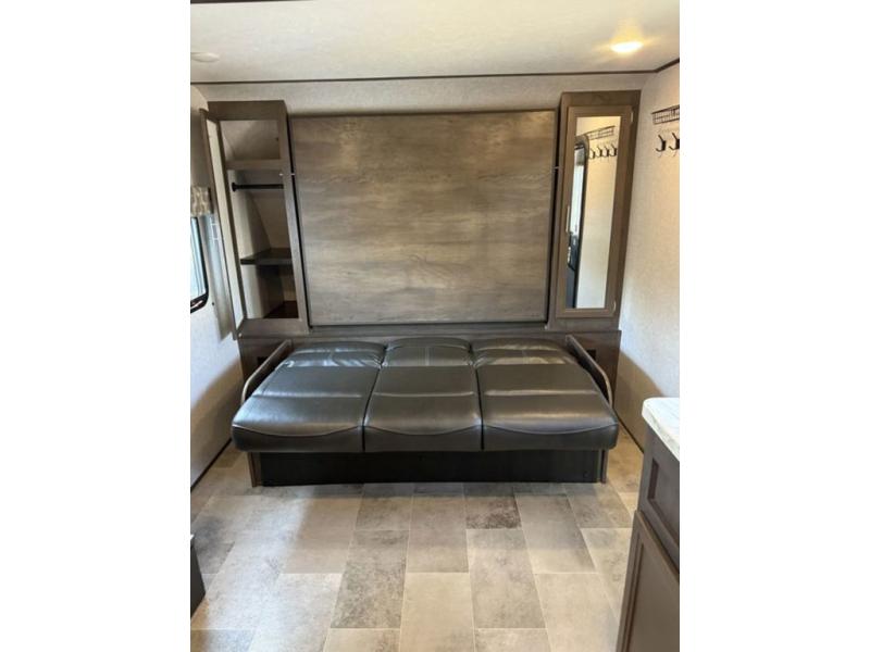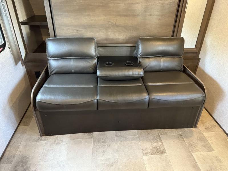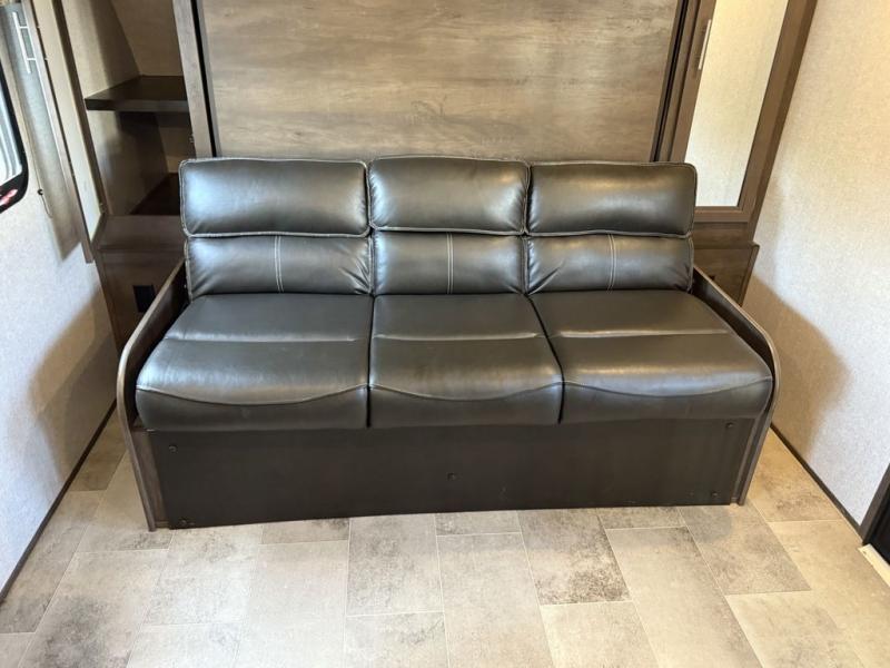A couple will love this trailer with a slide out booth dinette giving them more floor space to move around from the front to the back and from the dinette to the kitchen appliances. You'll also find the full rear bath is both spacious and accommodating with its shower and its linen cabinet for fresh towels, and the versatile front Murphy bed and sofa offer a bedroom at night and a living area during the day. You can also relax outside under the 14' power awning giving you another living area outdoors.
