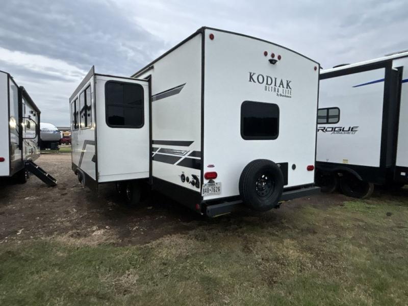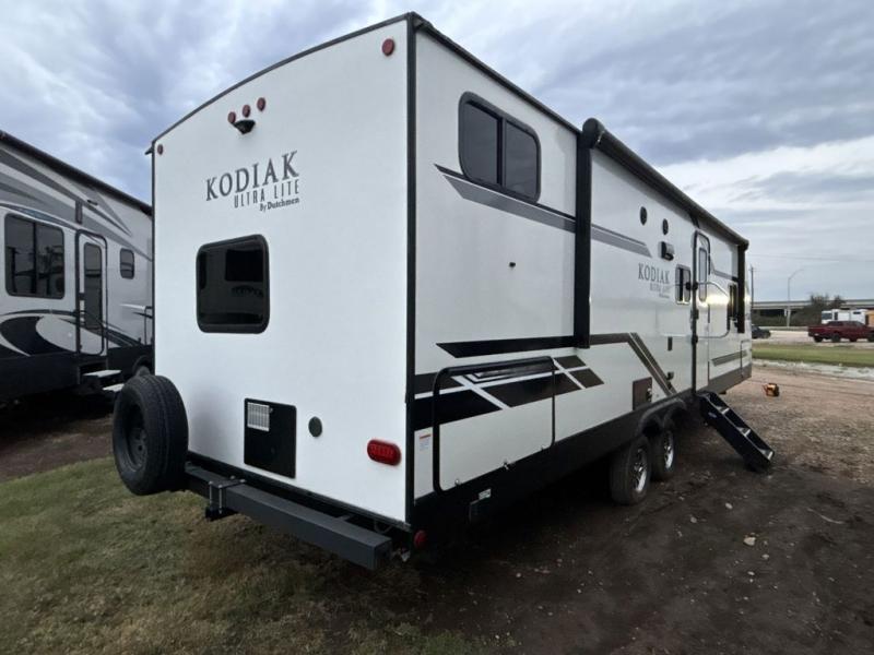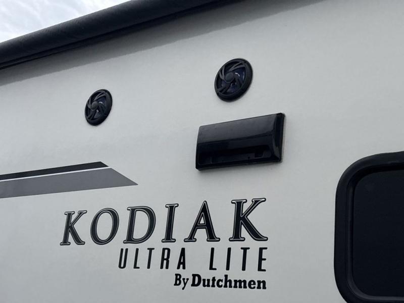 Let your next set of travel plans include the Dutchmen Kodiak Ultra-Lite travel trailer! You'll be glad you did when you find out that these trailers have an aluminum super-structure design making them perfect to tow behind most vehicles. You can use the central control station to operate your trailer's electrical functions, and you'll appreciate having a spare tire and carrier in the event of a mishap on the road. Sit outside underneath the power awning with LED lights each night to enjoy time spent together in the fresh air, and use the AM/FM/CD/DVD stereo and exterior speakers to provide some extra entertainment while you're outside.