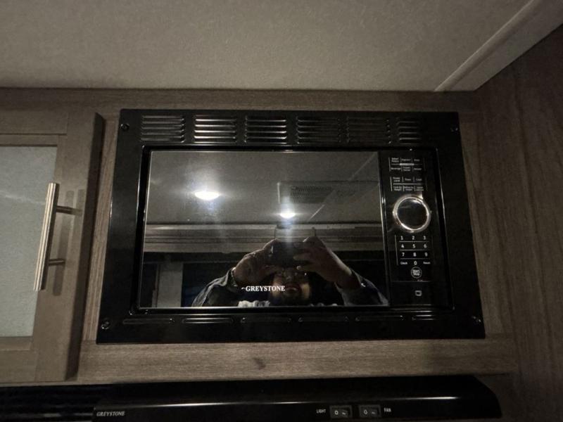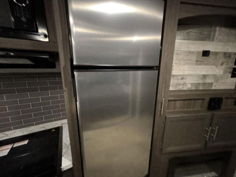 You can camp whenever you want with your spouse or your whole family with sleeping space for nine or ten happy campers in this Kodiak Ultra-Lite travel trailer. Four campers can sleep in the private bunkhouse while others use the living room furniture once it's set up for bedtime. No worries about falling asleep quickly since you have your own private bedroom up front with a residential queen bed. In the morning, everyone can gather under the awning while someone cooks on the outside kitchen, or you can choose to stay indoors while relaxing and watching the hinged entertainment center at whichever angle you choose while the cook makes breakfast with full amenities.