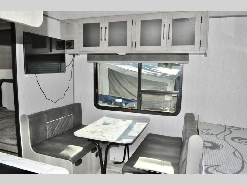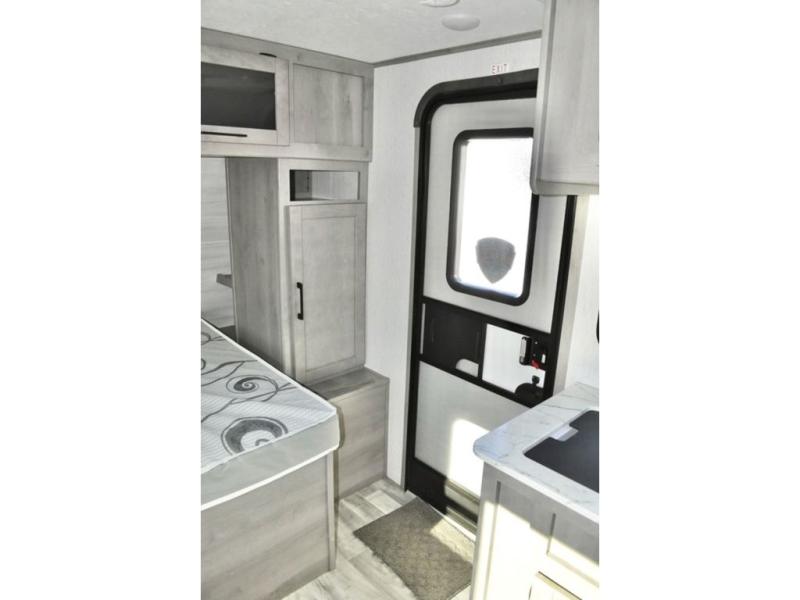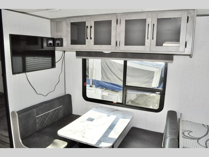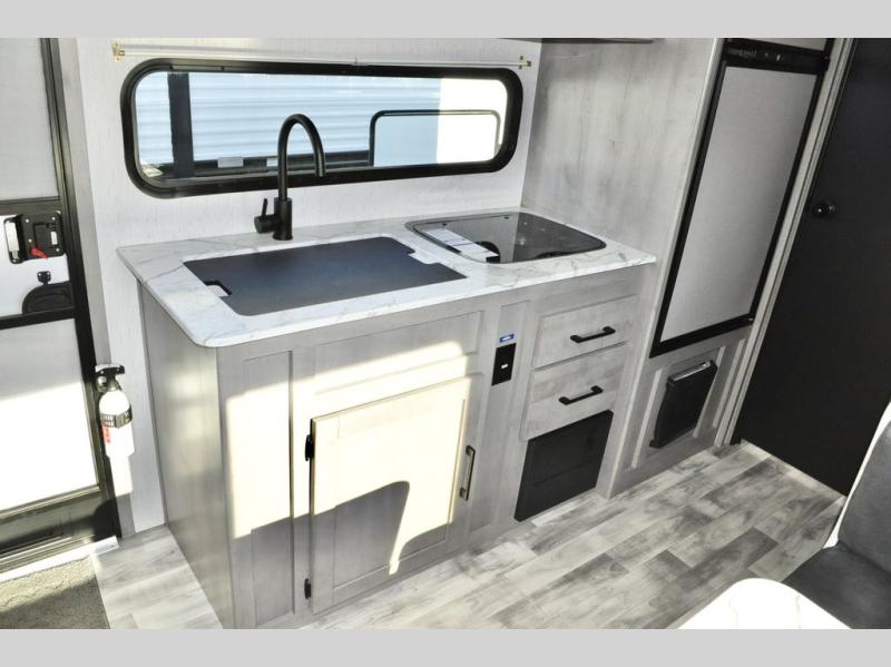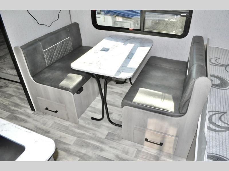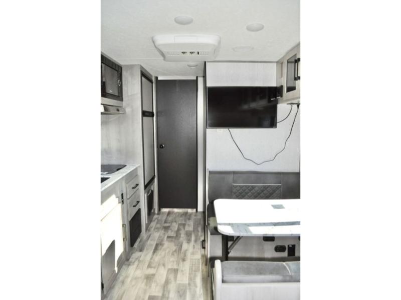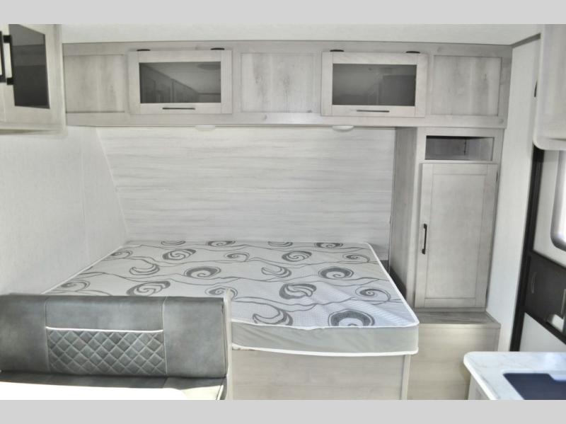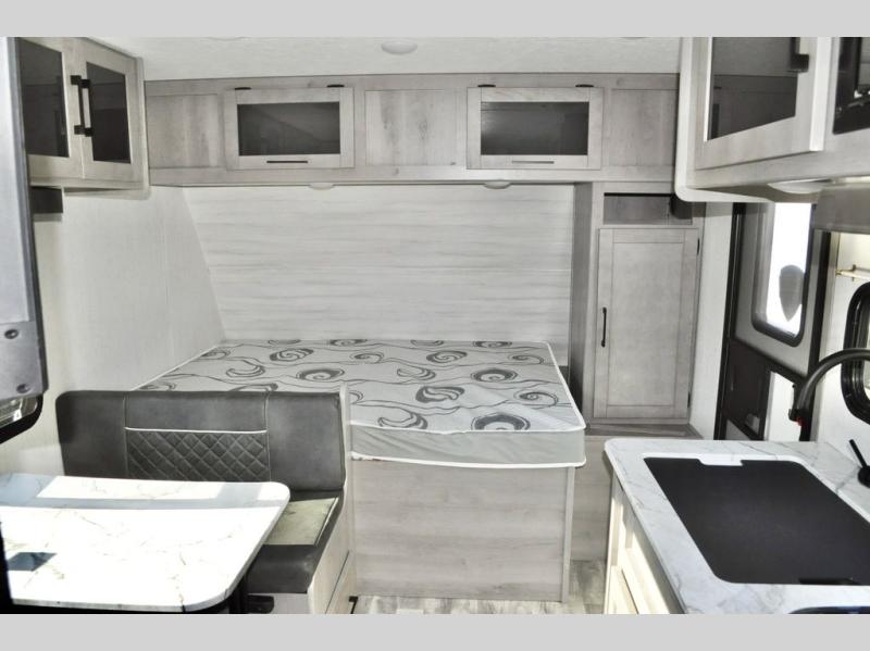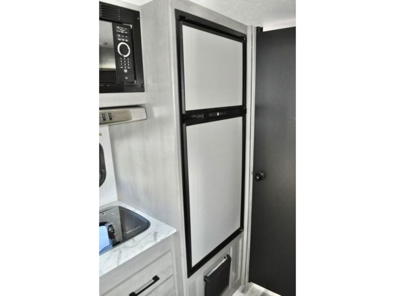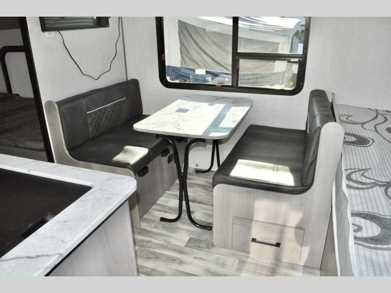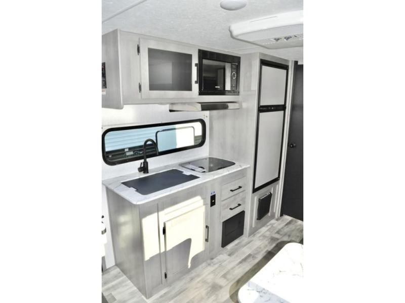 There is sure to be a Dutchmen Kodiak Cub travel trailer that will suit your needs! These trailers are light enough to be towed by most SUVs and minivans, and they come with premium features like hybrid aluminum steps, a 13,500 BTU air conditioner, a fully enclosed and heated underbelly, and preparations for solar panels. The exterior has a front diamond plate protection for extra sturdiness, and the power awning with LED lights can be used whenever you need some extra protection from the sun or rain. There are stainless steel appliances on the interior for a modern look, and the walnut cabinet doors and subway tile backsplash accent the one-piece seamless countertops very nicely.