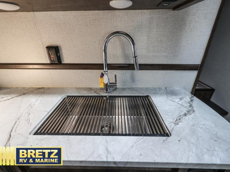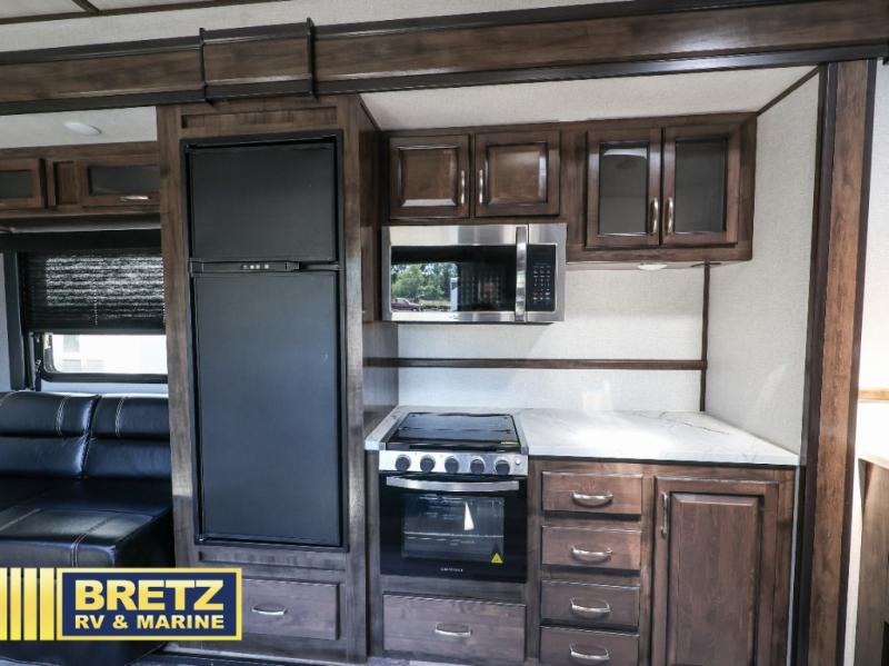 Get together with your favorite campers to pack up this Voltage Triton toy hauler and hit the road in style! When you get to the campsite, you'll want to set up the 18' electric awning with LED lights, remove your toys from the garage, put the opposing sofas and table into place, and lower the Happi-Jack power bunk. The large slide in the main living area can be pushed out into place so that you have extra room to cook on the Furrion three-burner range and 21" oven in the kitchen, and then you can sit down on the third sofa with table to enjoy that meal. Up at the front of this unit you will find a master suite where you can relax for the evening.