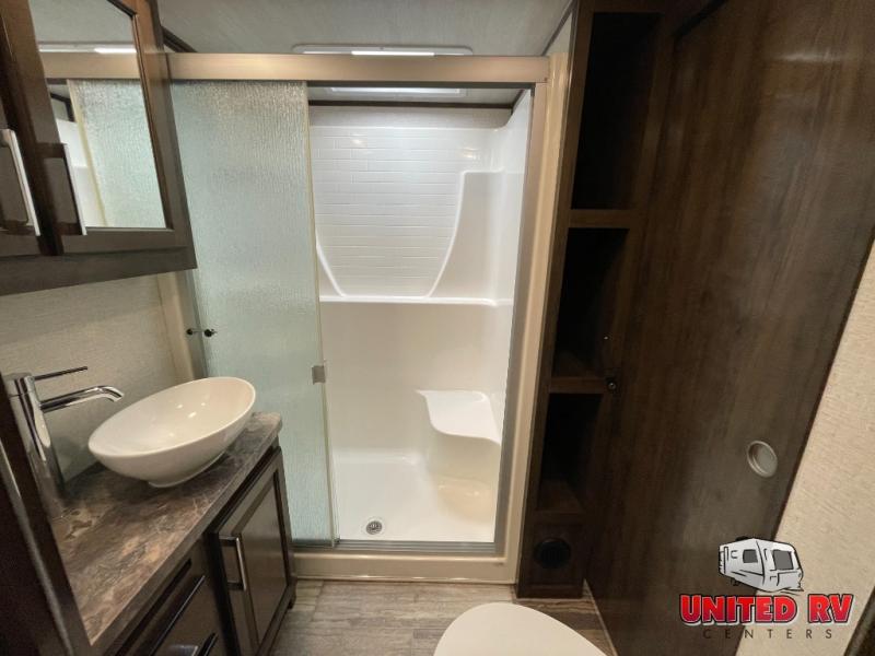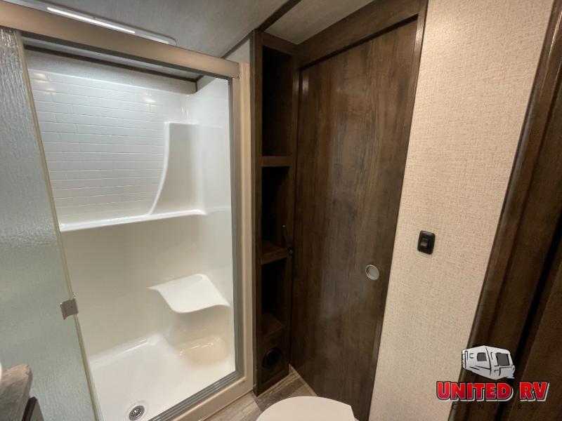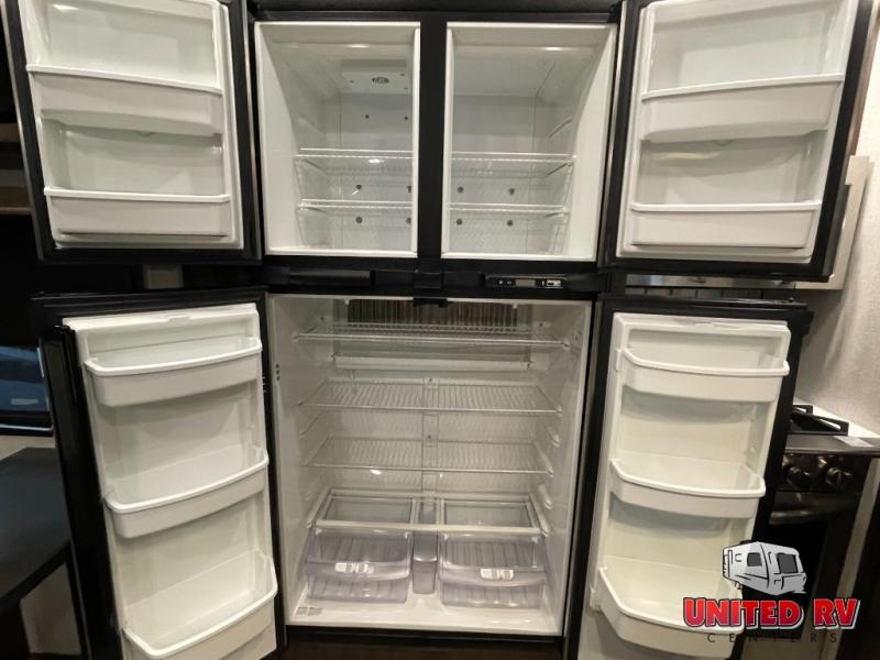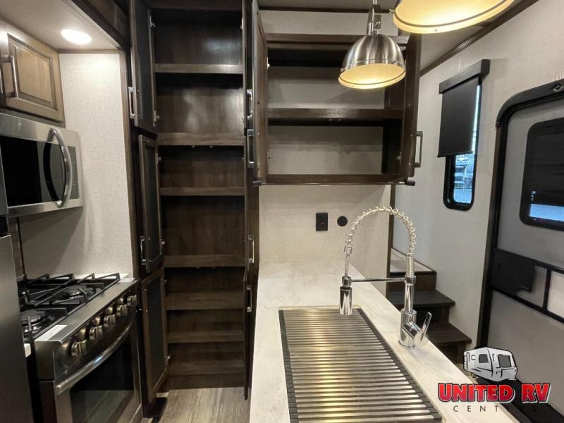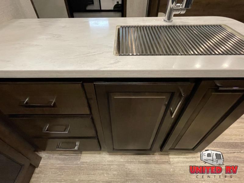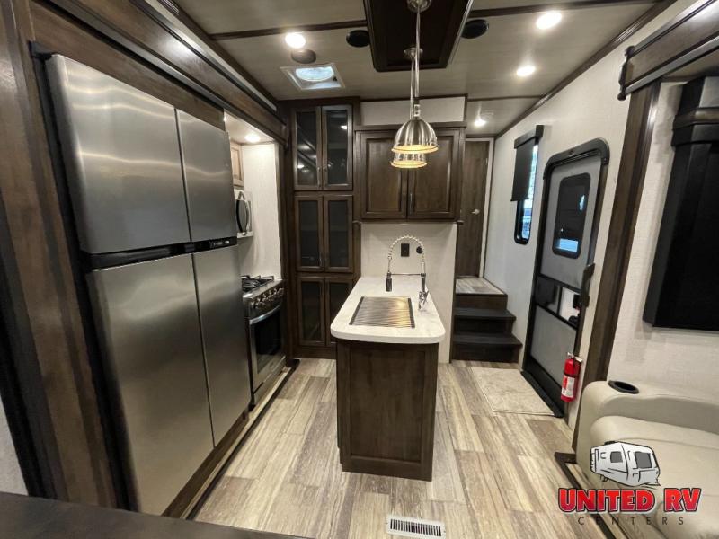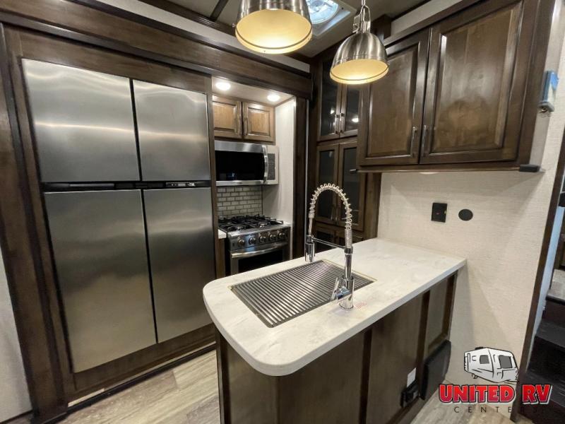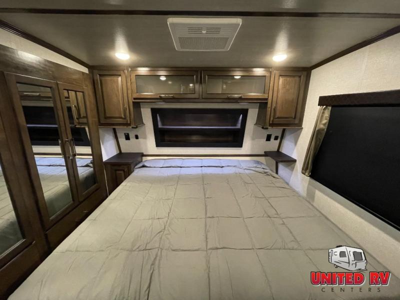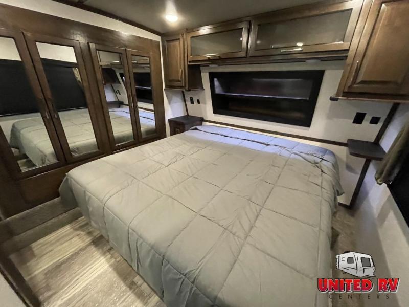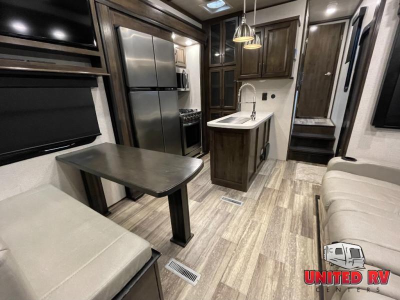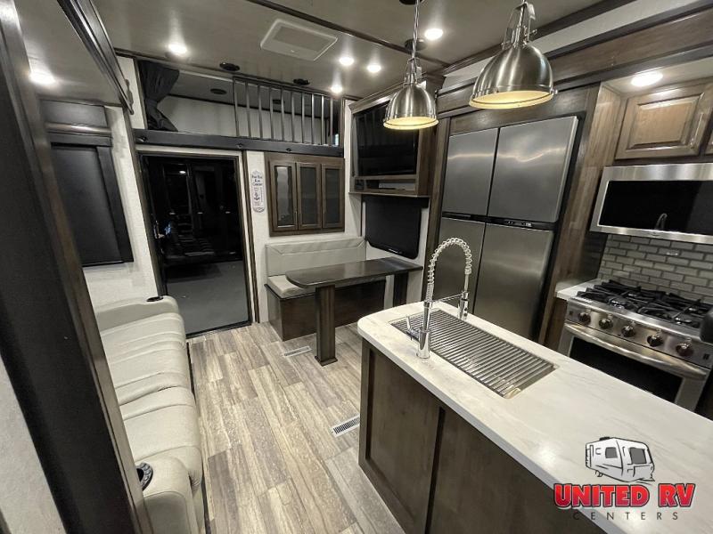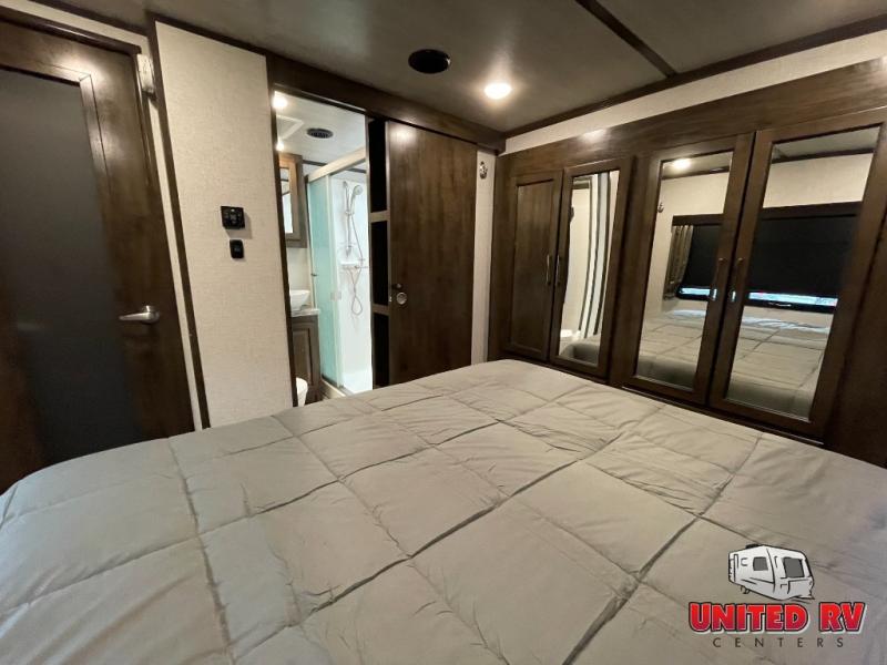 You will be extremely impressed by the amount of luxury found on the Dutchmen Voltage fifth wheel toy hauler! Some of the premium features that you will find on the Voltage are the Zero-Gravity ramp door that lets you access your toys with very little effort and the king-size bed which offers you extra space for sleeping comfortably. The Voltage also has industry-leading 7'-tall slides so that you can feel free to stretch your legs while inside. The ramp door patio system is certainly going to be an appealing factor because it provides you with an extra party space, and the dedicated heat ducts for the underbelly and the All-Weather Package with additional insulation will ensure that your Voltage is protected and prepared for all sorts of weather.