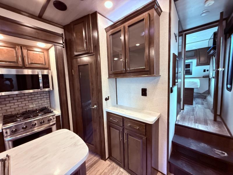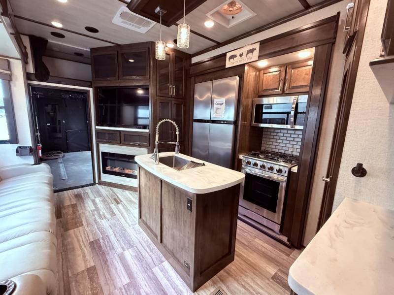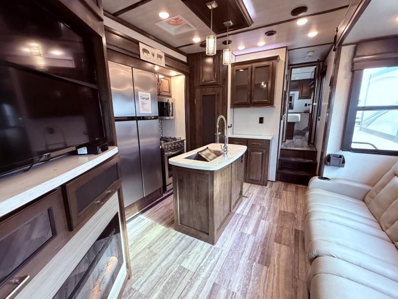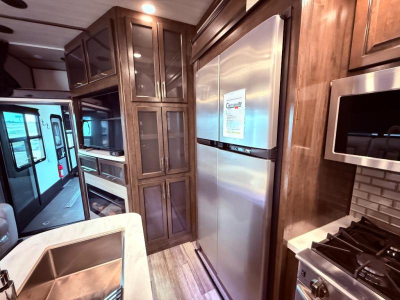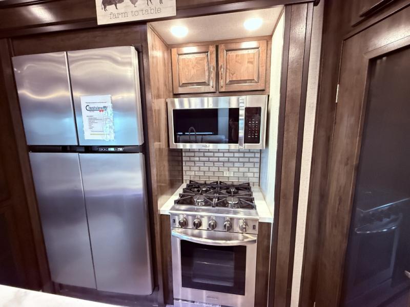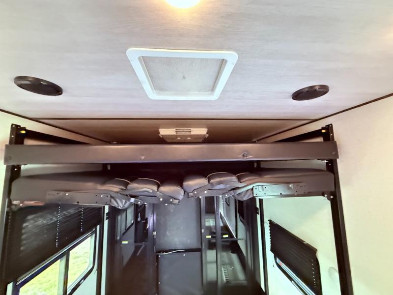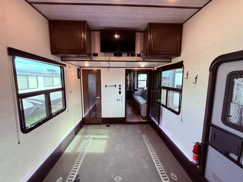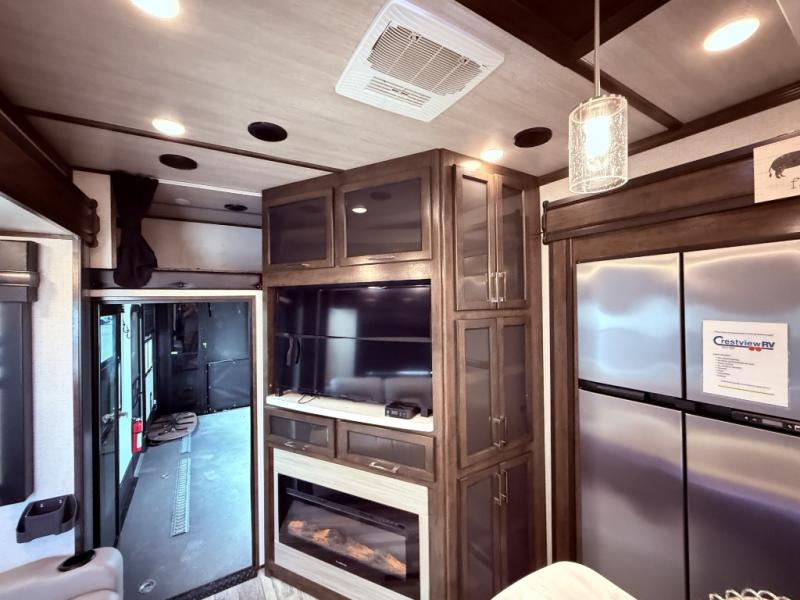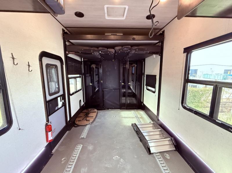 There is so much convenience packed into this Voltage toy hauler! The 15' separate garage comes equipped with a half bathroom, a garage TV, the second exterior entry door, and sleeping accommodations which will provide you with an excellent guest suite. You will actually have your own master suite with a king-size bed up at the front of this unit, and everyone will benefit from the exterior entertainment center. The main kitchen/living area has two opposing slides so that you can sit back on the residential sofa with heat and massage as you take in the warmth of the fireplace, and the pendant lighting above the kitchen island is a stunning addition to the fully equipped kitchen.