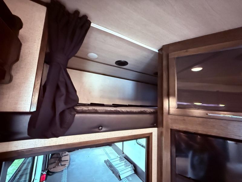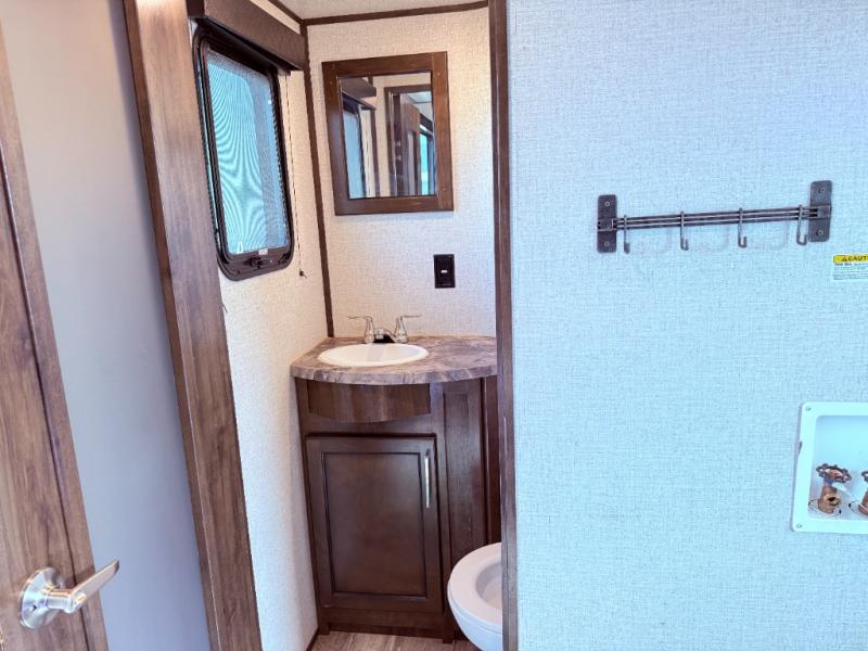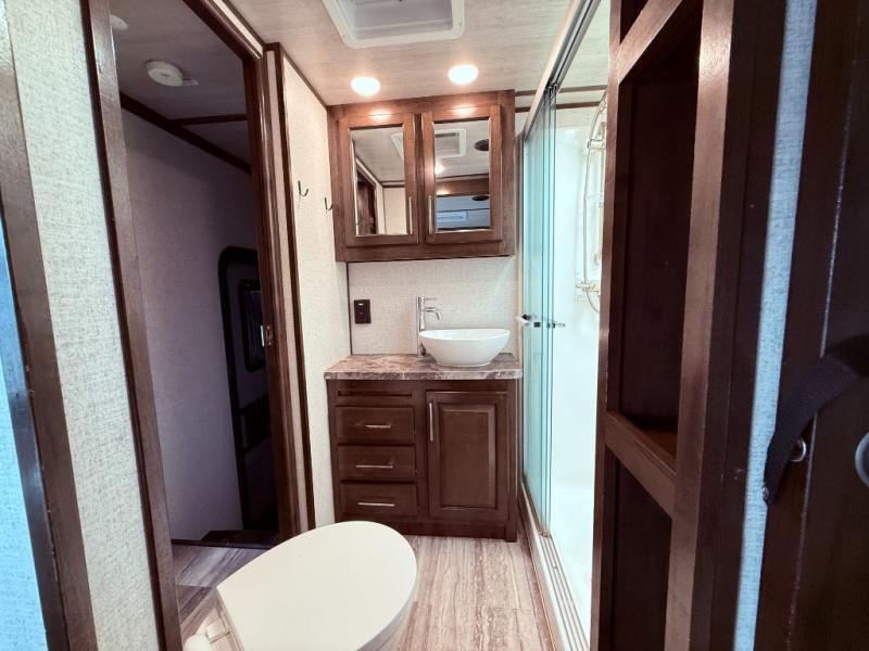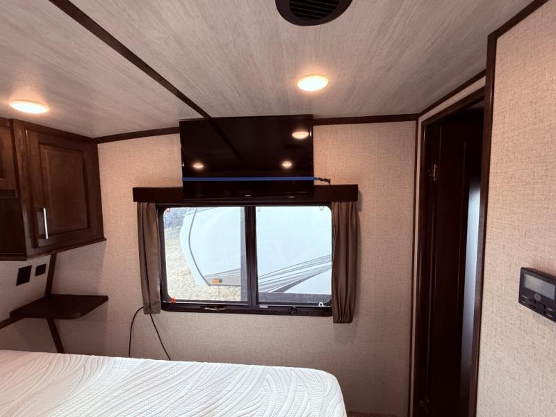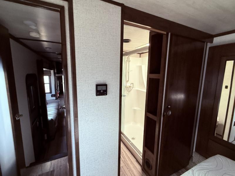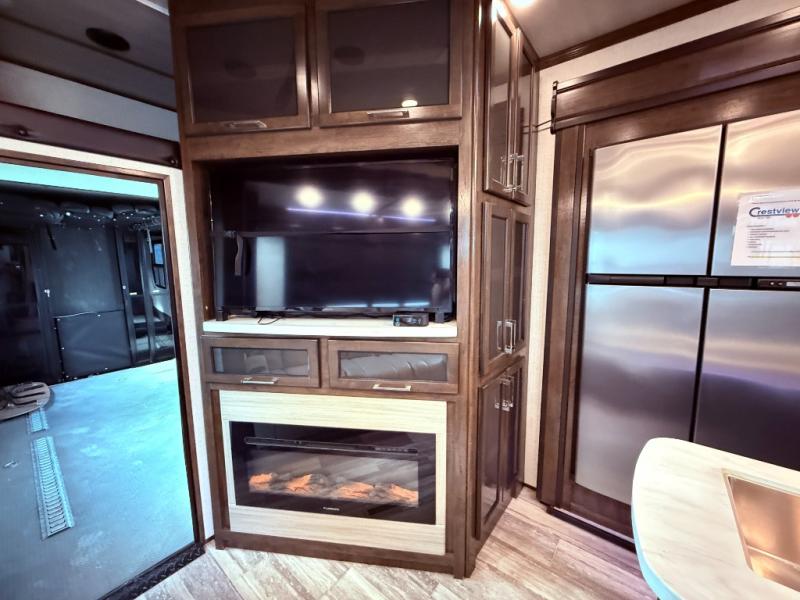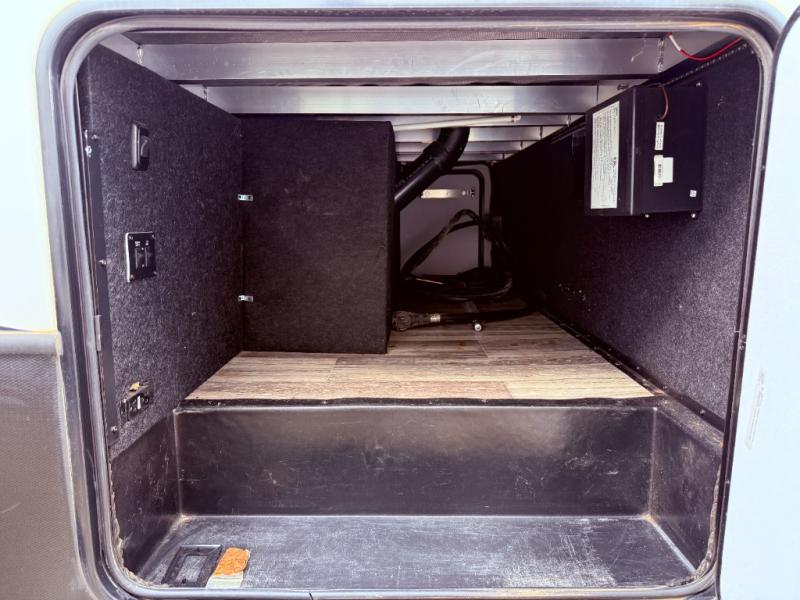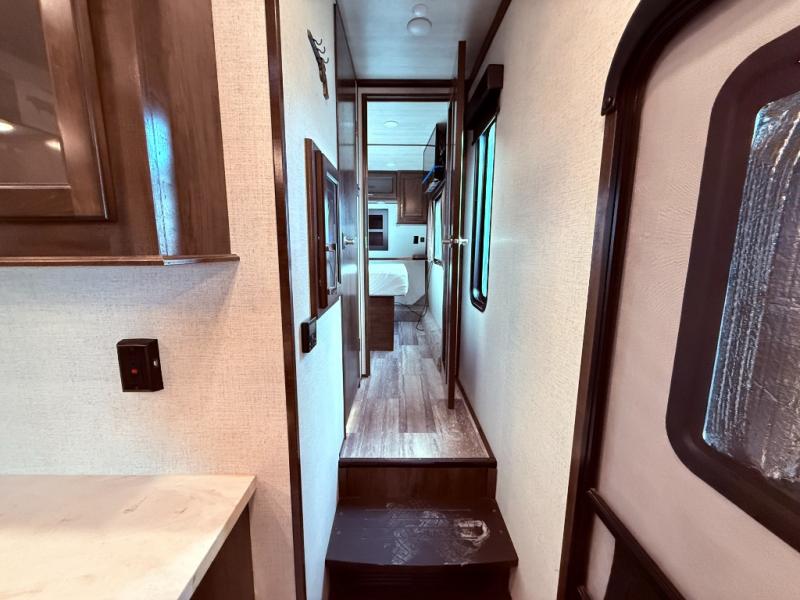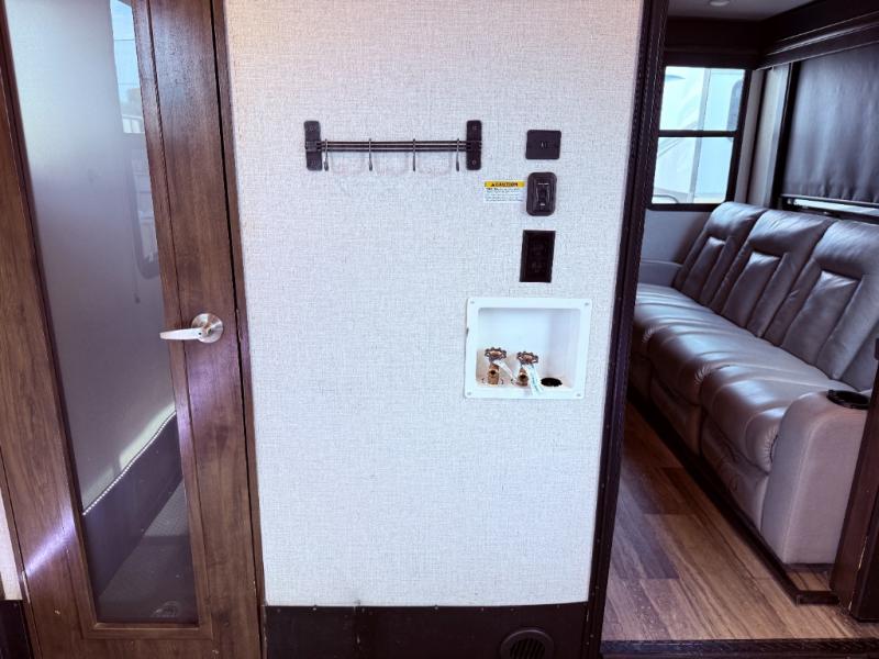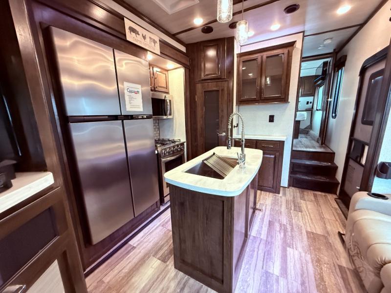 There is so much convenience packed into this Voltage toy hauler! The 15' separate garage comes equipped with a half bathroom, a garage TV, the second exterior entry door, and sleeping accommodations which will provide you with an excellent guest suite. You will actually have your own master suite with a king-size bed up at the front of this unit, and everyone will benefit from the exterior entertainment center. The main kitchen/living area has two opposing slides so that you can sit back on the residential sofa with heat and massage as you take in the warmth of the fireplace, and the pendant lighting above the kitchen island is a stunning addition to the fully equipped kitchen.