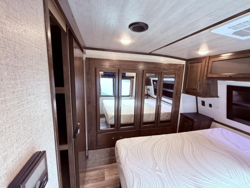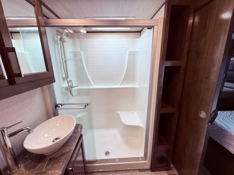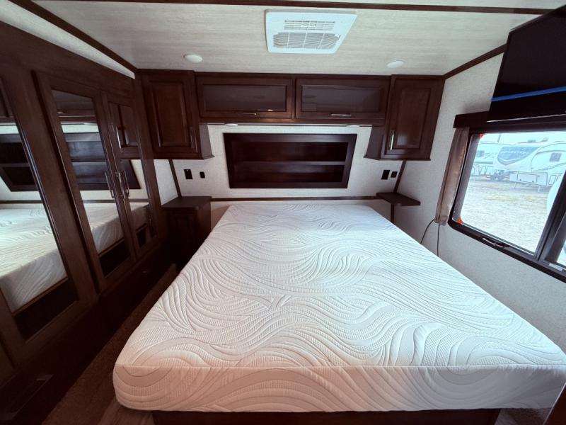 You will be extremely impressed by the amount of luxury found on the Dutchmen Voltage fifth wheel toy hauler! Some of the premium features that you will find on the Voltage are the Zero-Gravity ramp door that lets you access your toys with very little effort and the king-size bed which offers you extra space for sleeping comfortably. The Voltage also has industry-leading 7'-tall slides so that you can feel free to stretch your legs while inside. The ramp door patio system is certainly going to be an appealing factor because it provides you with an extra party space, and the dedicated heat ducts for the underbelly and the All-Weather Package with additional insulation will ensure that your Voltage is protected and prepared for all sorts of weather.